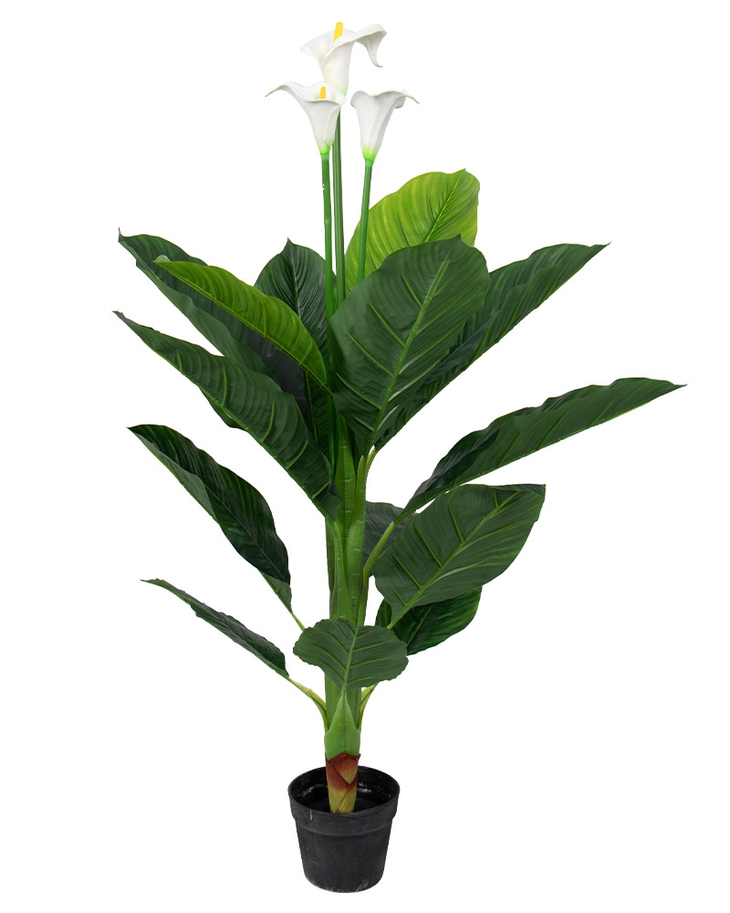 The plant is presented in a black pot, providing a striking contrast to its pristine white flowers and lush green foliage. This artificial Calla is the perfect choice for those wishing to introduce a hint of nature into their home, office, or event space without the demands of upkeep.
