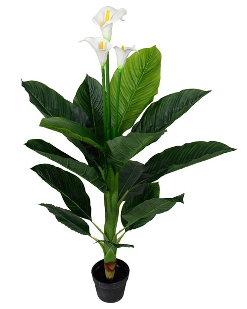 Experience the elegance of our artificial white Calla plant, an ideal enhancement for your living space. Featuring three realistic blossoms in full bloom, this plant, standing at 120 cm tall and 65 cm wide, serves as a splendid and full-bodied decoration for the home.