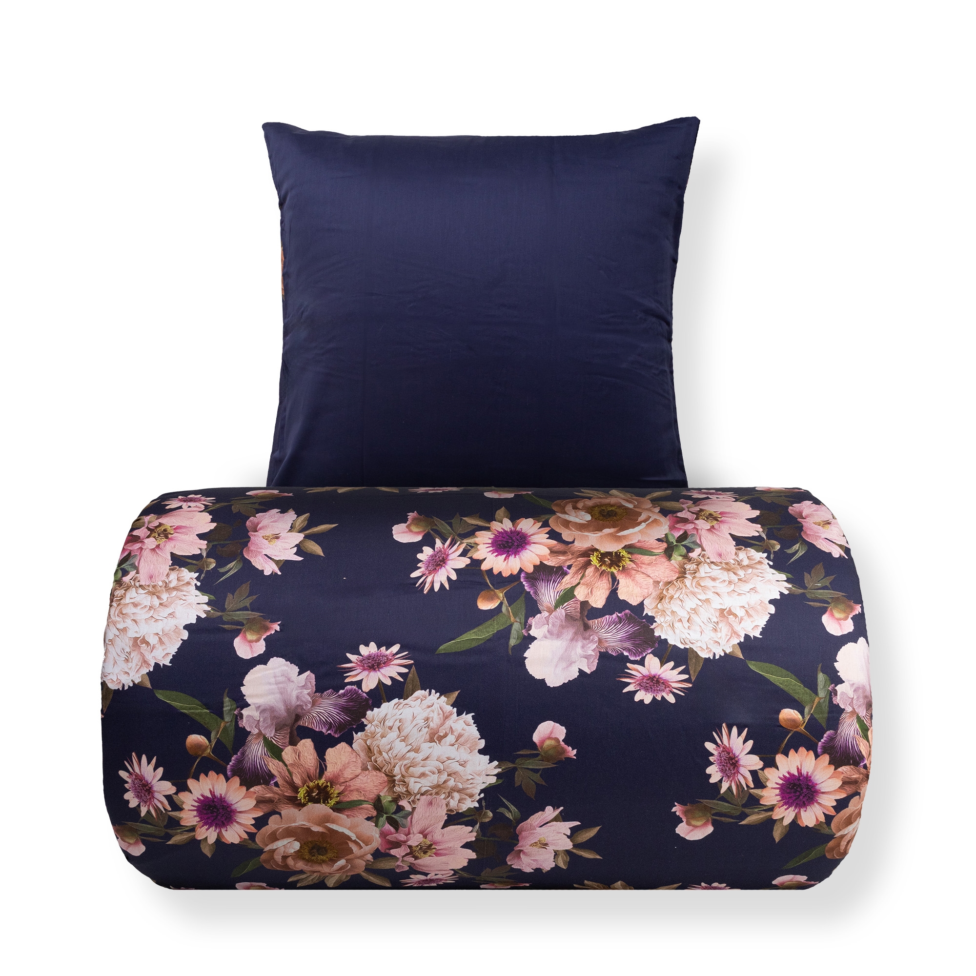 Create an elegant and personal expression in the bedroom with this reversible bedding set in 100% cotton satin. The bedding combines a beautiful dark blue floral print on one side with a calm, solid reverse, so you can easily change the look depending on mood and decor.
