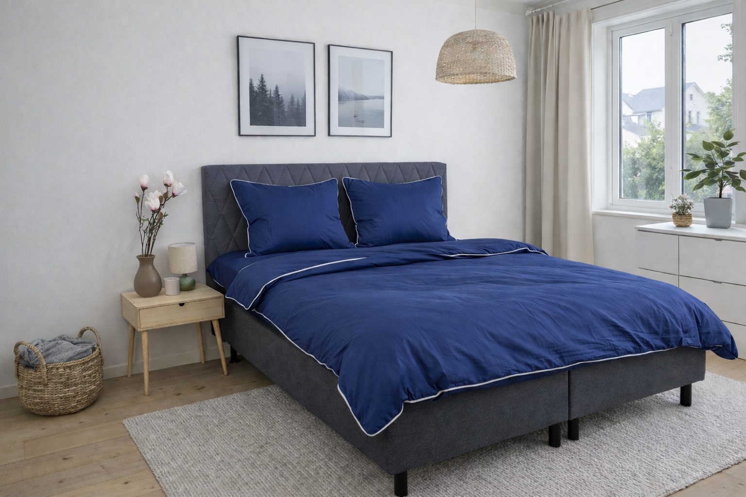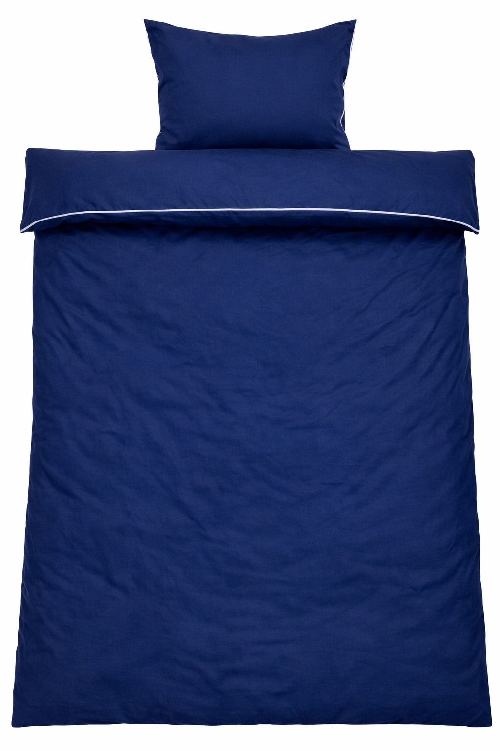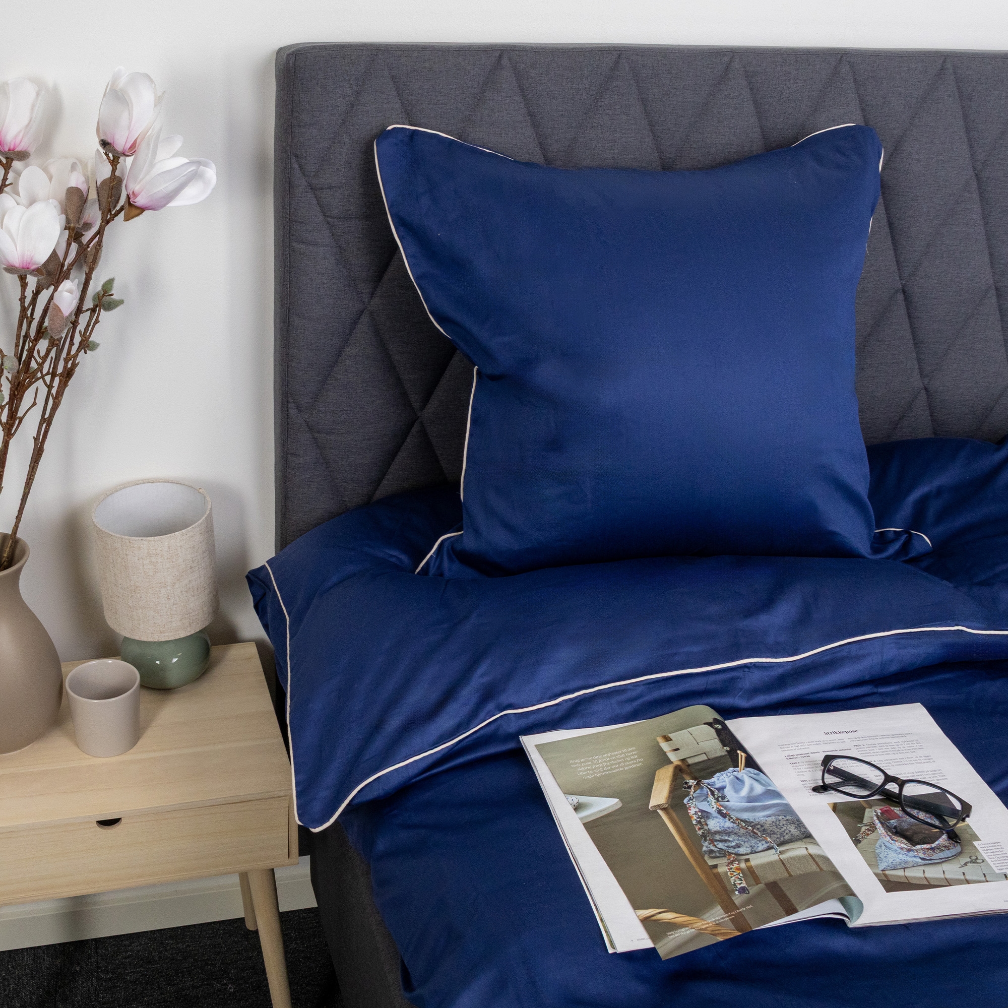 Create an elegant and luxurious look in the bedroom with this exclusive bedding set in 100% cotton satin with decorative piping trim from By Borg. The solid deep blue design combined with a white piping trim provides a clean and sophisticated look that elevates the overall impression of the bedroom.