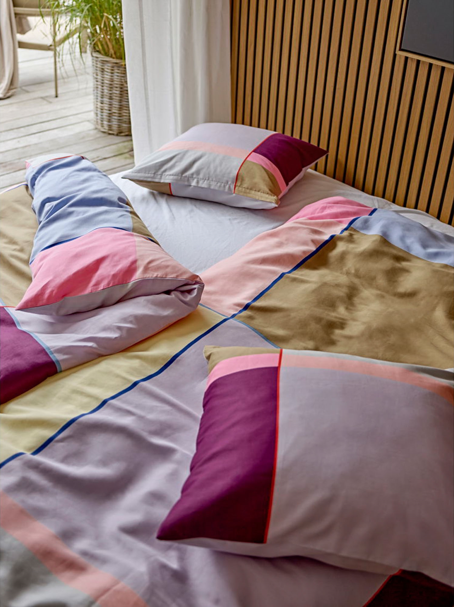 The satin-woven quality makes the bedding both breathable and temperature-regulating, so you sleep comfortably regardless of the season. The clean Colour Block design combines colours and shapes in a way that fits perfectly into modern interiors.