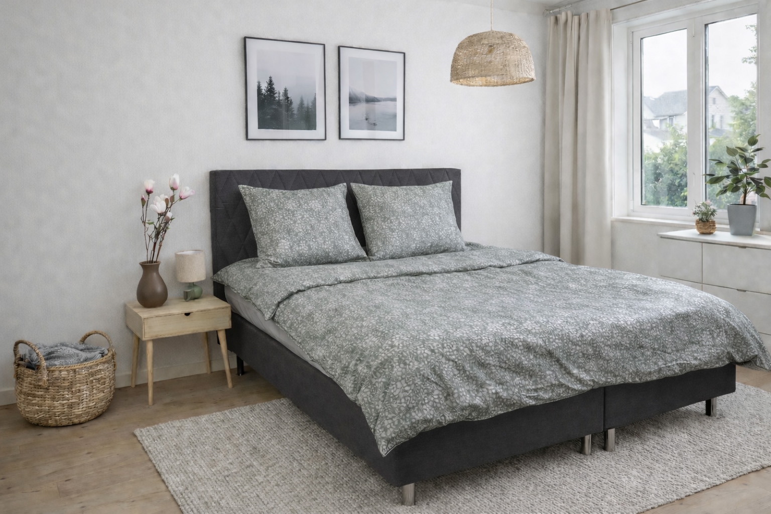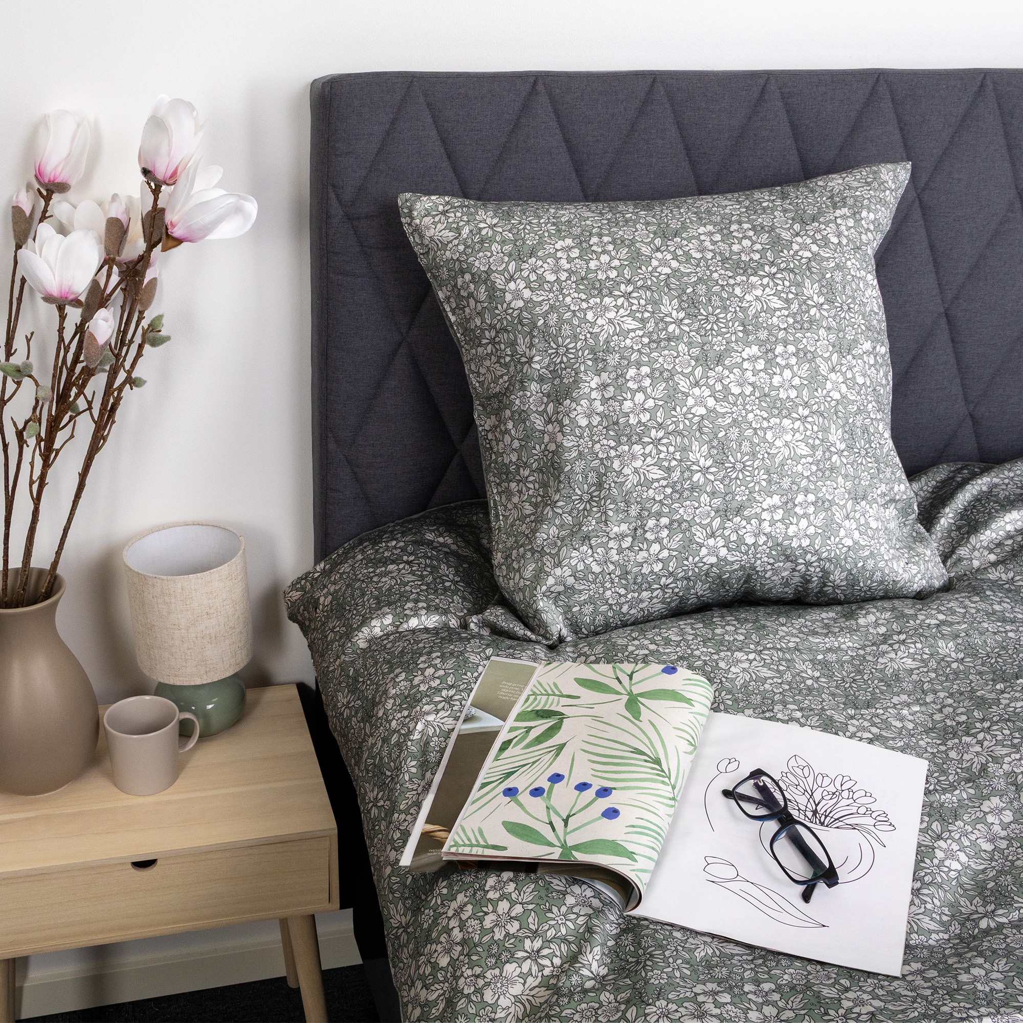 Home » Bedding » Single bedding » Single bedding 150x210 cm (Swedish size) Bed linen 150x210 cm - cotton satin - Dusty green floral print Save57% By Night 95,4940,99EURSave 55,- In stock Select size Select a variant Quantity Add to basket See more from: By Night Item number: 493-3 Read our bedding guide See our large selection of sheets See our large selection of duvets 150x210 Do you have questions about the product? Breathable natural material that provides high comfort year roundSoft and smooth surface that feels pleasant against the skinExcellent colourfastness that lasts wash after wash Duvet cover: 150x210 cm Pillowcase: 1 pc. á 50x60 cm Material: 100% fine cotton satin Weave: Extra fine 230TC satin weave (Thread count = number of threads per square inch) Colour: Dusty green Design: Small flower Brand: By Night Closure: Duvet and pillowcases with concealed YKK zipper Wash: 60° Tumble dry: Yes Ironing: Yes Certification: STANDARD 100 by OEKO-TEX® (11-47893). Your guarantee that the product is free from harmful chemicals. 100% cotton satin bedding - floral print Create an atmospheric and elegant ambience in the bedroom with this beautiful bedding set in 100% cotton satin. Cotton satin is known for its smooth, soft and comfortable surface that feels gentle against the skin. The extra fine satin weave with a thread density of 230TC gives the bed linen a subtle sheen, which also contributes to a comfortable night’s sleep. At the same time, cotton satin is a natural and breathable material that helps regulate temperature so you sleep comfortably all year round. The bed linen has high colour- and washfastness, which means the set retains its beautiful appearance wash after wash. The duvet and pillowcases close with a concealed zipper, ensuring a neat finish and keeping the duvet securely in place throughout the night. The bed linen is OEKO-TEX® certified according to STANDARD 100, which is your guarantee that the product has been tested and is free from harmful chemicals, so you can sleep safely and comfortably. This duvet cover is an ideal choice for those who want a soft, stylish and practical bedding set of high quality, where comfort and design go hand in hand. See all our cotton satin bedding here By Night By Night, which is produced by Borg Design, is characterised by Danish design - they provide you with comfortable sleep products of the highest quality. By Night produces bed linen and sheets for the whole family and places great emphasis on current trends, so production always includes fashionable colours and designs. See the full range from By Night here Return to Single bedding 150x210 cm (Swedish size) Customers also bought Bedding 150x210 cm - Cotton satin - Reversible light blue floral bedding In stock 122,4954,49EUR Add to basket Bedding made from 100% Egyptian cotton - 150x210 cm - Green bedding - Extra soft set from By Borg In stock 163,4981,99EUR Add to basket Down detergent for duvets and pillows In stock 10,99EUR Add to basket Bedding 150x210 cm - Cotton satin - Big Flower grey - Reversible floral print In stock 95,4940,99EUR Add to basket Bed linen 140x200 cm - cotton satin - Dusty green floral print In stock 81,9932,99EUR Add to basket Pillowcase 60x63 cm - Cotton satin - Dusty green floral print In stock 27,4910,99EUR Add to basket Pillowcase 60x63 cm - 100% cotton satin - Classic white stripes In stock 27,4913,99EUR Add to basket Bed linen 150x210 cm - 100% cotton satin - Classic dark gray stripes In stock 95,4934,49EUR Add to basket Peppa Pig bedding - 100% cotton - Children's bedding 140x200 cm - Peppa Pig and Frida Sheep in front of the house In stock 47,9920,49EUR Add to basket Topper fitted sheet 120x200x8 cm - Grey - 100% cotton satin - Sheet for mattress topper In stock 58,9924,49EUR Add to basket