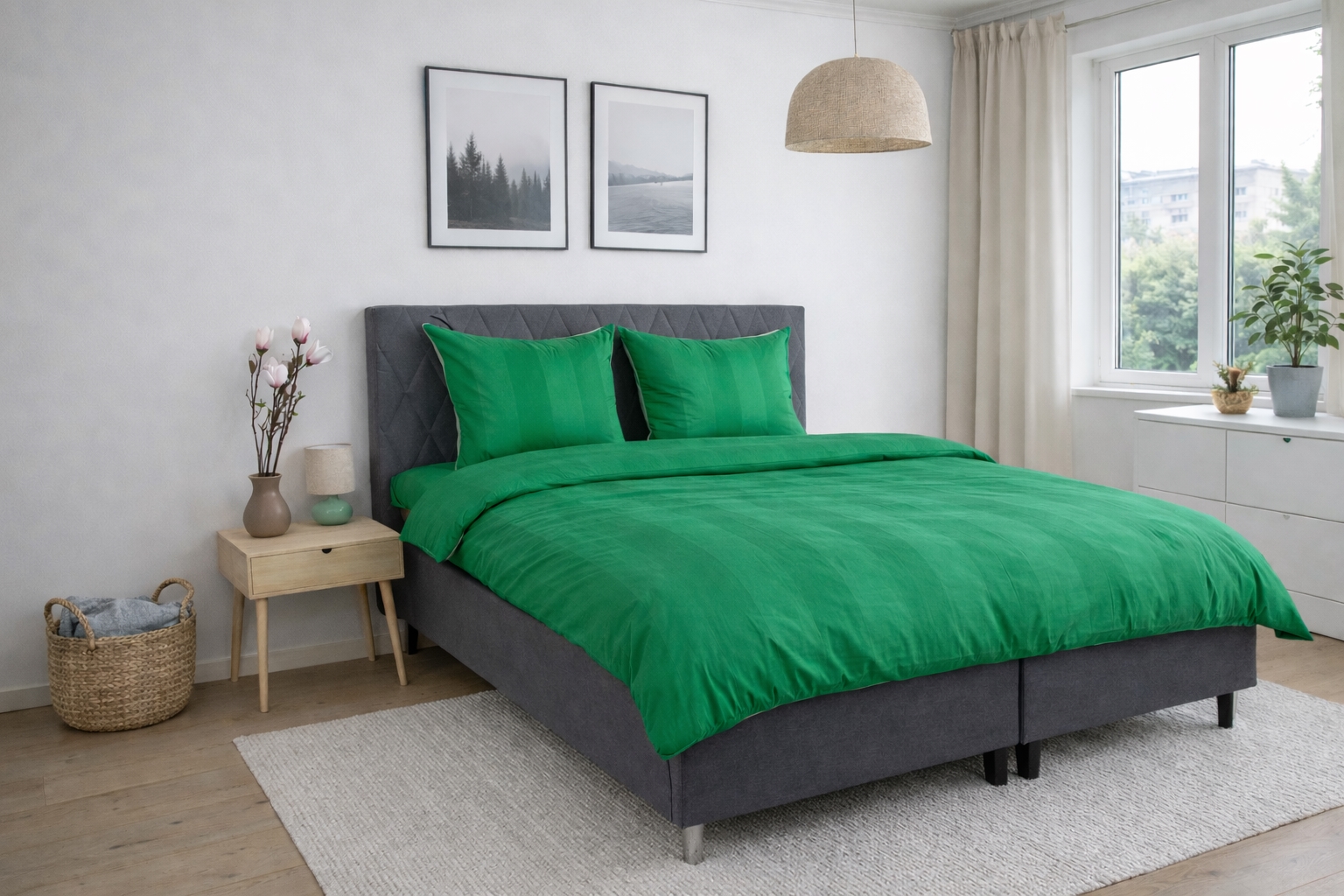 Home » Bedding » Single bedding » Single bedding 140x200 cm Bedding 140x200 cm - 100% cotton satin - Lone green - Striped, jacquard woven bedding - Extra soft bed set from By Borg Save60% By Borg 136,4954,49EURSave 82,- In stock Select size Select a variant Quantity Add to basket See more from: By Borg Item number: 814-1 Read our bedding guide See our large selection of sheets See our large selection of duvets 140x200 Do you have questions about the product? Super soft cotton satinJacquard woven striped designExtra tight weave - 300 TC Duvet cover: 140x200 cm Pillowcase: 1 pcs. á 60x63 cm Material: 100% cotton satin Weave: Fine jacquard weave - 300 TC (Thread count = number of threads per square inch) Color: Green Design: Wide jacquard woven stripes green Brand: Excellent By Borg Closure: Duvet and pillowcase with zipper Wash: 60° Tumble dry: Yes Ironing: Yes Certification: STANDARD 100 by OEKO-TEX® (M24LKFHY1 Hohenstein HTTI). Your guarantee that the product is free from harmful substances. Super soft bedding with jacquard woven stripes, made in 100% cotton satin in extra tight weave. The combination of the extra soft cotton satin and the dense jacquard woven design gives the bed set a special softness and comfort. The combination of material and woven wide stripes not only makes the bedding stylish in design, but also ensures that the bed set will retain its softness and shape wash after wash. This makes this type of bed linen very popular. The bedding is made in 100% cotton satin, with an extra tight and fine striped jacquard weave at 300 TC. This dense TC gives the bed set a unique and luxurious softness. The characteristic of this type of bed linen is precisely the extraordinary softness and the feeling of the strong material. The fine cotton satin which is jacquard woven of extra fine yarns and has a very tight weave of 300 TC, which indicates that there are no less than 300 fine threads woven together per square inch - and the higher the TC, the denser the weave. The combination of the high TC, fine cotton satin thread and the type of weaving method, makes the bed set not only incredibly nice to sleep with, but also has a high durability, breathability and absorption capacity. The bed set is 100% dyed, which means that the color during production binds in the cotton fibers and gives the bedding a high color fastness. This ensures that the material's color and design are preserved even after repeated washes. The bed set is closed with a hidden zipper in both duvet and pillowcase. Buy light pillowcase for your extra pillows here Take the opportunity to ensure increased sleeping comfort, by adding a new soft sheet of high quality. You will find our large assortment of quality sheets here Excellent By Borg with their Danish produced duvets and pillows, as well as fantastic bedding focus on comfort and sleep optimization. They know that the source of a good everyday life and high quality of life is connected with an optimal and good night's sleep. Therefore, they have made it easy for you to find the right sleep components that suit your needs. The products from Excellent By Borg give you extremely high quality and a thorough certification. Return to Single bedding 140x200 cm Customers also bought Bedding 140x200 cm - 100% cotton satin - Diana blue - Striped, jacquard woven bedding - Extra soft bed set from By Borg In stock 136,4954,49EUR Add to basket Bedding 140x200 cm - 100% cotton satin - Karen sand - Striped, jacquard woven bedding - Extra soft bed set from By Borg In stock 136,4954,49EUR Add to basket Pillowcase 60x63 cm - 100% cotton satin - Lone green - Striped, jacquard woven pillowcase - Extra soft pillowcase from By Borg In stock 34,4917,99EUR Add to basket Luxury bed linen - 140x200 cm - 100% Cotton satin bed linen - Daisy red - By Night jacquard woven bed set In stock 81,9934,49EUR Add to basket Bed linen 140x200 cm - 100% cotton satin - Rosenbloom - Green floral and striped print In stock 136,4954,49EUR Add to basket Bedding 140x200 cm - 100% cotton satin - Pink with light pink piping edge In stock 136,4954,49EUR Add to basket Bedding 140x200 cm - 100% cotton satin - Blue with white piping edge In stock 136,4954,49EUR Add to basket Bedding 140x200 cm - 100% cotton satin - Yellow with white piping edge In stock 136,4954,49EUR Add to basket Bedding 140x200 cm - 100% cotton satin - Iris - Green floral print In stock 136,4954,49EUR Add to basket Bed linen 140x200 cm - 100% cotton satin - Lana - Blue and light blue stripes In stock 136,4954,49EUR Add to basket