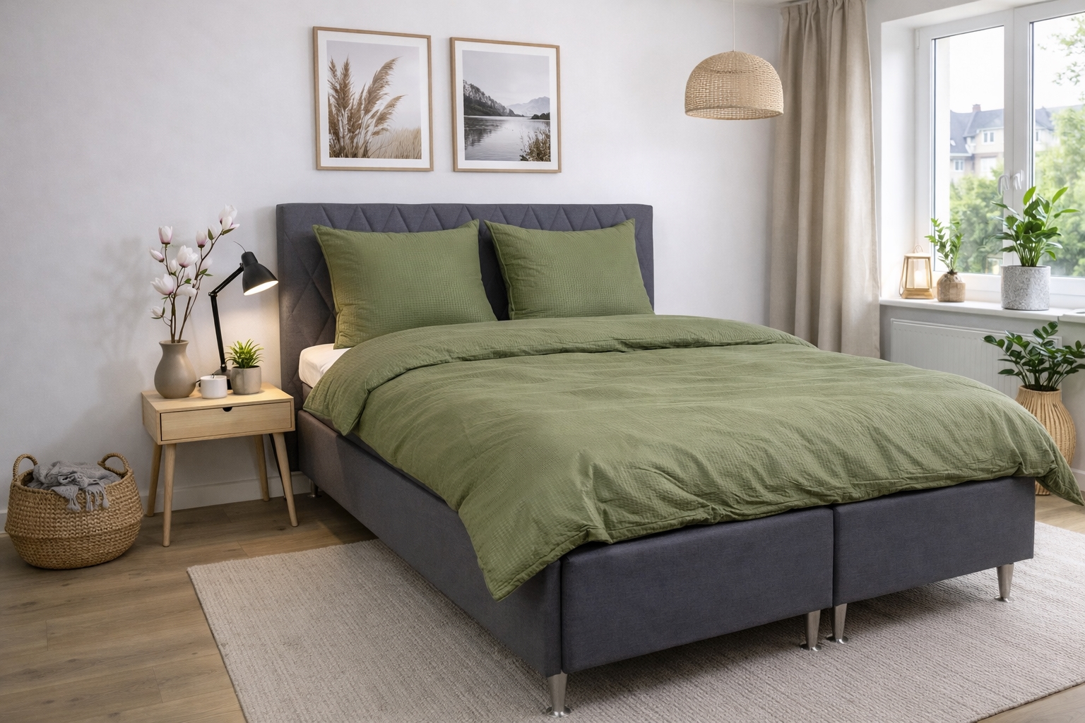 The solid green bedding adds calm and harmony to the bedroom and is easy to combine with both neutral and colorful sheets and pillows.