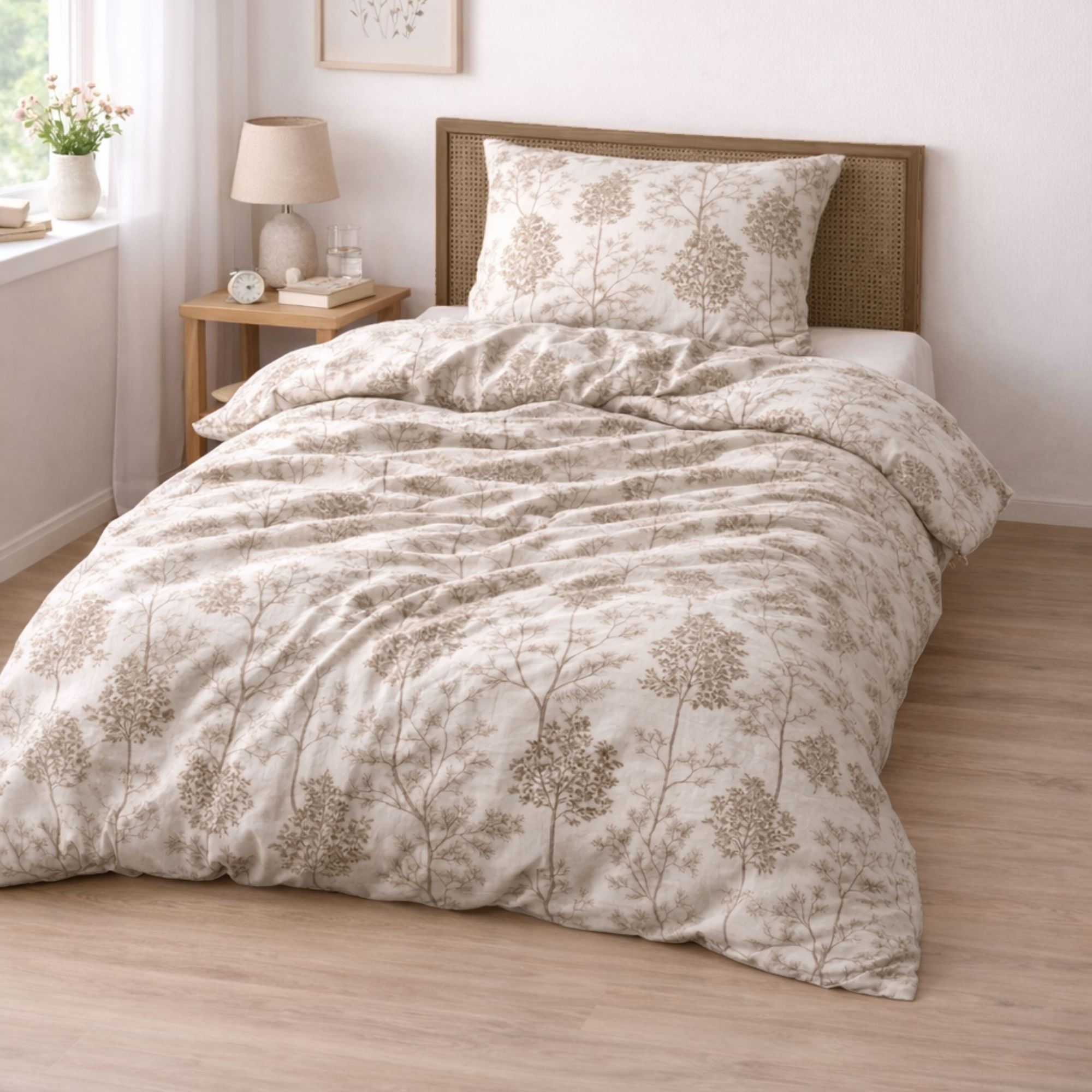 Home » Bedding » Single bedding » Single bedding 140x200 cm Bedding 140x200 cm - 100% cotton flannel - Høie of Scandinavia - Thea Valnød 100% Cotton Flannel Save30% Høie Of Scandinavia 68,4947,99EURSave 21,- In stock Select size Select a variant Quantity Add to basket See more from: Høie Of Scandinavia Item number: 8416-1 Read our bedding guide See our large selection of fitted sheets See our large selection of duvets 140x200 Do you have questions about the product? Warm and cosy bedding set that feels pleasant against the skinBreathable and soft material with high comfortIncredibly soft and fluffy surface Duvet cover: 140x200 cm Pillowcase: 1 pc. measuring 60x63 cm Material: 100% cotton flannel Weave: Extra fine 220TC (Thread count = number of threads per square inch) Colour: Brown Design: Thea Valnød Brand: Høie of Scandinavia Closure: Duvet cover with zipper, pillowcase with overlap Wash: 60°C Tumble dry: Yes Ironing: Yes Certification: EASY CARE treated, which means it does not wrinkle after washing. Certification: MADE IN GREEN by OEKO-TEX® (M2AMSZLH). Your guarantee that the product is free from harmful chemicals. Flannel bedding in cotton from Høie Make the bed extra inviting with this soft and warm bedding set in 100% cotton flannel. Flannel bedding is the obvious choice for those who feel cold at night and want extra comfort and warmth - especially on cool nights or during the winter months. Cotton flannel is made by brushing and napping the cotton fibres, which gives an incredibly soft, fluffy and warm surface. The napped structure creates small air pockets in the fabric that effectively help retain heat while the cotton retains its natural breathability. This provides a comfortable and balanced night’s sleep without feeling heavy or damp. This flannel bedding has a thread count of 220TC, ensuring a good balance between durability, comfort and softness. The material is suitable for those who often feel cold at night or who want extra warm bedding in the cold months. The bedding is MADE IN GREEN by OEKO-TEX® certified, which is your guarantee that the product is free from harmful chemicals. It is also Easy Care treated, which ensures less wrinkling and better shape after washing. Easy Care makes your bedding extra soft and easy to iron. Cotton satin bedding is therefore an obvious choice for those who want extra comfort and a hotel-like feel at home, while still having a natural material that is easy to care for and comfortable to sleep in. See all our flannel bedding here Høie Of Scandinavia Høie of Scandinavia is a well-known Scandinavian textile brand that has a long history since 1850, especially within bedding, duvets and pillows. Høie is known for high quality, timeless design and comfort - reflected in their Nordic style and functionality. Høie combines traditional craftsmanship with modern production and materials to create products that are both pleasant to sleep in and durable in everyday life. See the full range of Høie here Return to Single bedding 140x200 cm Customers also bought Flower bedding - 100% cotton - Junior bedding 100x140 cm - Light pink with flowers In stock 27,4917,99EUR Add to basket Bedding 140x200 cm - Stonewashed - Firm petrol In stock 68,4927,49EUR Add to basket Bedding 140x200 cm - Stonewashed - Firm brown Few in stock 68,4927,49EUR Add to basket Bedding 140x200 cm - Cotton flannel bedding - White with pink flowers In stock 68,4934,49EUR Add to basket Bed linen 140x200 cm - 100% cotton satin - Classic olive-striped In stock 81,9927,49EUR Add to basket Bedding 140x200 cm - 100% Cotton - Zodiac blue - Reversible with stars In stock 68,4923,49EUR Add to basket Digitally printed bedding Bedding 140x200 cm - 100% Cotton Satin - Reversible Dusty Green Marble Design In stock 108,9940,99EUR Add to basket 2 x Pillowcases Double duvet cover 240x220 cm - Cotton satin - Big Flower sand - Reversible floral print In stock 163,4968,49EUR Add to basket Pillowcase 60x63 cm - Seersucker bedding - Microfiber - White crepe In stock 12,495,49EUR Add to basket Wool throw - Soft wool throw - Lines grey - 130x200 cm - Nordstrand Home In stock 108,9947,99EUR Add to basket