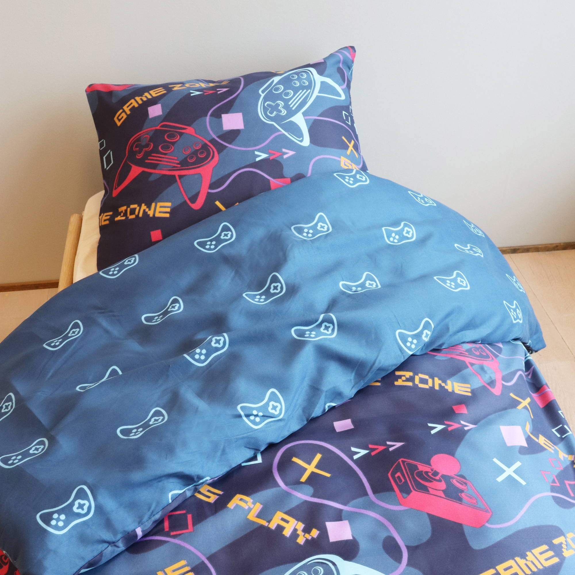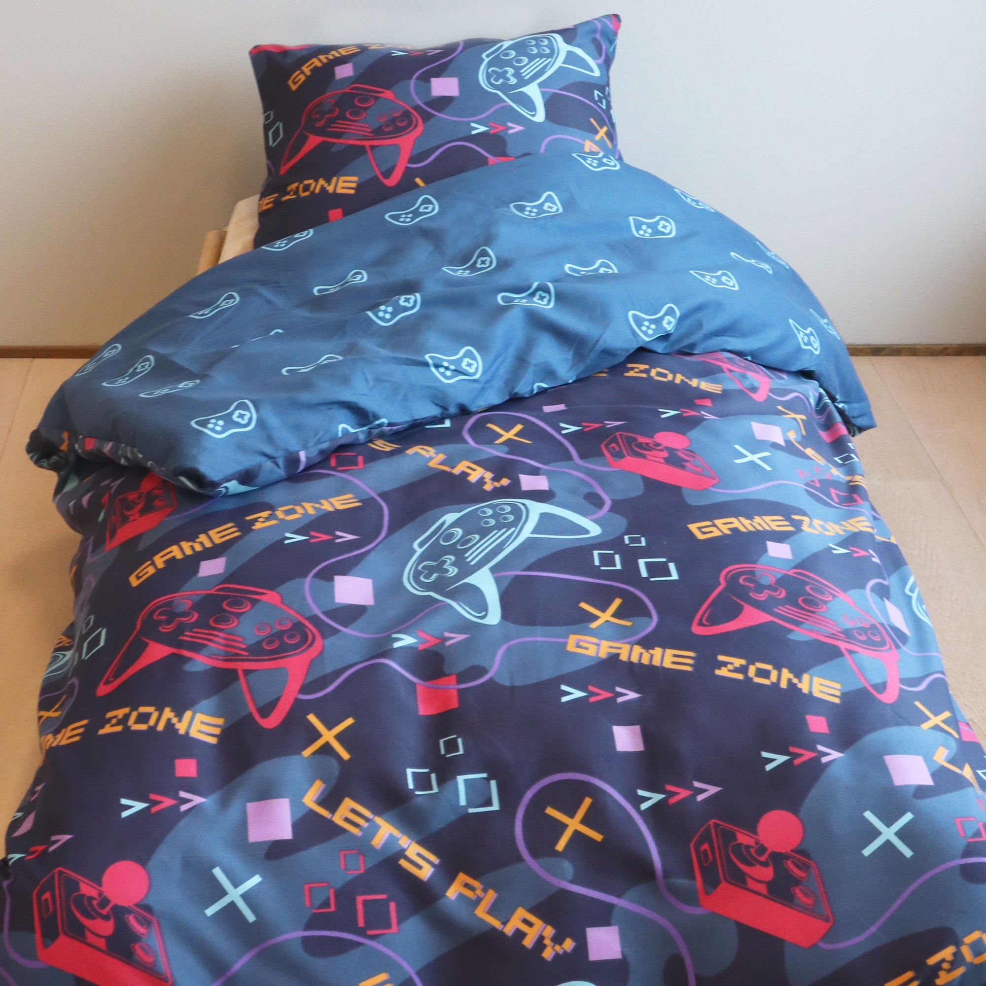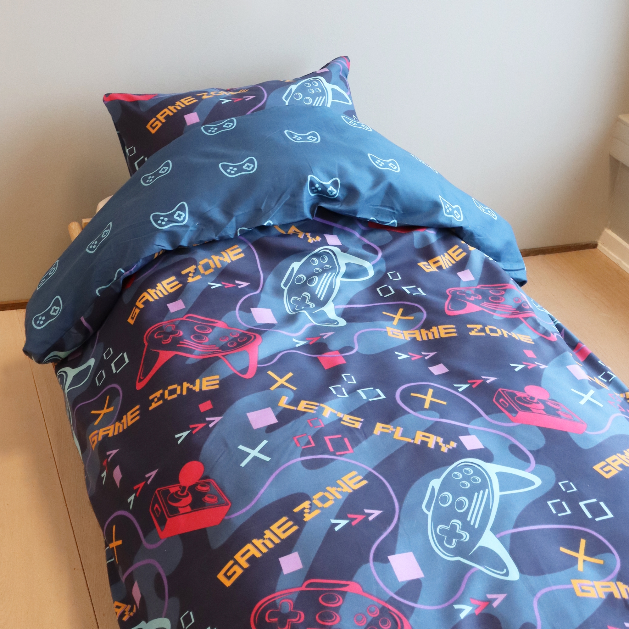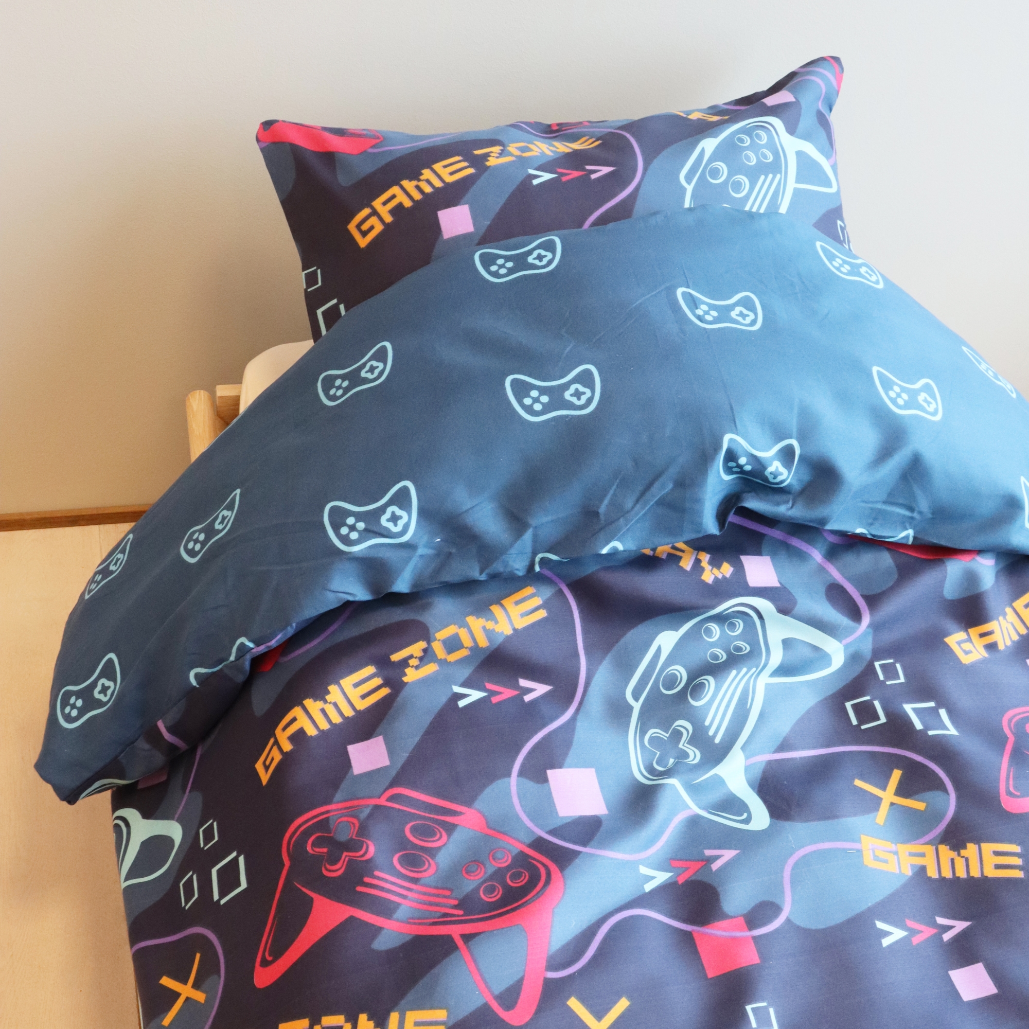 The duvet cover closes with buttons and the pillowcase has an overlap, which ensures the duvet and pillow stay in place and makes it easy to change the bedding. The set is reversible: the front shows many gamer motifs. If you turn the set over there is a controller motif that gives a more subdued look.