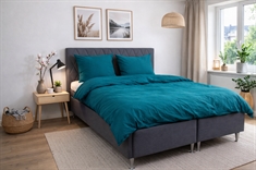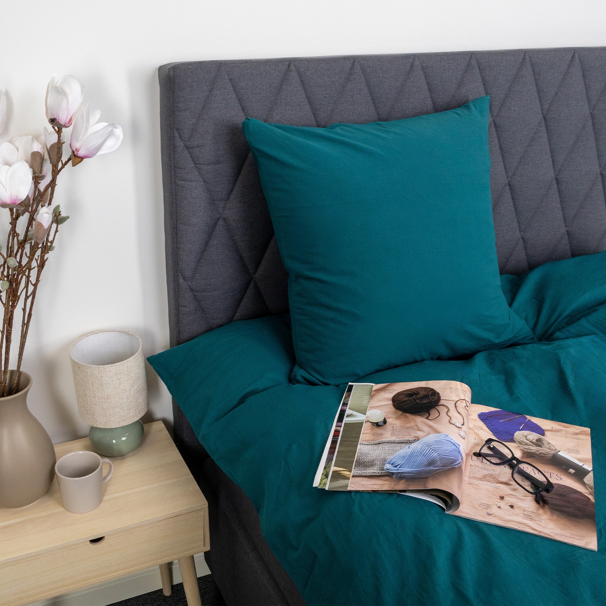The duvet and pillowcases are closed with an internal concealed zipper, which gives a clean look and makes it easy to change the bedding. The blue-green shade and the plain design make the set easy to combine with both light and dark elements in the bedroom.