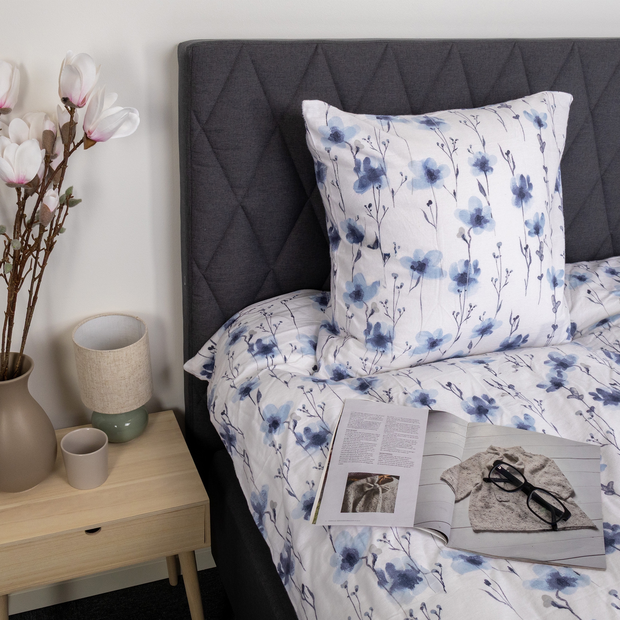 Home » Bedding » Single bedding » Single bedding 150x210 cm (Swedish size) Bedding 150x210 cm - Cotton flannel bedding - White with blue flowers Save50% By Night 81,9940,99EURSave 41,- In stock Select size Select a variant Quantity Add to basket See more from: By Night Item number: 260-3 Read our bedding guide See our wide selection of fitted sheets See our wide selection of duvets 150x210 Do you have questions about the product? Warm and cozy bedding set that feels comfortable against the skinBreathable and soft material with high comfortIncredibly soft and plush surface Duvet cover: 150x210 cm Pillowcase: 1 pc. à 50x60 cm Material: 100% cotton flannel Weave: 200TC (Thread count = number of threads per square inch) Color: White with blue flowers Design: Flower Blue Brand: By Night Closure: Duvet and pillowcase with internal zipper Wash: 60°C Tumble drying: Yes Ironing: Yes Certification: STANDARD 100 by OEKO-TEX® (20182KO658). Your guarantee that the product is free from harmful chemicals. Cotton flannel bedding with flowers - extra soft and warm Create a cozy and inviting atmosphere in the bedroom with this floral flannel bedding in white with blue details. The soft cotton flannel provides a warm and comfortable feel - perfect for chilly nights. The bedding is made from 100% cotton flannel with a dense 200TC weave. Flannel is characterized by cotton fibers that are brushed on the surface. This treatment creates the well-known, plush soft texture that makes flannel bedding extra pleasant to lie under. The brushed surface traps heat closer to the body and gives a lovely warm feeling without the material losing its natural breathability. Cotton flannel is therefore an obvious choice if you often feel cold at night or want warmer bedding during the autumn and winter months. At the same time, the material is durable and stays soft wash after wash. The floral design combines beautiful blue flowers with a light background, creating a calm and harmonious expression in the bedroom. A floral bedding that feels warm and looks elegant. The duvet and pillowcase close with an internal zipper, which provides a neat and practical finish. The bedding is certified according to STANDARD 100 by OEKO-TEX, which is your guarantee that the product has been tested and is free from harmful chemicals. It can be washed at 60 degrees and tolerates both tumble drying and ironing. See all our flannel bedding here By Night By Night, produced by Borg Design, is characterized by Danish design - they provide comfortable products for your sleep in the highest quality. By Night produces bed linen and sheets for the whole family and places great emphasis on current trends, so production always involves fashionable colors and designs. See the full range from By Night here Return to Single bedding 150x210 cm (Swedish size) Customers also bought Bedding 150x210 cm - cotton satin - White floral print In stock 95,4940,99EUR Add to basket Floral bedding 150x210 cm - 100% Soft cotton satin - Sand color - By Night bedding set - Summer Flower In stock 95,4940,99EUR Add to basket Bedding 100% Cotton - 140x200 cm - White Bedding Set with Fine Red Hearts - Nordstrand Home Soft Duvet Cover In stock 54,4927,49EUR Add to basket Bedding 140x200 cm - Cotton flannel bedding - White with pink flowers In stock 68,4934,49EUR Add to basket Bedding 150x210 cm - Cotton flannel bedding - White with pink flowers In stock 81,9940,99EUR Add to basket Bedding 150x210 cm - Cotton flannel bedding - Black and white checks In stock 81,9940,99EUR Add to basket Bedding 150x210 cm - Cotton satin - Reversible pink floral bedding In stock 122,4954,49EUR Add to basket Bedding 150x210 cm - Cotton satin - Reversible pink floral bedding In stock 122,4954,49EUR Add to basket Bedding 150x210 cm - Cotton satin - Reversible light blue floral bedding In stock 122,4954,49EUR Add to basket Bedding 150x210 cm - Seersucker bedding - 100% cotton crepe - Reversible with green stripes In stock 81,9940,99EUR Add to basket