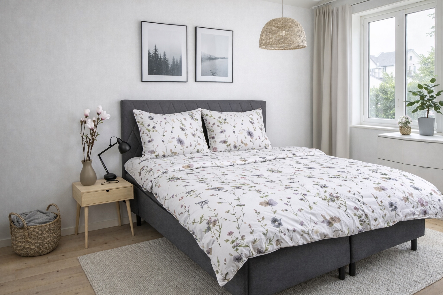 Home » Bedding » Single bedding » Single bedding 150x210 cm (Swedish size) Bedding 150x210 cm - Reversible design in 100% cotton satin - Corn Flower white - Bedding set from By Night Save57% By Night 95,4940,99EURSave 55,- In stock Select size Select a variant Quantity Add to basket See more from: By Night Item number: 504-3 Read our bedding guide See our extensive selection of sheets Explore our wide range of duvets 150x210 Do you have questions about the product? Quality beddingExtra fine satin weaveSoft and glossy Duvet cover: 150x210 cm Pillowcase: 1 piece 50x60 cm Material: 100% fine cotton satin Weaving: Extra fine 240TC satin weave (Thread count = number of threads per square inch) Colour: White Design: Corn Flower Reversible: - Front: Floral print - Back: Solid colour Brand: By Night Closure: Duvet and pillowcase with concealed YKK zips Washing: 60° Tumble drying: Yes Ironing: Yes Certification: STANDARD 100 by OEKO-TEX® (2018OK0658) The bed set in 100% tightly woven cotton satin. This bed set from By Night is renowned for its beautiful and smooth surface, providing a lovely, soft feel against the skin. The beauty of cotton satin is its breathability, keeping you comfortably cool in summer and warm in winter, making the bedding practical for all seasons. Moreover, the bed linen is 100% dyed through, meaning the colour is embedded in the cotton fibres during production. This results in incredibly high colour and wash fastness. The bed set is OEKO-TEX® certified. The certification ensures the product is free from harmful substances and is manufactured under proper conditions, allowing you to sleep safely at night while we also take good care of the environment. Reversible design: The bedding features a reversible design, meaning both sides are patterned or coloured. A reversible bed set allows you to change the appearance by flipping it over, and offers the chance to coordinate with various decorations or colours in your bedroom. Reversible design - for more flexible interior design! This bedding set is a favourite for those seeking luxurious bed linen with a beautiful and stylish appearance. The duvet and pillowcases feature a concealed YKK zip closure. Easily purchase matching pillowcases for your additional pillows here Refresh your bed and bedroom with stunning and exquisite bedding like this. Simultaneously, take advantage of the opportunity to ensure maximum sleeping comfort by adding a new, soft, high-quality sheet. Discover our extensive range of quality sheets here By Night is distinguished by Danish design, providing you with comfortable components for your nighttime environment of the utmost quality. By Night offers bedding and sheets for the entire family, emphasizing contemporary trends to ensure the range always includes fashionable colours and designs. Return to Single bedding 150x210 cm (Swedish size) Customers also bought Pillowcase 60x63 cm - Reversible design in 100% cotton satin - Corn Flower white - From By Night In stock 27,4910,99EUR Add to basket Bedding 150x210 cm - cotton satin - White floral print In stock 95,4940,99EUR Add to basket Bedding 140x200 cm - Reversible design in 100% cotton satin - Big Flower green - Bed set from By Night In stock 81,9931,49EUR Add to basket Bedding set 150x210 cm - Reversible design in 100% cotton satin - Big Flower Green - Set from By Night In stock 95,4940,99EUR Add to basket Cushion cover 60x63 cm - Reversible design in 100% cotton satin - Big Flower green - From By Night In stock 27,4910,99EUR Add to basket Bedding 150x210 cm - Seersucker bedding - 100% cotton crepe - Sand solid color In stock 95,4940,99EUR Add to basket Topper fitted sheet 180x200x8 cm - 100% Organic cotton satin - White - GOTS certified sheet for mattress topper In stock 88,4947,99EUR Add to basket Ball fibre - 60x63 cm - Pillow - Medium - Zen Sleep pillow with fibre filling In stock 13,998,49EUR Add to basket Multi pillow - 50x150 cm - Fibre pillow - Microfibre pillow - Borg Living In stock 81,9947,99EUR Add to basket Bedding 150 x 210 cm - 100% cotton satin - Classic white stripes In stock 95,4934,49EUR Add to basket