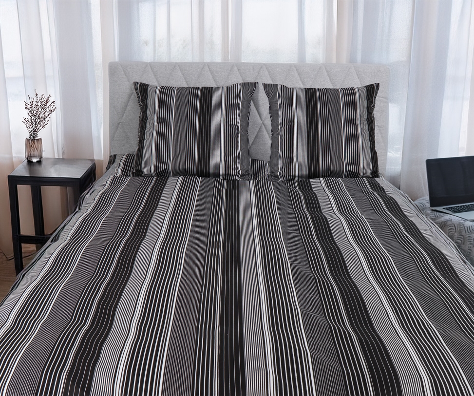 Home » Bedding » Double bedding » Double bedding 200x200 cm Bedding for double duvet 200x200 cm - Stripe black bedding set - In Style bed linen in microfibre 2 x PillowcasesSave51% In Style 50,4924,49EURSave 26,- In stock Quantity Add to basket See more from: In Style Item number: 601-4 Read our bedding guide See our extensive selection of sheets Explore our extensive range of 200x200 duvets Do you have questions about the product? Bedding with high colour fastnessEasy and practical zip closureSoft and glossy Duvet cover: 200x200 cm Pillowcase: 2 pieces 60x63 cm Material: Microfibre Weaving: 150TC (Thread count = number of threads per square inch) Colour: Black Design: Stripes Brand: IN Style Closure: Duvet and pillowcase with internal zip Washing: 30° Tumble drying: Yes, at low temperature Ironing: No Certification: STANDARD 100 by OEKO-TEX® (2018OK0249) The bedding features a stylish and decorative design with high colour retention. This bedding, with its glossy surface, is not only soft and comfortable but also incredibly durable, lightweight, and quick-drying. With two sides of the same design in varying shades, you can introduce variety into your bedroom decor, adding a modern and stylish flair. Both duvet and pillowcase feature a practical zip closure, making bed-making easy and chic. Purchase light pillowcases for your additional pillows here IN Style offers a broad selection of both bedding and sheets. IN Style bedding is produced by Danish Borg Living, a company established in 2013. Borg Living is renowned for their innovation in quality and design. Refresh both your bed and bedroom with this stylish bedding set. Simultaneously, seize the opportunity to ensure maximum sleeping comfort by incorporating a new, soft, high-quality sheet. Discover our extensive range of quality sheets here IN Style boasts an array of fantastic microfibre bedding sets, along with light and airy fibre summer duvets. IN Style is crafted by Borg Living, a brand established in 2013 known for their innovation in both quality and design, ensuring the best conditions for a restful night's sleep. Return to Double bedding 200x200 cm Customers also bought Junior weighted blanket - 100x140 cm - 2 kg junior weighted duvet with glass beads - Zen Sleep junior duvet In stock 122,4940,99EUR Add to basket Mattress topper - 180x200 cm, 5 cm high - NASA Memory Foam - Borg Living - Ergonomic mattress topper In stock 544,49190,49EUR Add to basket Storage Jar - Stone - Borås Cotton - Hamam - 13x9 cm In stock 27,4913,99EUR Add to basket Paw Patrol junior bedding 100x140 cm - Marshall, Chase and Rubble - 100% cotton In stock 40,9919,49EUR Add to basket Purple Unicorn Towel - 70x140 cm - 100% Cotton - Soft Bath Towel with a Unicorn and Stars In stock 27,4913,99EUR Add to basket Baby bedding - 100% soft cotton - Bedding set for baby 70x100 cm - Dinosaur bedding In stock 20,4910,99EUR Add to basket Baby bedding - 100% soft cotton - Bedding set for baby 70x100 cm - Bedding with animals In stock 20,4910,99EUR Add to basket Baby bedding - 100% soft cotton - Bedding set for baby 70x100 cm - Bedding with construction vehicles In stock 20,4910,99EUR Add to basket Junior Unicorn Bedding 100x140 cm - Bedding with Unicorn - 2 in 1 Design - 100% Cotton Bed Linen In stock 47,9920,49EUR Add to basket Dinosaur bedding 140x200 cm - 2 in 1 design - Green bedding - Duvet cover in 100% cotton In stock 47,9927,49EUR Add to basket