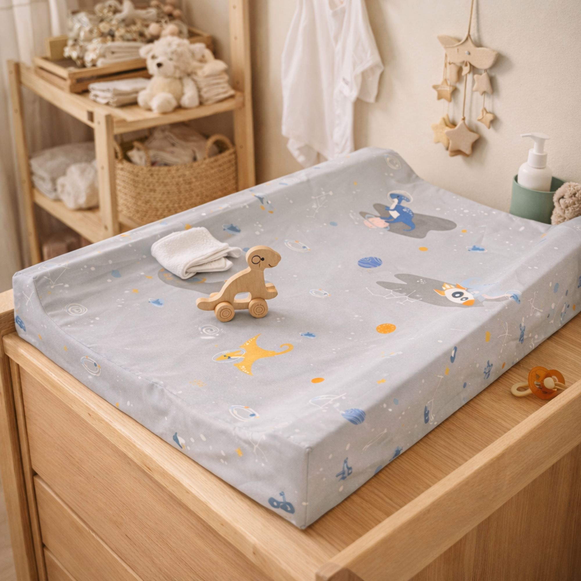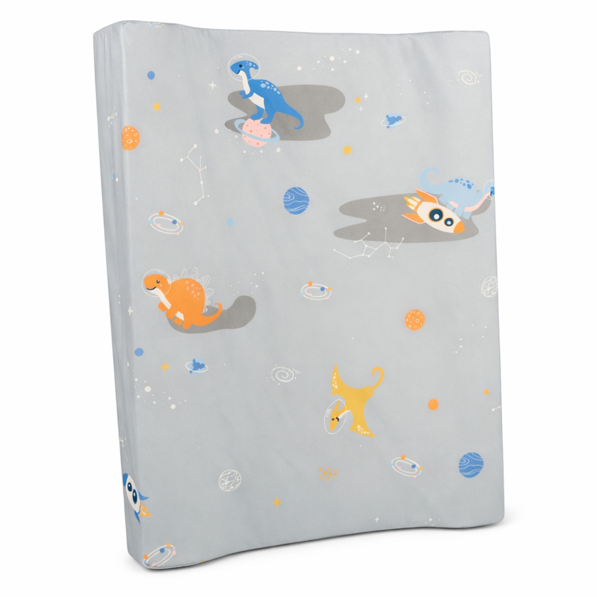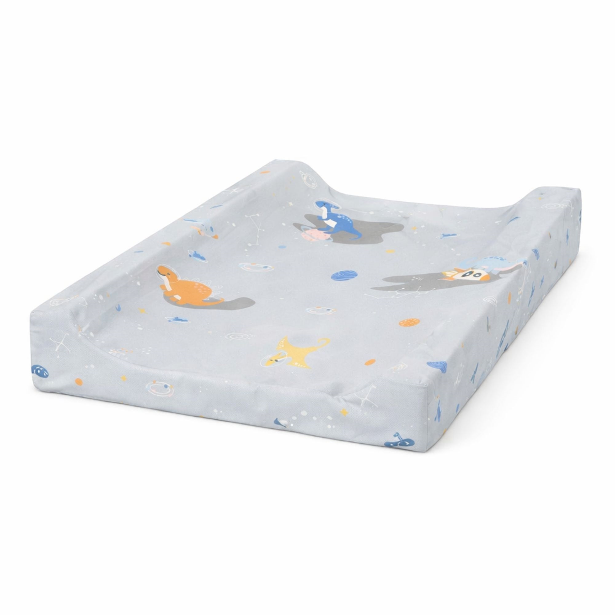 Create a safe and comfortable changing area with this changing pad from Nordstrand Home in a neat gray design with a space dinosaur. The changing pad measures 65x50 cm and fits most changing tables and dressers. The raised edges of 9 cm and the 4 cm-thick middle provide extra support and help keep the child safely positioned during the entire changing time.