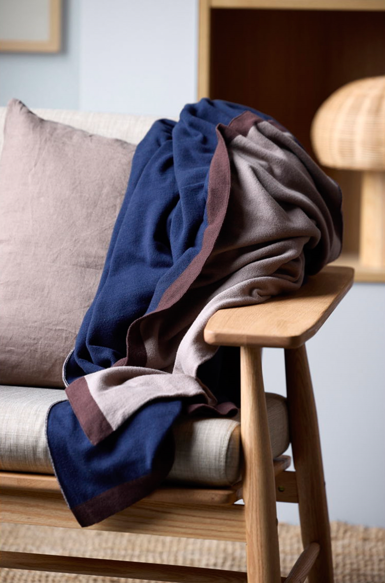 The special double-face knitting technique creates an elegant interplay between front and back, resulting in a smooth surface and a soft, exclusive look. The harmonious color combinations in navy blue tones add life and personality to your interior.