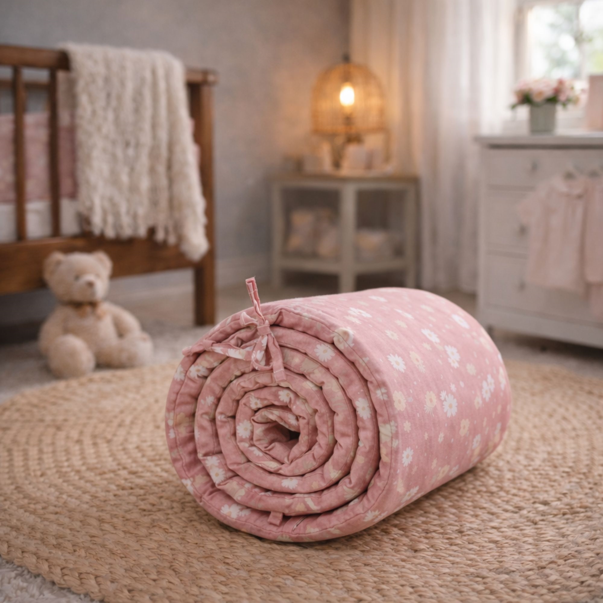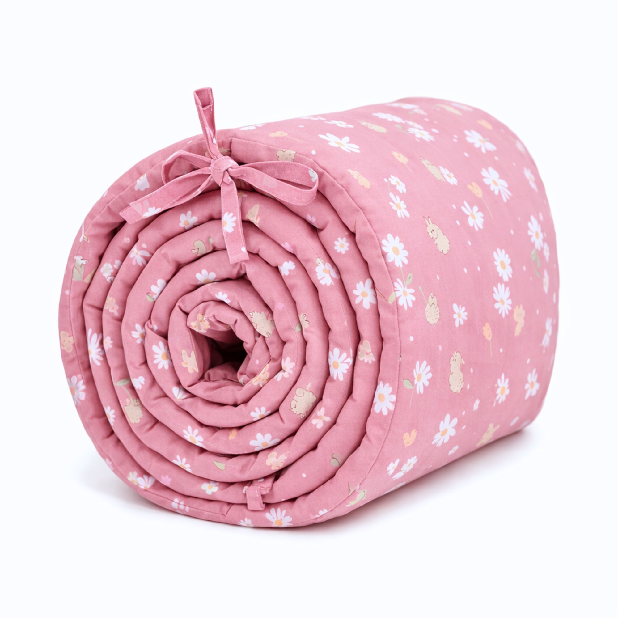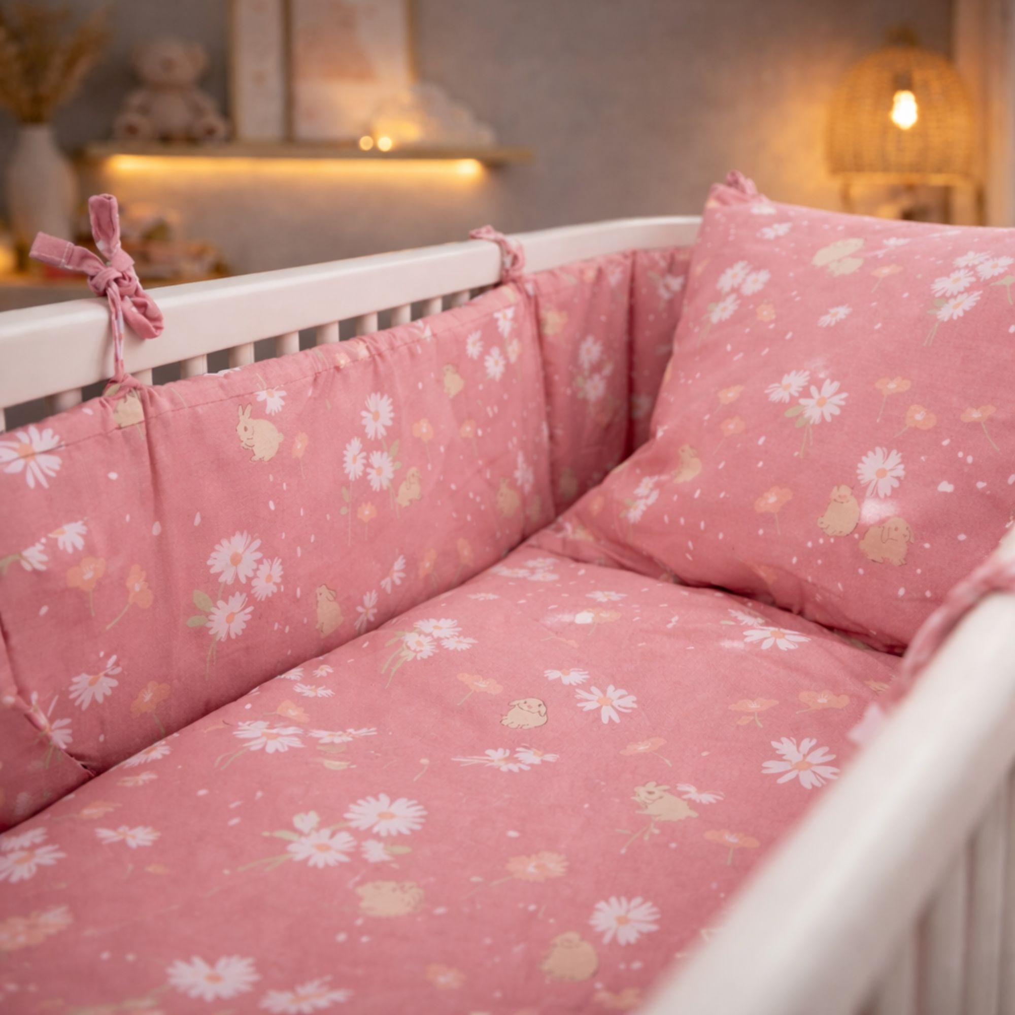The cover is made from 100% soft cotton, which feels pleasant and natural against the child's skin. The delicate pink design with rabbits and flowers gives a sweet and calming look to the nursery.