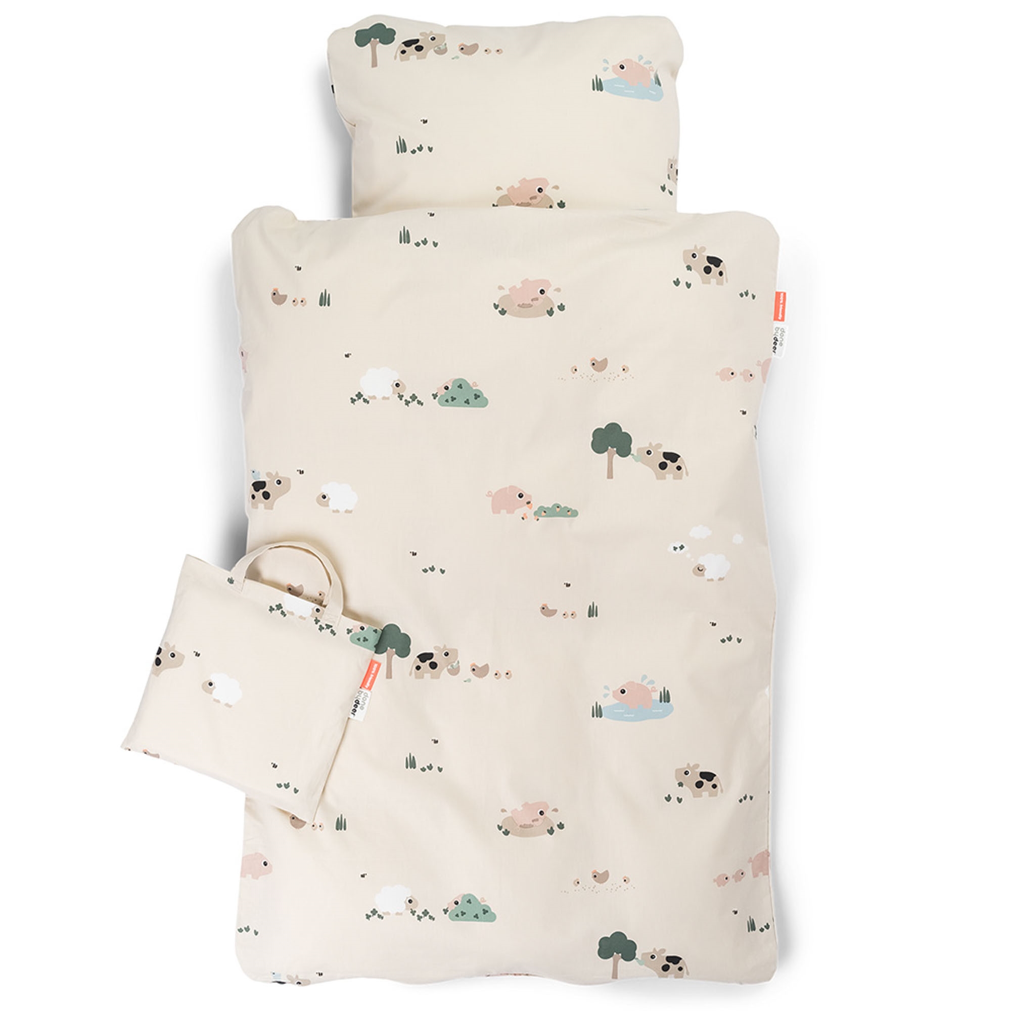 Home » Bedding » Children's bedding » Junior bedding 100x140 cm Done By Deer bedding - 100% cotton - Junior bedding 100x140 cm - Tiny Farm - Sand Done By Deer Great price:54,49EUR In stock Quantity Add to basket See more from: Done By Deer Item number: 2053969-8 Read our bedding guide See our large selection of sheets See our large selection of duvets 100x140 Do you have questions about the product? Breathable material that ensures a comfortable temperatureSoft and comfortable surface against the child's skinPractical zipper closure that makes it easy to change the bedding Duvet cover: 100x140 cm - junior bedding set Pillowcase: 40x45 cm Material: 100% cotton Color: Sand Series: Tiny Farm Brand: Done By Deer Closure: Duvet and pillowcase with zipper Wash: 60°C Tumble dry: Yes Ironable: Yes Certification: STANDARD 100 by OEKO-TEX® (15.HTR.57912). Your guarantee that the product is free from harmful chemicals. Junior cotton bedding from Done By Deer Make bedtime a safe and cozy experience with this lovely junior bedding set from Done by Deer in the sweet Tiny Farm design. The set consists of a duvet cover sized 100x140 cm and a pillowcase 40x45 cm - perfect for the junior bed. The bedding is made of 100% soft cotton and is OEKO-TEX® certified, which means it is free from harmful chemicals and gentle on the child's skin. The soft quality ensures high comfort and a pleasant night's sleep. The delicate sand-coloured design with the cute farm animals - Dotti, Pigee and Sheepy - creates a calm and cozy atmosphere in the children's room. The motifs give a playful expression that makes it extra nice to snuggle under the duvet. The duvet and pillowcase close with a practical YKK zipper, which keeps the duvet securely in place and makes it easy to change the bedding. The set is also delivered in a matching fabric bag that can be used for storage of toys or small items. See all junior bedding here Done by Deer Done by Deer is a Danish brand that combines Scandinavian design with functional solutions for babies and children. The brand is known for its clean products in soft colours and playful motifs, which fit perfectly into modern homes. The range spans from tableware, lunch boxes and storage to textiles, toys and interior. Done by Deer places great emphasis on quality and safety. The products are made from materials that comply with applicable standards for food safety and children's products, so you can use them safely in everyday life. See the full range from Done By Deer here. Return to Junior bedding 100x140 cm