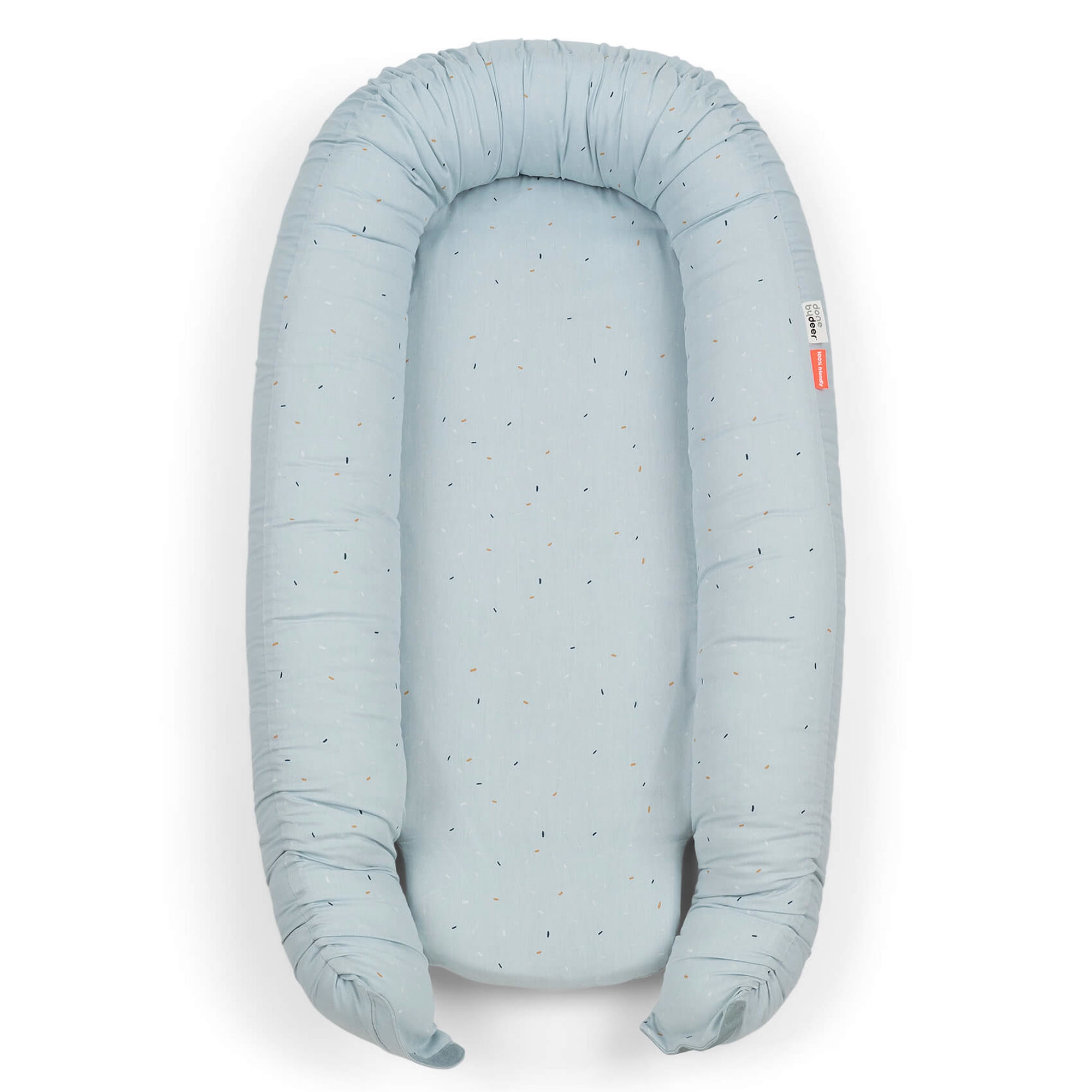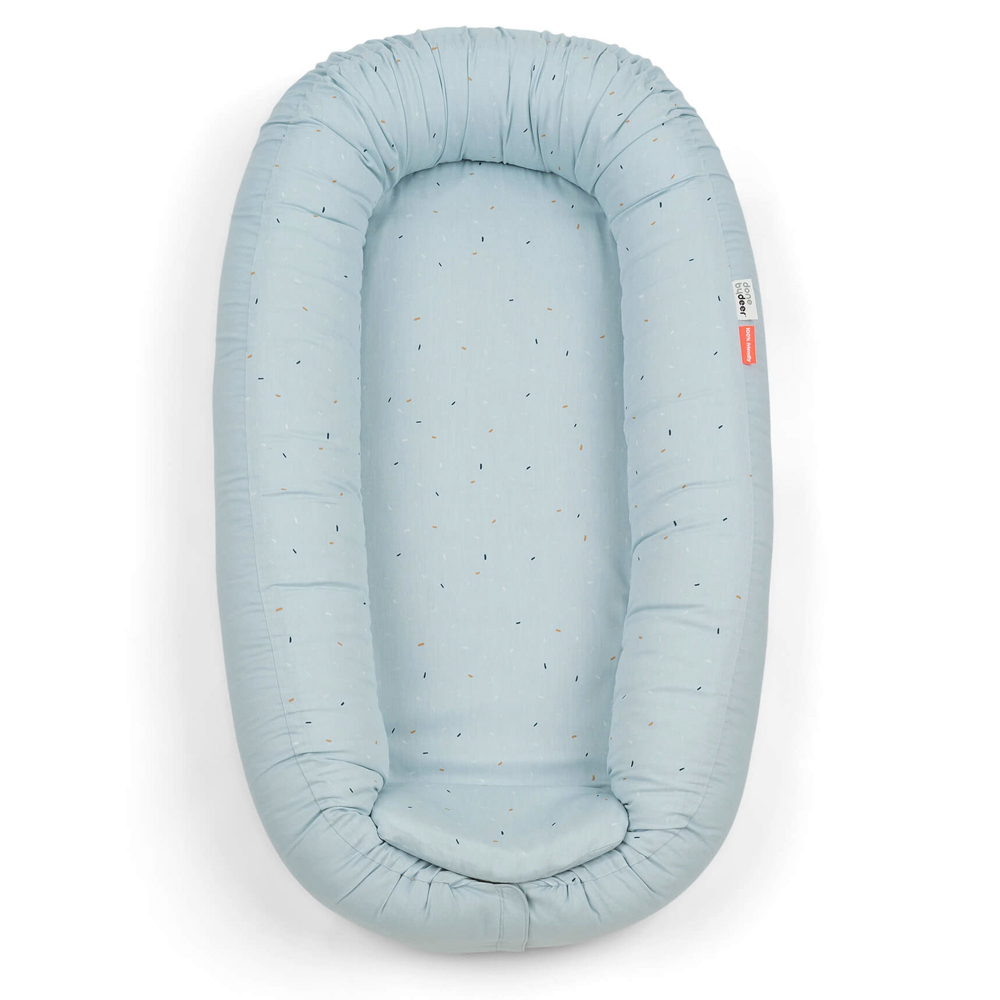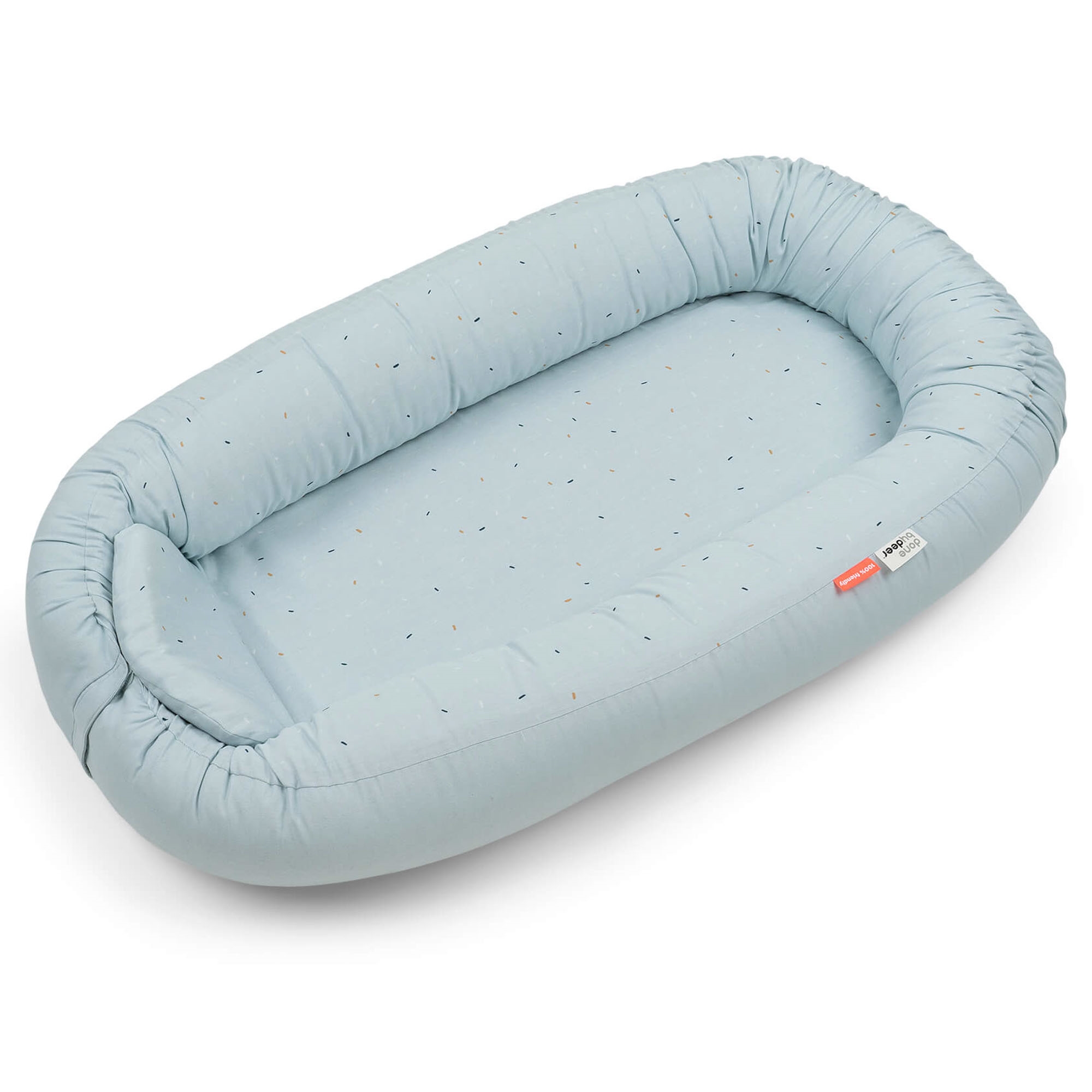 Home » Interior Design » The children's room » Baby bed Done By Deer baby nest - Confetti - Blue Done By Deer Great price:122,49EUR In stock Quantity Add to basket See more from: Done By Deer Item number: 2223652 Do you have questions about the product? Creates a feeling of security and closenessPerfect for sleep, rest and playGentle on the baby's delicate skin Size: 85x50x13 cm Material: 100% organic cotton Filling: 100% soft fiberfill Mattress: 100% PU foam Color: Blue Series: Confetti Brand: Done By Deer Washing: - Cover: Machine wash at 40°C. - Mattress: Hand wash only. - Piping (sides): Machine wash at 40°C. Tumble dry: No Tested in accordance with BS 4578 (breathability). Mattress firmness complies with EN 16890. Certification: STANDARD 100 by OEKO-TEX® (15.HTR.57912). Your guarantee that the product is free from harmful chemicals. Baby nest - safety and comfort Create a safe and cozy place for your baby with this soft baby nest from Done by Deer in the pretty Confetti design. The baby nest measures 85x50 cm and is ideal for sleep, play, rest and tummy time. The soft construction surrounds the child and provides a feeling of security and closeness, reminiscent of the time in the mother's womb. This makes the baby nest perfect for both newborns and small babies who need calm and comfort. The baby nest is made from 100% organic cotton and is OEKO-TEX® certified, ensuring that the materials are free from harmful chemicals and gentle on the child's skin. The soft mattress provides good support, while the padded edges create a safe frame around the child. With a practical, hidden YKK zipper the mattress can easily be removed so that both cover and filling can be washed separately. The baby nest can also be opened at the end so it can be adjusted to the child's size and used for a longer period. The calm blue color design with delicate confetti details fits perfectly into any home and creates a cozy and stylish atmosphere. See our full range of baby nests here Done by Deer Done by Deer is a Danish brand that combines Scandinavian design with functional solutions for babies and children. The brand is known for its clean products in soft colors and playful motifs, which fit perfectly into modern homes. The range spans from tableware, lunchboxes and storage to textiles, toys and interior. Done by Deer places great emphasis on quality and safety. The products are manufactured from materials that meet applicable standards for food safety and children's products, so you can use them with confidence in everyday life. See the full range from Done By Deer here. Return to Baby bed