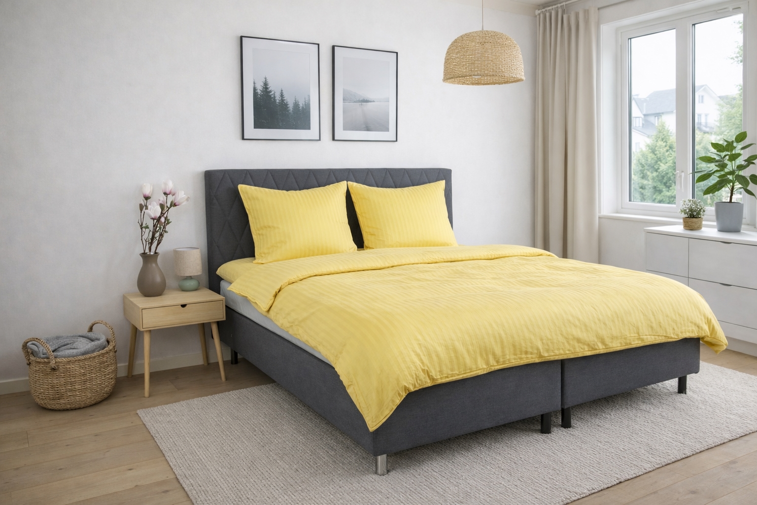 Create an elegant and exclusive look in the bedroom with this yellow striped bed linen in 100% cotton satin. The bed linen combines classic design with high comfort and is made for those who want both luxury and functionality in everyday life.
