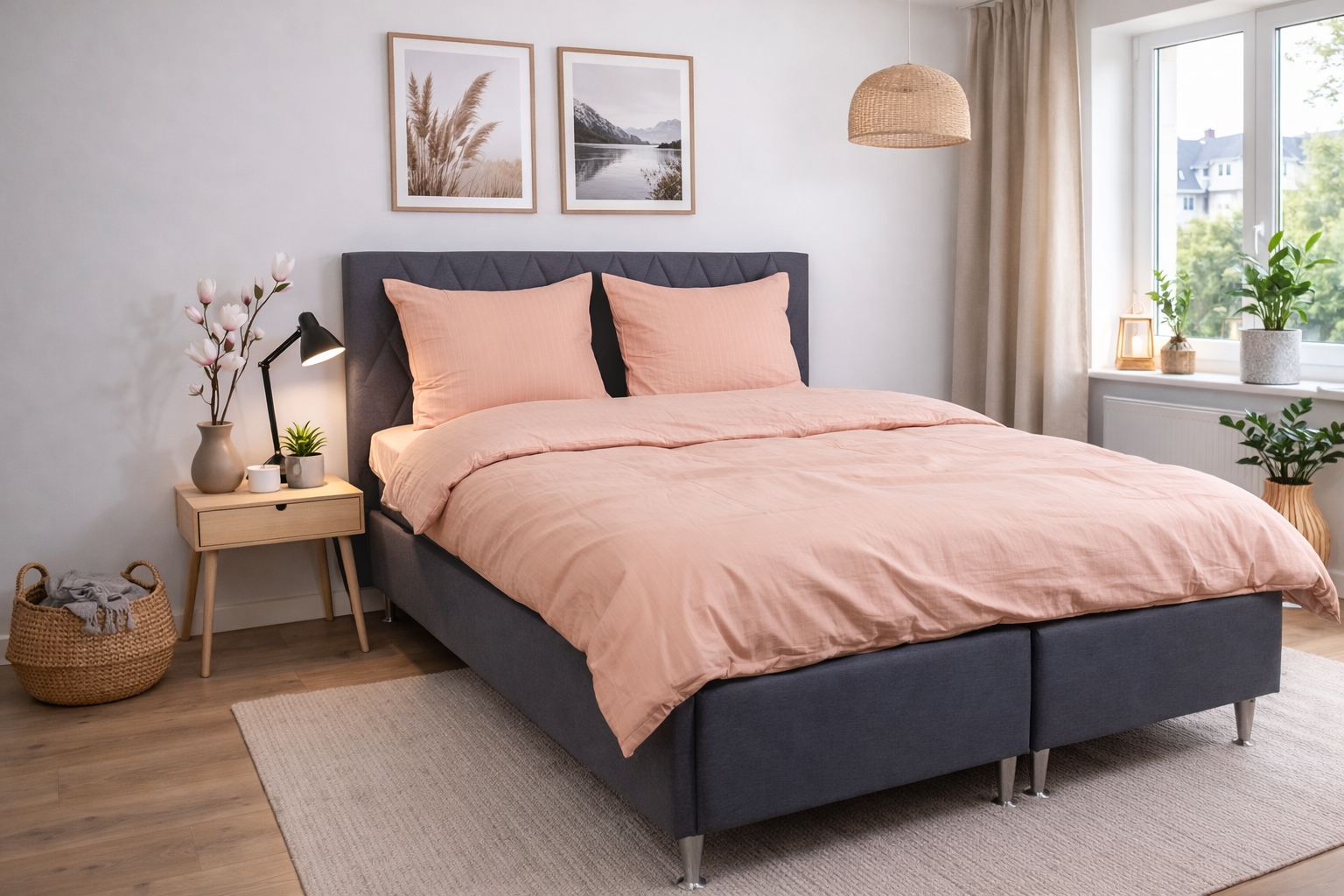 Home » Bedding » Double bedding » Double bedding 200x220 cm Double bed linen 200x220 cm - 100% cotton - Pink with white stripes 2 x PillowcasesSave59% Nordstrand Home 108,9944,99EURSave 64,- In stock Select size Select a variant Quantity Add to basket See more from: Nordstrand Home Item number: 2224-5 Read our bedding guide See our large selection of sheets See our large selection of duvets 200x220 Do you have questions about the product? Natural and breathable materialFeels soft and comfortable against the skinPractical zipper closure in durable quality Duvet cover: 200x220 cm Pillowcases: 2 pcs. á 60x63 cm Material: 100% soft cotton Weave: 170 TC percale weave (Thread count = number of threads per square inch) Color: Pink with white stripes Design: Striped Brand: Nordstrand Home Closure: Duvet and pillow covers with zipper Wash: 60° Tumble dry: Yes Ironing: Yes Certification: STANDARD 100 by OEKO-TEX® (2023OK2234). Your guarantee that the product is free from harmful chemicals. Double cotton bedding with pink pinstripe design Give the bedroom a clean and calm expression with this elegant double bed linen in cotton from Nordstrand Home. The classic pink pinstripe design creates a harmonious atmosphere and fits perfectly into both modern and Nordic interiors. Double bedding is the ideal choice for those who use a double duvet and want a uniform and calm look in the bed. Double bedding provides good freedom of movement throughout the night and is suitable for couples and anyone who wants extra space and comfort. This set includes one duvet cover and two pillowcases. The bedding set is made of 100% soft cotton and woven in a dense 170TC percale quality. Percale weaving means the fabric is extra fine and tightly woven, giving a smooth and breathable surface. This weave makes cotton bedding feel light and comfortable against the skin while being durable and keeping its quality wash after wash. The dense weave also ensures that the color remains beautiful and clear even after repeated washes at 60 degrees. This makes this percale bedding for double duvets a practical and durable choice for everyday use. The bedding is certified with STANDARD 100 by OEKO-TEX® (2023OK2234). It is your guarantee that the product has been tested and is free from harmful chemicals. Therefore it is a safe choice for the whole family – also for those with sensitive skin. Both duvet cover and pillowcases close with a practical zipper so the bedding stays neat all night. See all our cotton bedding here Nordstrand Home With Nordstrand Home you are guaranteed home textiles in Danish design - in a Nordic style. Nordstrand Home places great emphasis on the feeling of well-being in a beautiful, yet relaxing environment. With Nordstrand Home you don't have to compromise; you will always find products in classic and fashionable colors. Nordstrand Home – So you feel at home! See the full range from Nordstrand Home here Return to Double bedding 200x220 cm Customers also bought Bedding for double duvet 200x220 cm - Petrol coloured bed set - IN Style bed linen in microfibre In stock 68,4931,49EUR Add to basket Stretch fitted sheet 140x200 cm - White jersey sheet - IN Style fitted sheet In stock 31,4912,49EUR Add to basket Pillow - Medium pillow 60x63 cm - 3 chamber combi pillow - Zen Sleep In stock 81,9920,49EUR Add to basket Double bedding 200x220 cm - Purple floral bed set - Borg Living double duvet cover in polycotton In stock 61,4932,99EUR Add to basket 2 x Pillowcases Double duvet set 200x220 cm - Grey Leaves - Bøk and bølge - Borg Living double duvet cover In stock 122,4968,49EUR Add to basket 2 x Pillowcases Double bedding 200x220 cm - Stonewashed - Firm Sand In stock 108,9954,49EUR Add to basket 2 x Pillowcases Double bed linen 200x220 cm - 100% cotton - Blue with dark blue checks In stock 108,9944,99EUR Add to basket 2 x Pillowcases Double bed linen 200x220 cm - 100% cotton - Green with dark green checks In stock 108,9944,99EUR Add to basket Summer silk duvet - 100% Mulberry silk filling - 140x200 cm - Temperature-regulating summer duvet from Borg Living In stock 217,9968,49EUR Add to basket Fibre duvet - 200x220 cm - All-season duvet - Microfibre duvet - Borg Living In stock 163,4954,49EUR Add to basket