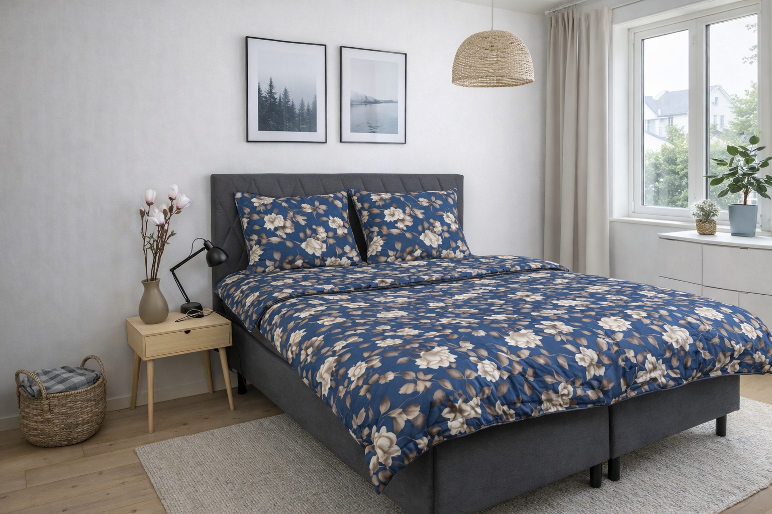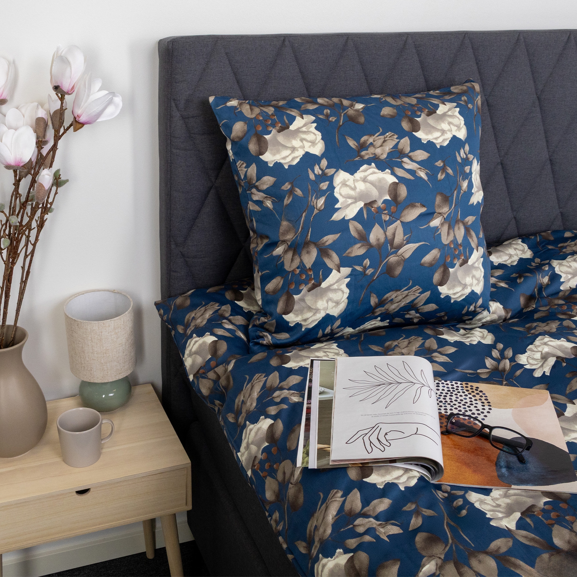 Home » Bedding » Double bedding » King size bedding 240x220 cm Double bed linen 240x220 cm - Cotton satin - Blossom blue - Floral print 2 x PillowcasesSave58% By Night 163,4968,49EURSave 95,- In stock Select size Select a variant Quantity Add to basket See more from: By Night Item number: 508-6 Read our bedding guide See our large selection of sheets See our large selection of duvets 240x220 Do you have questions about the product? Breathable natural material that provides high comfort all year roundSoft and smooth surface that feels pleasant against the skinBeautiful colorfastness that lasts wash after wash Duvet cover: 240x220 cm Pillowcase: 2 pcs. á 60x63 cm Material: 100% fine cotton satin Weave: Extra fine 230TC satin weave (Thread count = number of threads per square inch) Colour: Blue Design: Blossom Brand: By Night Closure: Duvet and pillow covers with hidden YKK zipper Wash: 60° Tumble drying: Yes Suitable for ironing: Yes Certification: STANDARD 100 by OEKO-TEX® (11-47893). Your guarantee that the product is free from harmful chemicals. King Size bed linen in 100% cotton satin - floral print Create an atmospheric and elegant feel in the bedroom with this beautiful King Size bedding set in 100% cotton satin. Cotton satin is known for its smooth, soft and comfortable surface that feels gentle against the skin. The extra fine satin weave with a thread count of 230TC gives the bed linen a subtle sheen, which also contributes to a comfortable night’s sleep. At the same time, cotton satin is a natural and breathable material that helps regulate temperature so you can sleep comfortably all year round. The double bed linen has high colour and wash fastness, which means the set keeps its attractive appearance wash after wash. The duvet and pillow covers close with a hidden zipper, providing a neat finish and keeping the duvet securely in place all night. The bed linen is OEKO-TEX® certified according to STANDARD 100, which is your guarantee that the product has been tested and is free from harmful chemicals, so you can sleep safely and comfortably. This duvet cover is an ideal choice for those who want a soft, stylish and practical bedding set of high quality, where comfort and design go hand in hand. See all our cotton satin bedding here By Night By Night, produced by Borg Design, is characterised by Danish design - they provide comfortable products for your sleep in the highest quality. By Night produces bed linen and sheets for the whole family and places great emphasis on current trends, so production always includes fashionable colours and designs. See the full range from By Night here Return to King size bedding 240x220 cm Customers also bought 2 x Pillowcases Double bedding 240x220 cm - Cotton satin - Summer Bloom - Light blue floral print In stock 163,4968,49EUR Add to basket Microfibre duvet - 240x220 cm - All-season duvet - Microfibre duvet - Borg Living In stock 176,9968,49EUR Add to basket 2 x Pillowcases King size bedding - 240x220 cm - Reversible design in 100% cotton satin - Flowers & Dots curry - Bedding set from By Night In stock 163,4968,49EUR Add to basket 2 x Pillowcases Double bed linen 240x220 cm - Cotton satin - Dark blue marble print In stock 163,4968,49EUR Add to basket 2 x Pillowcases Double bed linen 240x220 cm - Cotton satin - Reversible blue Hexagon print In stock 176,9968,49EUR Add to basket All-Season Pillow King Size All-season duvet 240x220 cm - With 100% musk duck down - Allergy-friendly down duvet - Nordstrand Home double duvet In stock 585,49244,99EUR Add to basket Kapok king size duvet - Organic and allergy-friendly all-season duvet with natural filling - 240x220 cm - Nature By Borg kapok double duvet In stock 408,49204,49EUR Add to basket Boil-proof Mattress protector - Allergy-friendly and breathable - 180x200 cm - Soft and practical mattress protector from Nordstrand Home In stock 108,9961,49EUR Add to basket Extra depth fitted sheet 180x210 cm - Black - 100% Cotton satin - Fitted sheet for mattress In stock 95,4947,99EUR Add to basket Soft Topper fitted sheet 180x200 - 100% cotton satin - 8 cm in height - Blue sheet for mattress topper - By Night satin sheet In stock 74,9934,49EUR Add to basket