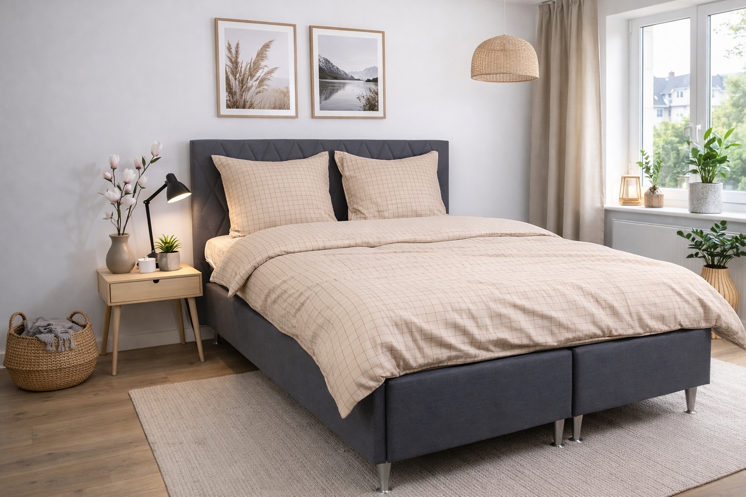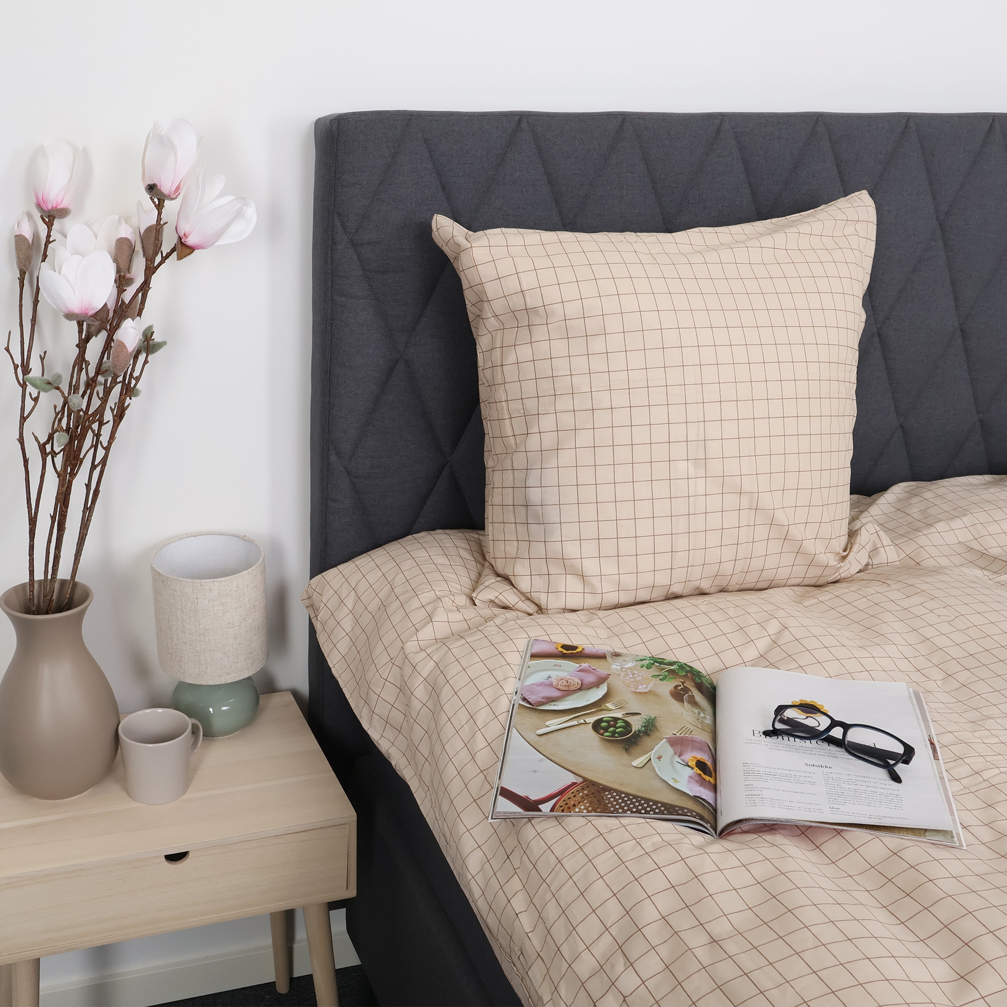 Home » Bedding » Double bedding » Double bedding 200x200 cm Double bedding 200x200 cm - 100% cotton - Sand-coloured with brown checks 2 x PillowcasesSave59% Nordstrand Home 108,9944,99EURSave 64,- In stock Select size Select a variant Quantity Add to basket See more from: Nordstrand Home Item number: 2227-4 Read our bedding guide See our wide range of sheets See our wide range of duvets 200x220 Do you have questions about the product? Natural and breathable materialFeels soft and comfortable against the skinPractical zipper closure in durable quality Duvet cover: 200x200 cm Pillowcase(s): 2 pcs. á 60x63 cm Material: 100% soft cotton Weave: 170 TC percale weave (Thread count = number of threads per square inch) Colour: Sand with brown checks Design: Checked Brand: Nordstrand Home Closure: Duvet and pillow covers with zipper Wash: 60°C Tumble dry: Yes Ironable: Yes Certification: STANDARD 100 by OEKO-TEX® (2023OK2234). Your guarantee that the product is free from health-hazardous chemicals. Double bed linen in cotton with sand-coloured checked design Give the bedroom a clean and calm expression with this elegant double bed linen in cotton from Nordstrand Home. The classic checked design in sand creates a harmonious atmosphere and fits perfectly into both modern and Nordic interiors. Double bedding is the ideal choice for those who use a double duvet and want a consistent and calm look in the bed. Double bed linen provides good freedom of movement throughout the night and is suitable for couples as well as those who want extra space and comfort. This set includes one duvet cover and two pillowcases. The bedding set is made from 100% soft cotton and woven in a dense 170TC percale quality. Percale weaving means the fabric is extra fine and tightly woven, which gives a smooth and breathable surface. This weave makes cotton bed linen feel light and comfortable against the skin while being durable and holding up wash after wash. The dense weave also ensures that the colour remains beautiful and clear, even after repeated washes at 60 degrees. This makes this percale bed linen for double duvets a practical and durable choice for everyday use. The bed linen is certified with STANDARD 100 by OEKO-TEX® (2023OK2234). It is your guarantee that the product has been tested and is free from health-hazardous chemicals. Therefore it is a safe choice for the whole family – also for those with sensitive skin. Both the duvet cover and pillowcases are closed with a practical zipper, so the bedding stays neat all night. See all our cotton bed linen here Nordstrand Home With Nordstrand Home you are guaranteed home textiles in Danish design - in a Nordic style. Nordstrand Home places great emphasis on the feeling of well-being in a beautiful yet relaxed environment. With Nordstrand Home you do not need to compromise; you will always find products in classic and fashionable colours. Nordstrand Home – So you feel at home! See the full range from Nordstrand Home here Return to Double bedding 200x200 cm Customers also bought Bedding 140x200 cm - 100% cotton - Sand-coloured with brown checks Few in stock 68,4923,49EUR Add to basket 2 x Pillowcases Double bedding 200x200 cm - 100% cotton - Blue with brown stripes In stock 108,9944,99EUR Add to basket Stretch fitted sheet 140x200 cm - White jersey sheet - IN Style fitted sheet In stock 31,4912,49EUR Add to basket Stretch fitted sheet 180x200 cm - White jersey sheet - IN Style - Fitted sheet for double bed In stock 36,9913,99EUR Add to basket 2 x Pillowcases Double bed linen 200x200 cm - 100% cotton - Sand-coloured with brown stripes In stock 108,9944,99EUR Add to basket 2 x Pillowcases Double bedding 200x200 cm - 100% cotton - Blue with white harlequin pattern In stock 108,9944,99EUR Add to basket 2 x Pillowcases Double bed linen 200x200 cm - 100% cotton - Green check In stock 108,9944,99EUR Add to basket 2 x Pillowcases Seersucker double bedding 200x200 cm - Gray bed set - 100% cotton - Crepe bed linen - By Night In stock 122,4954,49EUR Add to basket Muscovy down pillow - High - 50x70 cm - 3-chamber pillow - Borg Living In stock 108,9954,49EUR Add to basket Stretch fitted sheet 160x200 cm - White Jersey sheet - 100% Cotton - Fitted sheet for mattress In stock 54,4927,49EUR Add to basket