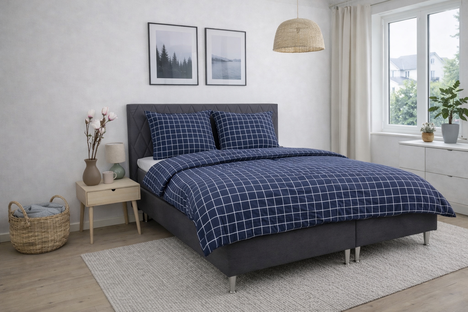 The checked design combines neat white checks with a blue background, creating a calm and harmonious expression in the bedroom. A checked bedding that both feels warm and looks elegant.