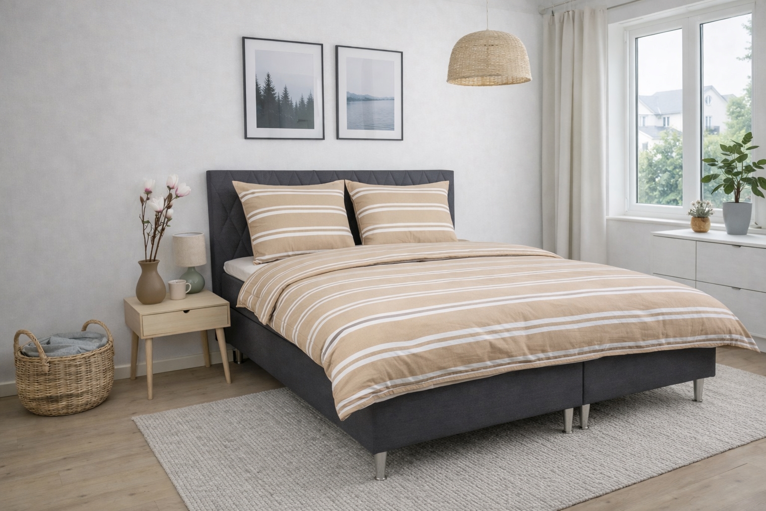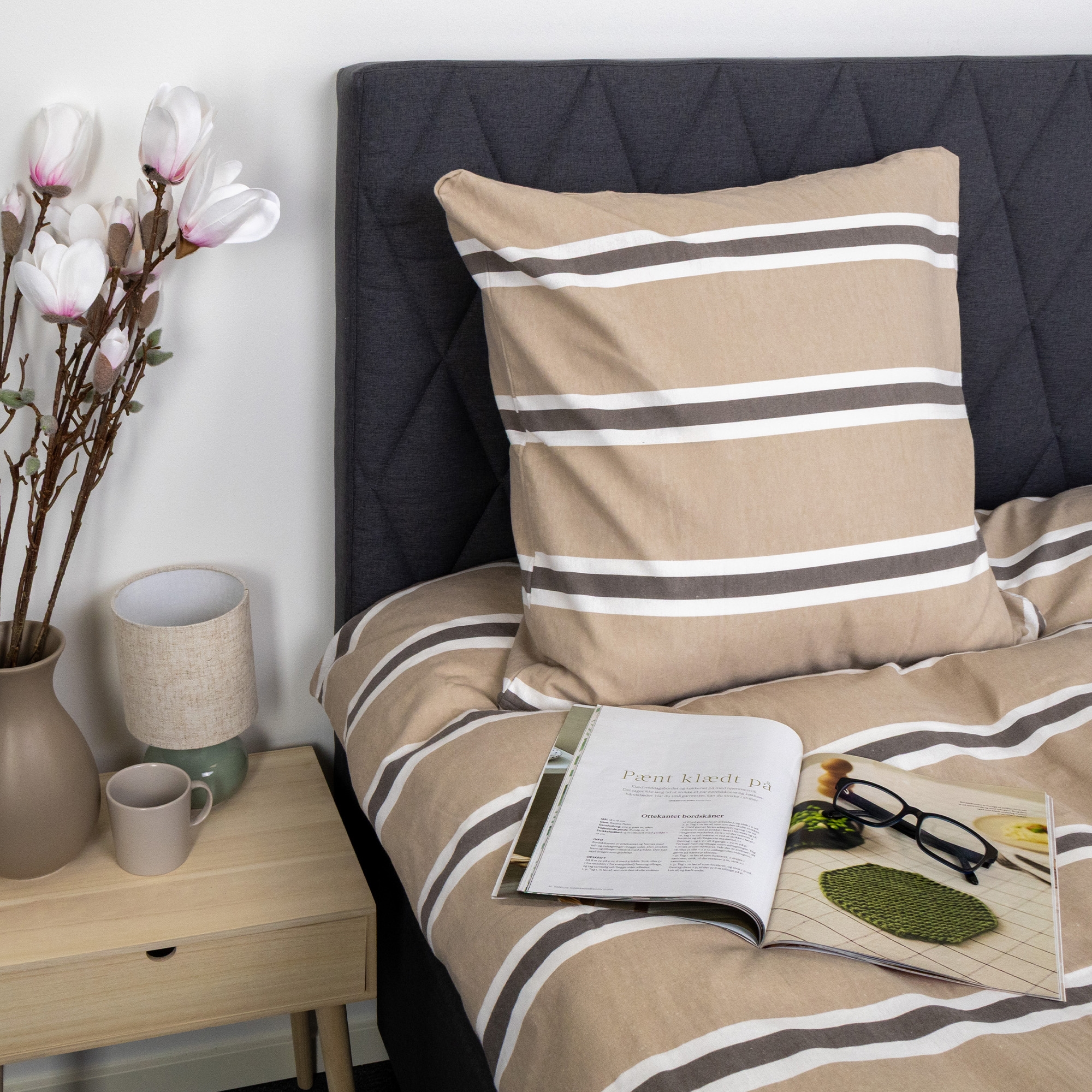The striped design combines attractive brown and white stripes on a beige background, creating a calm and harmonious expression in the bedroom. A striped bedding that both feels warm and looks elegant.