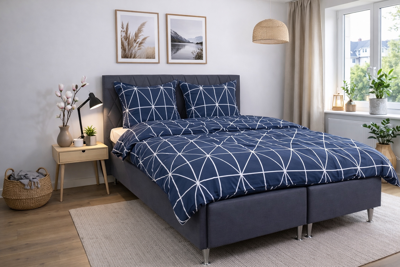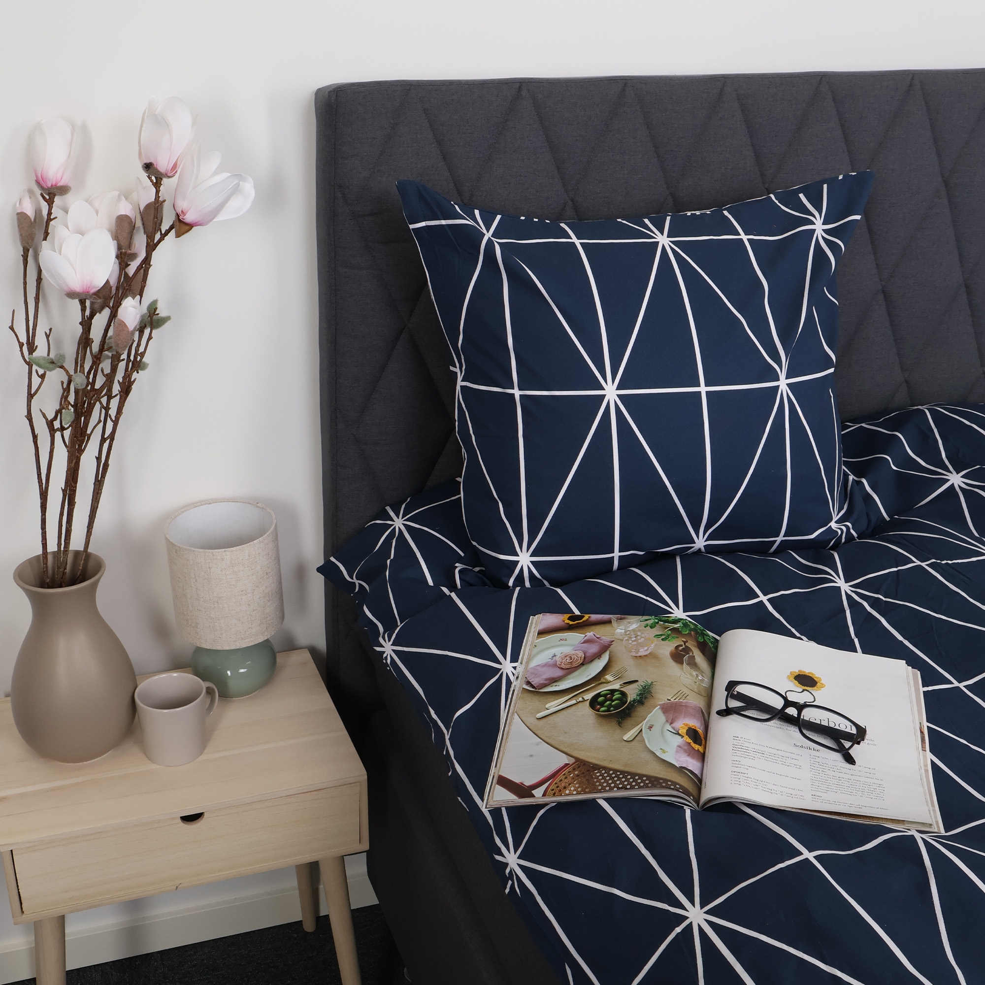Home » Bedding » Double bedding » Double bedding 200x220 cm Double bedding 200x220 cm - 100% cotton - Blue with white harlequin pattern 2 x PillowcasesSave59% Nordstrand Home 108,9944,99EURSave 64,- In stock Select size Select a variant Quantity Add to basket See more from: Nordstrand Home Item number: 2232-5 Read our bedding guide See our wide selection of sheets See our large selection of duvets 200x220 Do you have questions about the product? Natural and breathable materialFeels soft and comfortable against the skinPractical zipper closure in durable quality Duvet cover: 200x220 cm Pillowcase(s): 2 pcs. á 60x63 cm Material: 100% soft cotton Weave: 170 TC percale weave (Thread count = number of threads per square inch) Colour: Blue with white harlequin pattern Design: Harlequin Brand: Nordstrand Home Closure: Duvet cover and pillowcases with zipper Wash: 60° Tumble dry: Yes Ironable: Yes Certification: STANDARD 100 by OEKO-TEX® (2023OK2234). Your guarantee that the product is free from harmful chemicals. Double cotton bedding with harlequin pattern Give the bedroom a clean and calm expression with this elegant double bedding in cotton from Nordstrand Home. The classic harlequin design in blue creates a harmonious atmosphere and fits perfectly into both modern and Nordic interiors. Double bedding is the ideal choice for those who use a double duvet and want a consistent and calm look in the bed. Double bedding provides good freedom of movement throughout the night and is suitable for couples and anyone who wants extra space and comfort. This set includes one duvet cover and two pillowcases. The bedding set is made from 100% soft cotton and woven in a dense 170TC percale quality. Percale weaving means the fabric is extra fine and tightly woven, which gives a smooth and breathable surface. This weave makes the cotton bedding feel light and comfortable against the skin while being durable and holding up wash after wash. The dense weave also ensures that the colour remains beautiful and clear, even after repeated washes at 60 degrees. This makes this percale bedding for double duvets a practical and durable choice for everyday use. The bedding is certified with STANDARD 100 by OEKO-TEX® (2023OK2234). It is your guarantee that the product has been tested and is free from harmful chemicals. Therefore it is a safe choice for the whole family – also for those with sensitive skin. Both the duvet cover and the pillowcases close with a practical zipper so the bedding stays neat all night. See all our cotton bedding here Nordstrand Home With Nordstrand Home you are guaranteed home textiles in Danish design - in a Nordic style. Nordstrand Home places great emphasis on the feeling of well-being in a beautiful, yet relaxed environment. With Nordstrand Home you do not have to compromise; you will always find products in classic and fashionable colours. Nordstrand Home – So you feel at home! See the full range from Nordstrand Home here Return to Double bedding 200x220 cm Customers also bought Bamboo double duvet 200x220 cm - All-season duvet with sumptuously soft bamboo and down fibres - Borg Living In stock 340,49136,49EUR Add to basket 2 x Pillowcases Double bed linen 200x220 cm - 100% cotton - Grey with white harlequin pattern In stock 108,9944,99EUR Add to basket 2 x Pillowcases Bedding 200x220 cm - Zodiac black - Constellation - Double duvet cover in 100% cotton - Borg Living In stock 108,9947,99EUR Add to basket Bedding 140x200 cm - Zodiac grey - Constellation - Duvet cover in 100% Cotton - Borg Living bedding set In stock 68,4923,49EUR Add to basket 2 x Pillowcases Double duvet bedding 200x220 cm - Zodiac grey - Constellation - Duvet cover 100% cotton - Borg Living In stock 108,9947,99EUR Add to basket 2 x Pillowcases Double duvet bedding - 200x220 cm - Duvet cover 100% cotton - Zodiac green - Constellation - Borg Living bedding set In stock 108,9947,99EUR Add to basket Down detergent for duvets and pillows In stock 10,99EUR Add to basket Cotton satin bedding - 150x210 cm - Graphic harlequin green - By Night bedding set In stock 95,4936,99EUR Add to basket 2 x Pillowcases Bedding 200x220 cm - Circle green - Dotted bedding - 100% cotton - Borg Living double duvet cover In stock 95,4947,99EUR Add to basket 2 x Pillowcases Bedding set 240x220 - King size - Circle green - Dotted bedding - 100% cotton - Borg Living double duvet cover In stock 122,4954,49EUR Add to basket