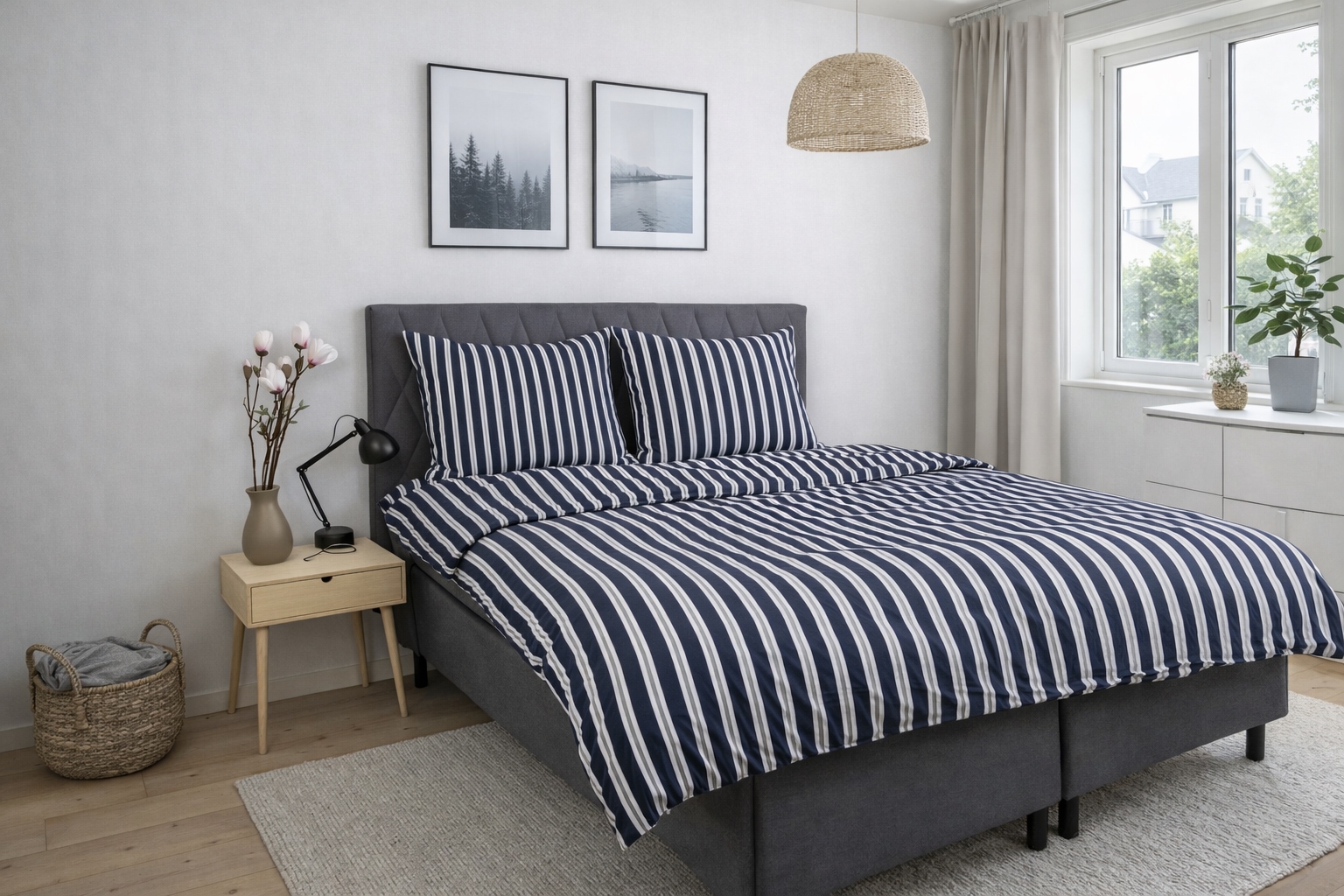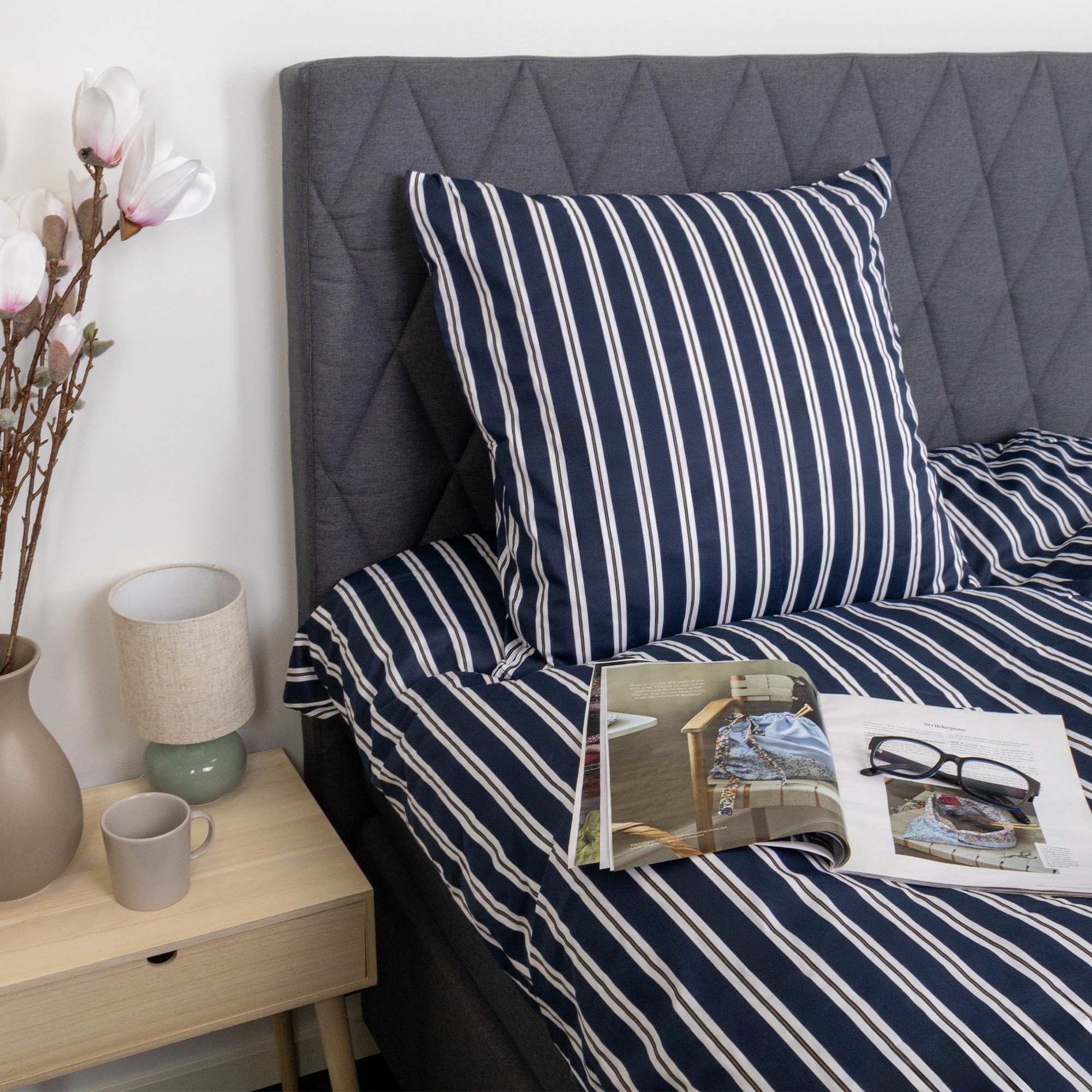 Home » Bedding » Double bedding » King size bedding 240x220 cm Double bedding 240x220 cm - Cotton satin - Blue striped print 2 x PillowcasesSave58% Borg LivingBy Night 163,4968,49EURSave 95,- In stock Select size Select a variant Quantity Add to basket See more from: Borg Living Item number: 506-6 Read our bedding guide See our wide selection of fitted sheets See our wide selection of duvets 240x220 Do you have questions about the product? Breathable natural material that provides high comfort year-roundSoft and smooth surface that feels pleasant against the skinExcellent color fastness that holds wash after wash Duvet cover: 240x220 cm Pillowcase: 2 pcs. each 60x63 cm Material: 100% fine cotton satin Weave: Extra fine 230TC satin weave (Thread count = number of threads per square inch) Color: Blue Design: Stripe Brand: By Night Closure: Duvet and pillow covers with concealed YKK zipper Wash: 60°C Tumble dry: Yes Ironing: Yes Certification: STANDARD 100 by OEKO-TEX® (11-47893). Your guarantee that the product is free from harmful chemicals. King Size bedding in 100% cotton satin - striped print Create an atmospheric and elegant bedroom with this beautiful King Size bedding set in 100% cotton satin. Cotton satin is known for its smooth, soft and comfortable surface that feels gentle against the skin. The extra fine satin weave with a thread count of 230TC gives the bedding a light sheen, which also contributes to a comfortable night's sleep. At the same time, cotton satin is a natural and breathable material that helps regulate temperature so you sleep comfortably all year round. The double bedding has high color and wash fastness, which means the set retains its beautiful appearance wash after wash. Duvet and pillow covers close with a concealed zipper, ensuring a neat finish and keeping the duvet securely in place all night. The bedding is OEKO-TEX® certified according to STANDARD 100, which is your guarantee that the product has been tested and is free from harmful chemicals, so you can sleep safely and comfortably. This duvet cover is an ideal choice for those who want a soft, stylish and practical bedding set of high quality, where comfort and design go hand in hand. See all our cotton satin bedding here By Night By Night, produced by Borg Design, is characterised by Danish design - they provide comfortable products for your sleep in the highest quality. By Night produces bedding and sheets for the whole family and places great emphasis on current trends, so production always includes fashionable colours and designs. See the full range from By Night here Return to King size bedding 240x220 cm Customers also bought Pillowcase 70x100 cm - 100% cotton satin - For headboard pillow - Blue jacquard-woven In stock 54,4934,49EUR Add to basket 2 x Pillowcases King size bedding - 240x220 cm - Reversible design in 100% cotton satin - Flowers & Dots curry - Bedding set from By Night In stock 163,4968,49EUR Add to basket The Dream Duvet. King Size all-season double duvet 240x220 cm - Hypoallergenic duvet with soft fibre down - Fibre duvet from Zen Sleep In stock 244,99122,49EUR Add to basket 2 x Pillowcases Double bedding 240x220 cm - Cotton satin - Big Flower green - Reversible floral print In stock 163,4968,49EUR Add to basket Luxury cushion cover - 70x100 cm - 100% Cotton satin - Daisy red - By Night jacquard woven large pillow cover In stock 54,4934,49EUR Add to basket 2 x Pillowcases Luxury double bedding set - 240x220 cm - 100% Cotton satin - Daisy red - By Night jacquard king size bedding set In stock 149,9981,99EUR Add to basket 2 x Pillowcases Double bedding 240x220 cm - 100% cotton satin - Classic green stripes In stock 149,9961,49EUR Add to basket 2 x Pillowcases Double bedding 240x220 cm - 100% cotton satin - Nordic Stripe - Dark blue stripes In stock 136,4968,49EUR Add to basket Pillowcase 60x63 cm - 100% cotton satin - Nordic Stripe - Dark blue stripes In stock 27,4913,99EUR Add to basket Digitally printed bedding Duvet cover set 140x220 cm - 100% Cotton satin - Reversible dusty green marbled design In stock 115,9947,99EUR Add to basket