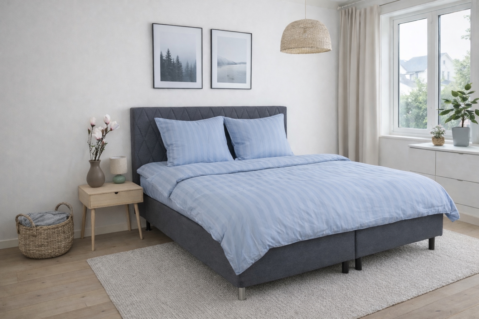 Create an elegant and exclusive look in the bedroom with this light-blue striped bedding in 100% cotton satin. The bedding combines classic design with high comfort and is made for those who want both luxury and functionality in everyday life.