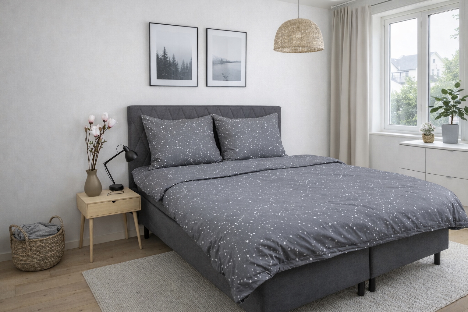 The bedding is made of 100% cotton. Cotton is known for its natural and breathable properties. Cotton provides comfortable and balanced sleeping comfort, as the material helps regulate temperature and absorb moisture throughout the night. The classic weave with a thread count of 170 TC ensures a good combination of comfort, durability and longevity.