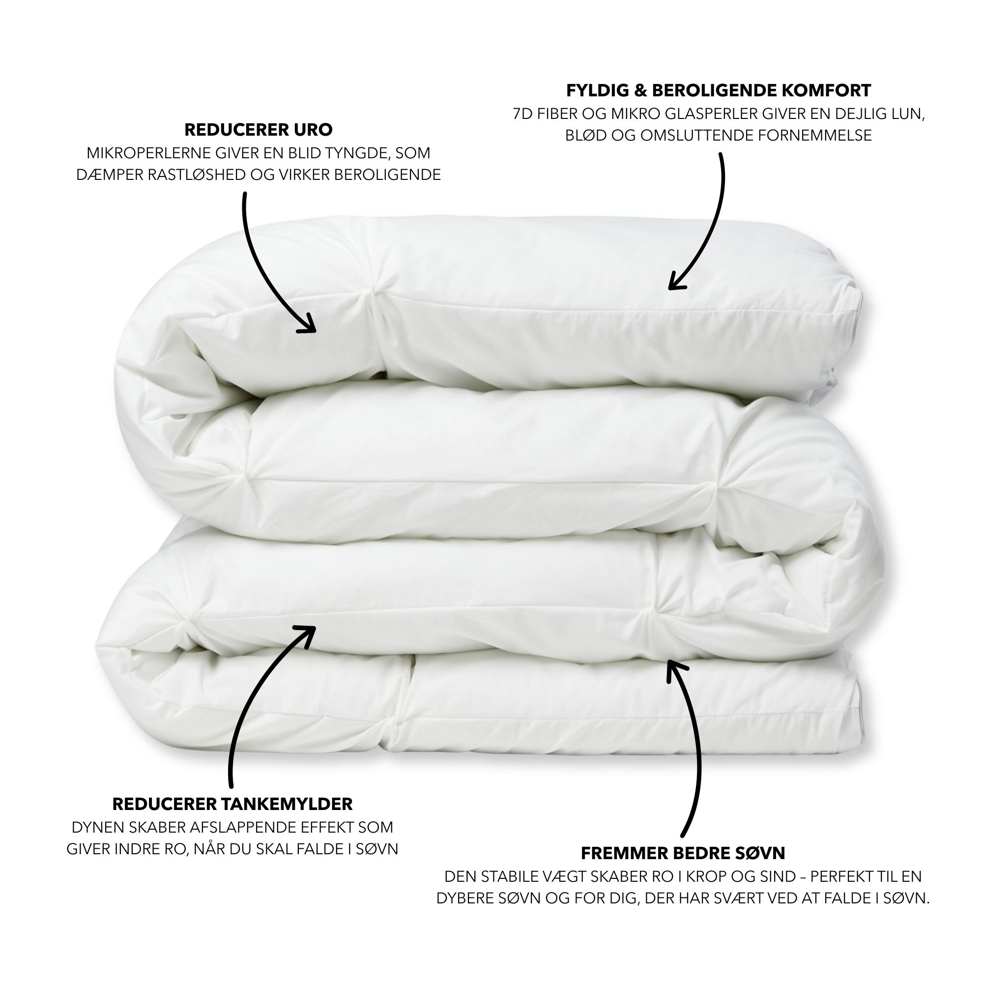 An all-season duvet composed of soft 7D fiber and micro glass beads, with a lovely 100% cotton cover. Each of the 3 materials has properties that together create a duvet that fulfills a need for calm, comfort, and warmth, which cannot be found in other types of duvets. The hybrid duvet is a unique and innovative element for your sleep, which reduces sleep disturbances, creates greater bodily calm, and gives you the opportunity for better sleep. With the hybrid duvet, an extra level is now created - the weight is combined with a lovely soft fiber duvet, and now also creates a lovely warm night's sleep and high comfort.