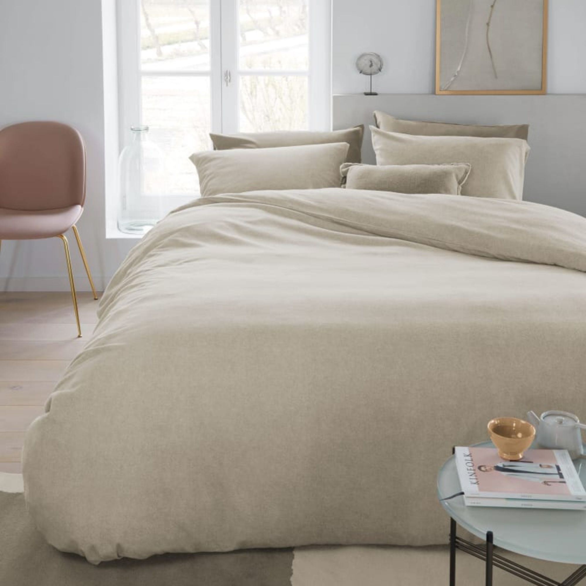 Home » Bedding » Single bedding » Extra long bedding 140x220 cm Flannel bedding 140x220 cm - Sand-colored solid color bedding set - 100% cotton flannel - Frost Beddinghouse bed linen Save25% Beddinghouse 81,9961,49EURSave 21,- In stock Quantity Add to basket See more from: Beddinghouse Item number: 338658-2 Read our bedding guide See our large selection of topper fitted sheets See our large selection of all-season duvets 140x220 Do you have questions about the product? Breathable and comfortableExtra soft and warmDurable cotton Duvet cover: 140x220 cm Pillowcase: 1 piece 60x63 cm Material: 100% cotton flannel Weaving: 220TC (Thread count = number of threads per square inch) Color: Sand-colored Design: Frost Brand: Beddinghouse Closure: Duvet cover with buttons, pillowcase with overlap Washing: 40° Tumble drying: Yes Ironing safe: Yes Certification: STANDARD 100 by OEKO-TEX® (11-38819). Your guarantee that the product is free from harmful chemicals. Soft and lovely bedding set made from 100% cotton flannel. The unique feel of flannel comes from brushing the surface of the fine cotton. This makes the flannel feel warm and soft. The bedding is made of extra fine cotton, known for its softness and great durability. Flannel bedding from Bedding House is made from 100% cotton flannel, known for its soft, lightly brushed, and fluffy surface. The cotton fibers are brushed on the surface, creating an extra soft and fluffy texture. This surface gives the flannel bedding its characteristic and well-known softness and warmth, contributing to a cozy and comfortable sleeping experience. Especially on cool nights, the bedding is a favorite because 100% cotton flannel is breathable and at the same time good at retaining heat. The bedding is OEKO-TEX certified. This guarantees that the bedding has been tested and is free from harmful substances; additionally, the bedding is allergy-friendly. Freshen up your bed and bedroom with a beautiful and lovely bedding set like this one. Take the opportunity to ensure maximum sleeping comfort by adding a new soft topper fitted sheet of high quality. You can find our large selection of quality topper fitted sheets here Return to Extra long bedding 140x220 cm
