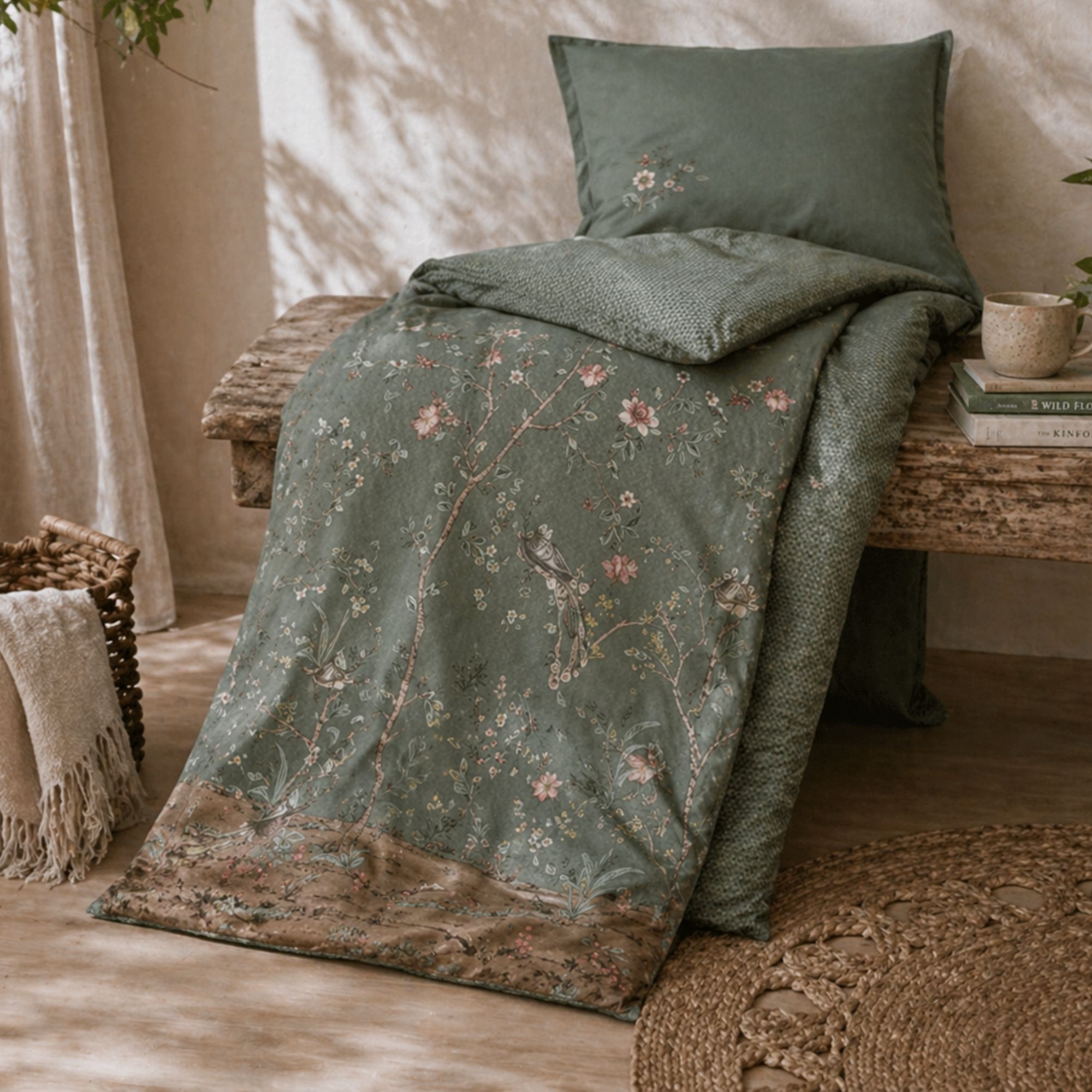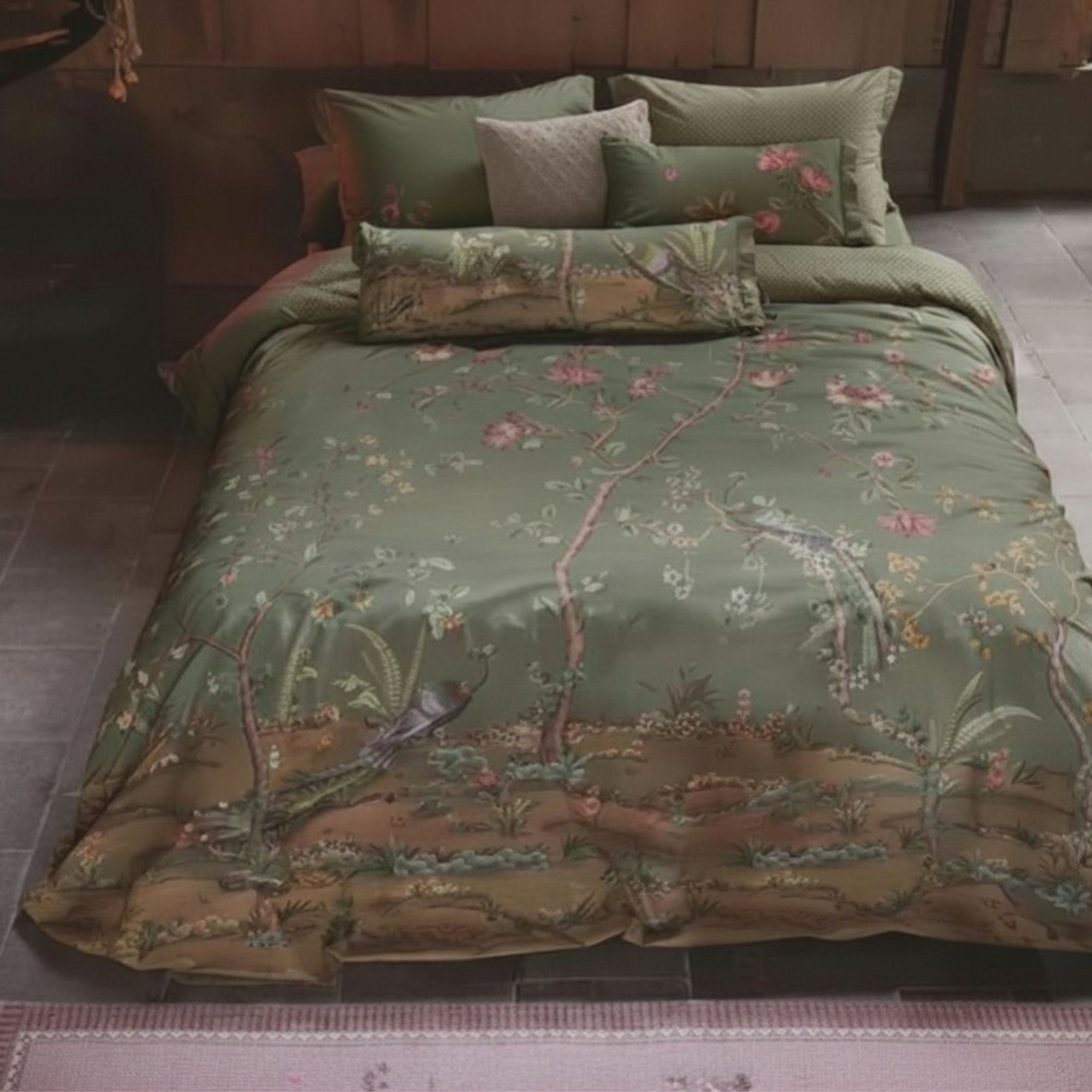 Home » Bedding » Double bedding » Double bedding 200x220 cm Floral double bedding 200x220 cm - Green reversible bedding set in 100% soft cotton - Okinawa green - Pip Studio bedding 2 x PillowcasesSave13% Pip Studio 204,49176,99EURSave 28,- Few in stock Quantity Add to basket See more from: Pip Studio Item number: 248111-5 Do you have questions about the product? OEKO-TEX certification100% soft cottonSoft and lovely quality Duvet cover: 200x220 cm Pillowcases: 2 pcs each 60x63 cm Material: 100% soft cotton Weave: Extra fine 200TC percale (Thread count = number of threads per square inch) Color: Green with flowers Design: Okinawa Brand: Pip Studio Closure: Duvet and pillowcases with buttons Wash: 60°C Tumble dry: Yes Ironing safe: Yes Certification: STANDARD 100 by OEKO-TEX® (11-47893 Shirley). Your guarantee that the product is free from harmful chemicals. This double bedding set is woven in a 100% cotton percale weave that provides extra softness with good durability. Additionally, the bedding is 100% dyed through, meaning the color is bound in the cotton fibers during production. This results in incredibly high color and wash fastness. The bedding set is OEKO-TEX® certified. The certification ensures that the product contains no harmful chemicals and is produced under proper conditions, so you can sleep safely at night - and we also take good care of the environment. Freshen up your bed and bedroom with a beautiful and lovely bedding set like this. At the same time, take the opportunity to ensure maximum sleeping comfort by adding a new soft sheet of high quality. You can find our large selection of quality sheets here Pip Studio originates from the Netherlands, which is also reflected in their unique design patterns. The designers behind Pip Studio find their inspiration from, for example, several hundred-year-old tiles or wallpaper. Pip Studio is known for their cheerful colors and romantic style. With attention to detail and lots of beautiful colors, Pip Studio bedding is perfect for adding a splash of color to your everyday life. At the same time, the lovely quality helps give you a wonderful night's sleep. Return to Double bedding 200x220 cm