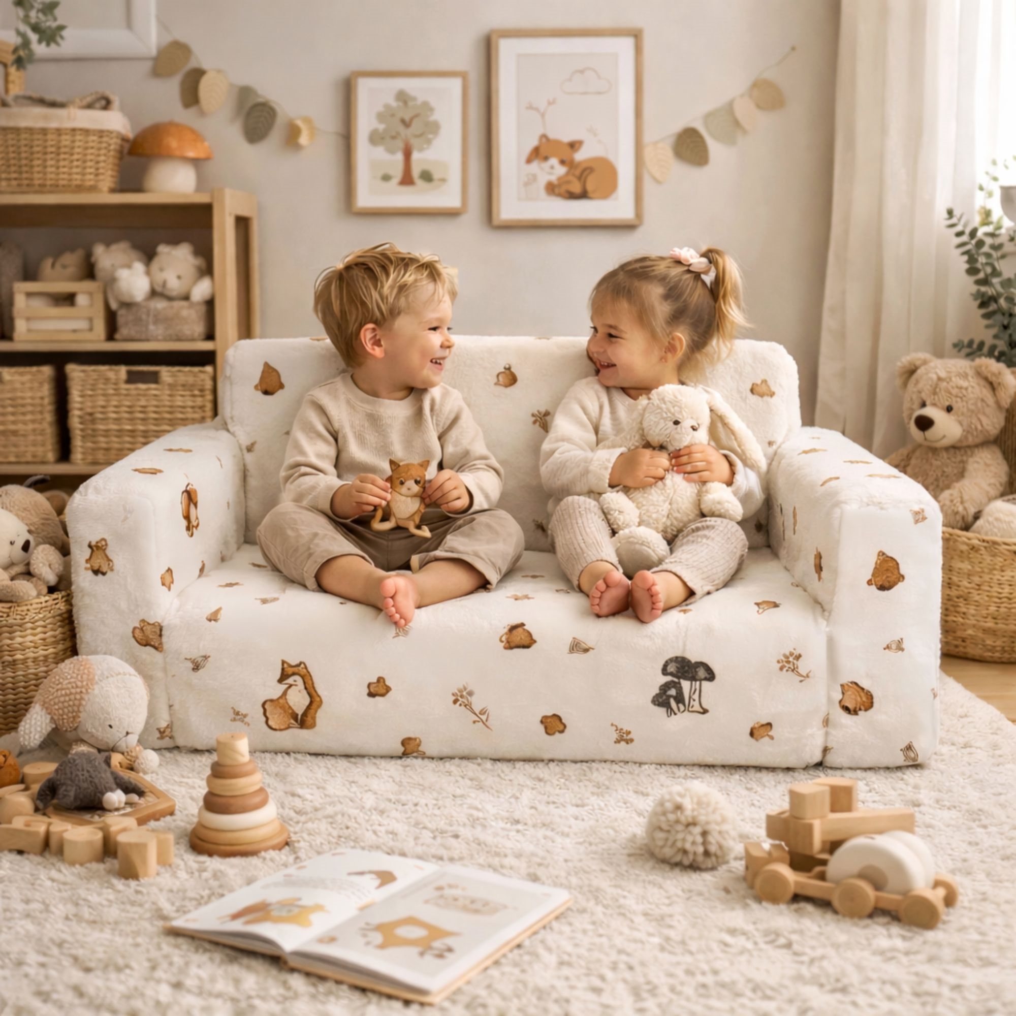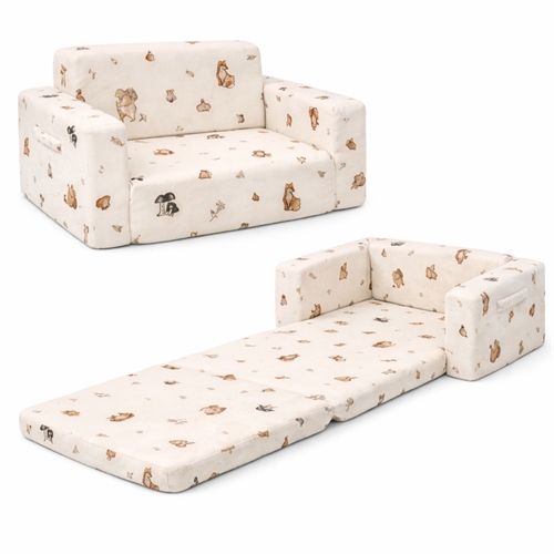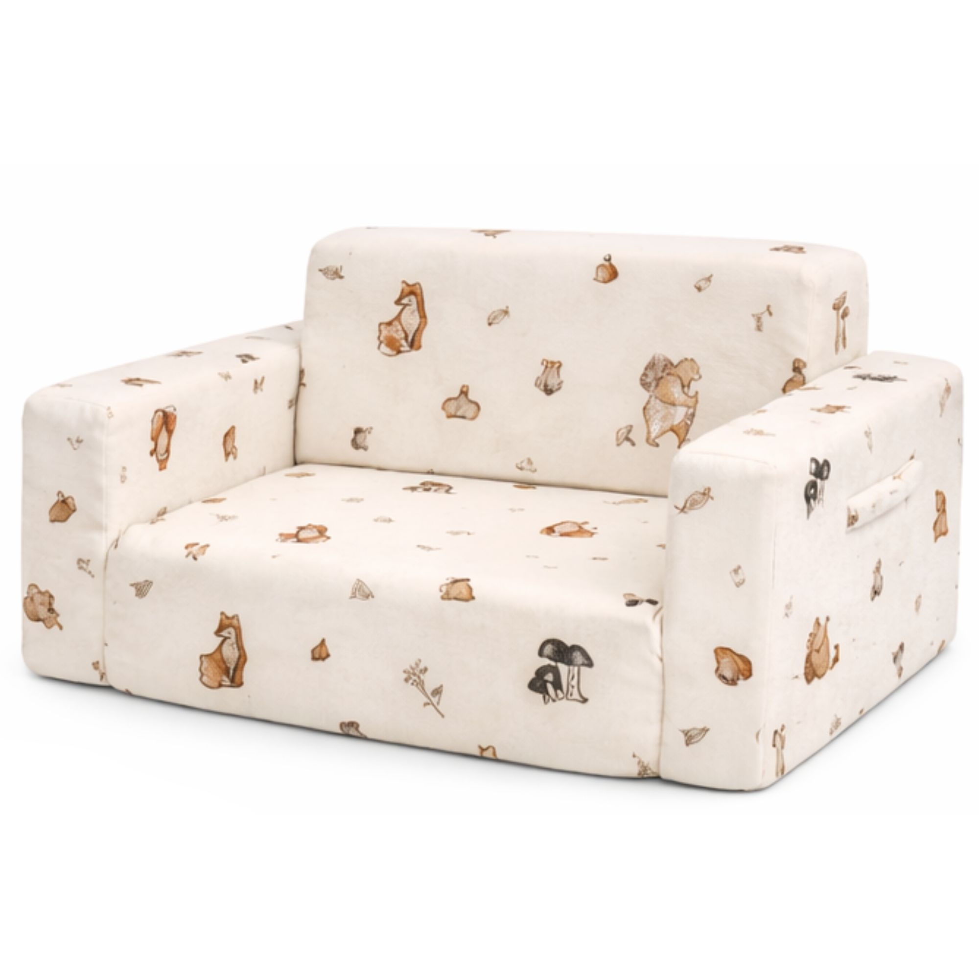 Create a cozy and functional corner in the children's room with this lovely fold-out sofa for children from Nordstrand Home. The soft children's sofa is designed in a beautiful sand color with a sweet Forest Animals print that fits perfectly into a Nordic-inspired children's room. Here you get a practical 2-in-1 solution that functions both as a sofa for everyday use and as a fold-out mattress when it's time to relax, read a book or take a little nap.