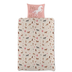 Home » Bedding » Children's bedding » Children's bedding 140x200 cm Horse bedding 140x200 cm - Beautiful romantic horse - 100% cotton bedding set Save57% Licens 47,9920,49EURSave 28,- In stock Quantity Add to basket See more from: Licens Item number: 1834-1 Read our bedding guide See our large selection of fitted sheets See our large selection of duvets 140x200 Do you have questions about the product? Popular designSoft and lovely cottonOEKO-TEX® certified Duvet cover: 140x200 cm Pillowcase: 60x63 cm Material: 100% soft cotton Color: Light pink Motif: Horse with flowers and hearts Design: Reversible - Front side with a horse, back side with all-over print of horse motifs Closure: Duvet with buttons, pillowcase with overlap Wash: 60° Tumble dry: Yes Ironing safe: Yes Certification: STANDARD 100 by OEKO-TEX® (11-67789 Shirley). Your guarantee that the product is free from harmful chemicals. Soft bedding with a motif of a horse with flowers and hearts. This beautiful bedding has two sides to choose from, as it is made with a smart reversible design. The soft bedding set produced in 100% cotton is both breathable and absorbent, providing good sleeping comfort. A durable cotton children's bedding set that makes the children's room a little more exciting. A beautiful and lovely horse bedding set, reversible with different motifs on front and back. On one side there are motifs of an elegant horse with hearts and flowers. Flip the bedding set over, and there is a beautiful pattern with horses. Any horse-loving girl or boy will love this bedding set. The bedding set is made of 100% soft cotton which makes the set durable and highly breathable. The pure cotton quality provides a lovely and soft bedding set that helps promote sleeping comfort for the child. Cotton bedding can be washed at 60° in the washing machine, which also helps maintain a high hygiene level. The bedding is further produced with OEKO-TEX certification, which guarantees that the set is free from harmful chemicals. Browse for favorites and much more in our large selection of accessories for the children's universe For the child, the bed should be a safe place and all elements should together create soft and cozy surroundings for the child to find peace in. Therefore, use the child's interests to create a safe sleeping room for the child. With us, you can find a large selection of accessories for the bed and children's room, from fitted sheets to duvets, pillows, bedding and much more, and lots of products with all the children's favorites on. All elements that can help create the right sleeping environment and room for your child. Here you can find lovely and soft quality fitted sheets Return to Children's bedding 140x200 cm Customers also bought Horse bedding 140x200 cm - Motif of two horses - Reversible bedding set - 100% cotton In stock 47,9927,49EUR Add to basket Horse Towel - 70x140 cm - 100% Cotton - Soft Bath Towel with a Horse on the Beach Few in stock 27,4913,99EUR Add to basket Horse Towel - 70x140 cm - 100% Cotton - Soft Bath Towel with Galloping Horse in Sand In stock 27,4913,99EUR Add to basket Horse bedding 140x200 cm - Beautiful Galloping Horses - 100% cotton bedding set In stock 47,9920,49EUR Add to basket Horse bedding 140x200 cm - Galloping horses - Reversible duvet cover - 100% cotton bedding set In stock 47,9920,49EUR Add to basket Horse bedding 140x200 cm - Horse bedding with small pictures - 2 in 1 design - Duvet cover in 100% cotton In stock 47,9923,49EUR Add to basket Horse towel - 70x140 cm - 100% cotton - Soft bath towel with galloping brown horse In stock 27,4913,99EUR Add to basket Children's blanket - Horse - 100x140 cm - Soft and delightful fleece blanket - Borg Living In stock 17,999,99EUR Add to basket Unicorn bedding - 140x200 cm - Believe in your dreams - Reversible design with unicorn duvet cover - 100% cotton bedding set In stock 47,9927,49EUR Add to basket Purple Unicorn Towel - 70x140 cm - 100% Cotton - Soft Bath Towel with a Unicorn and Stars In stock 27,4913,99EUR Add to basket
