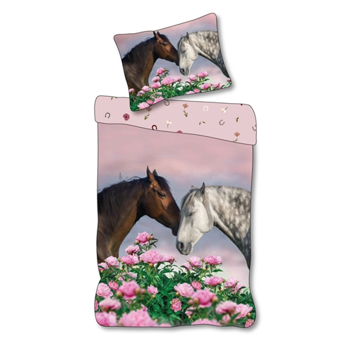 Home » Bedding » Children's bedding » Children's bedding 140x200 cm Horse bedding 140x200 cm - Reversible design with horses and flowers - 100% cotton bed linen Save37% Licens 54,4934,49EURSave 20,- In stock Quantity Add to basket See more from: Licens Item number: 2432-1 Read our bedding guide See our large selection of fitted sheets See our large selection of duvets 140x200 Do you have questions about the product? Soft & breathable100% soft cottonOEKO-TEX® certified Duvet cover: 140x200 cm Pillowcase: 60x63 cm Material: 100% soft cotton Color: Light pink Motif: Horses Design: Reversible - Front with motif of two horses, back with all-over print of horseshoes and flowers Closure: Duvet cover with buttons, pillowcase with overlap Wash: 60° Tumble dry: Yes Ironing safe: Yes Certification: STANDARD 100 by OEKO-TEX® (17.HPK.23879). Your guarantee that the product is free from harmful chemicals. Bedding set in 100% soft cotton, with a motif of sweet horses. With light and breathable cotton threads, this bedding set provides a soft surface that makes the duvet comfortable for the child to sleep with. A durable bedding set with high breathability and absorbency, which will help make bedtime a pleasant experience. Bedding set with horse motif. The bedding set is reversible and on the front features a motif of two horses standing over some flowers. On the back, there is an all-over print of horseshoes and flowers. The bedding set is made from 100% soft cotton, making it durable and highly breathable. The pure cotton quality provides a lovely and soft bedding set that helps promote sleeping comfort for the child. The cotton bed linen can be washed at 60° in the washing machine, which also helps maintain a high level of hygiene. The bed linen is additionally OEKO-TEX certified, which guarantees that the set is free from harmful chemicals. Browse favorites and much more in our large selection of accessories for the children's universe For the child, the bed should be a safe place and all elements together should create soft and lovely surroundings for the child to find peace in. Therefore, use the child's interests to create a safe sleeping room for the child. With us, you can find a large selection of accessories for the bed and children's room, ranging from fitted sheets to duvets, pillows, bed linen, and much more, with plenty of products featuring all the children's favorites. All elements that can help create the right sleeping environment and room for your child. Here you can find lovely and soft quality fitted sheets Return to Children's bedding 140x200 cm