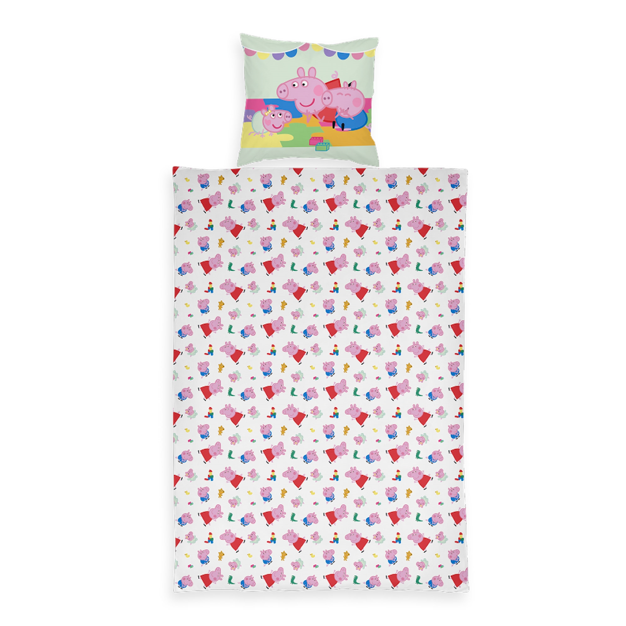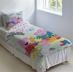 Junior bedding set with Peppa Pig made from 100% soft cotton. The bedding is of high quality with good breathability, durable weaving, and colorfastness - which means it will keep its colors much better. The soft junior bed linen is perfect for children as the material is soft cotton and OEKO-TEX® certified, and the design is calm with nice and soft colors. The bedding is designed with a lovely motif of the entire Peppa Pig family - Daddy Pig, Mummy Pig, Peppa Pig, George Pig, and Suzy Sheep - on the front, while the back has an all-over print. The fact that the junior bedding set is OEKO-TEX® certified means it has been tested free from harmful substances, so your child can safely sleep with it every night.