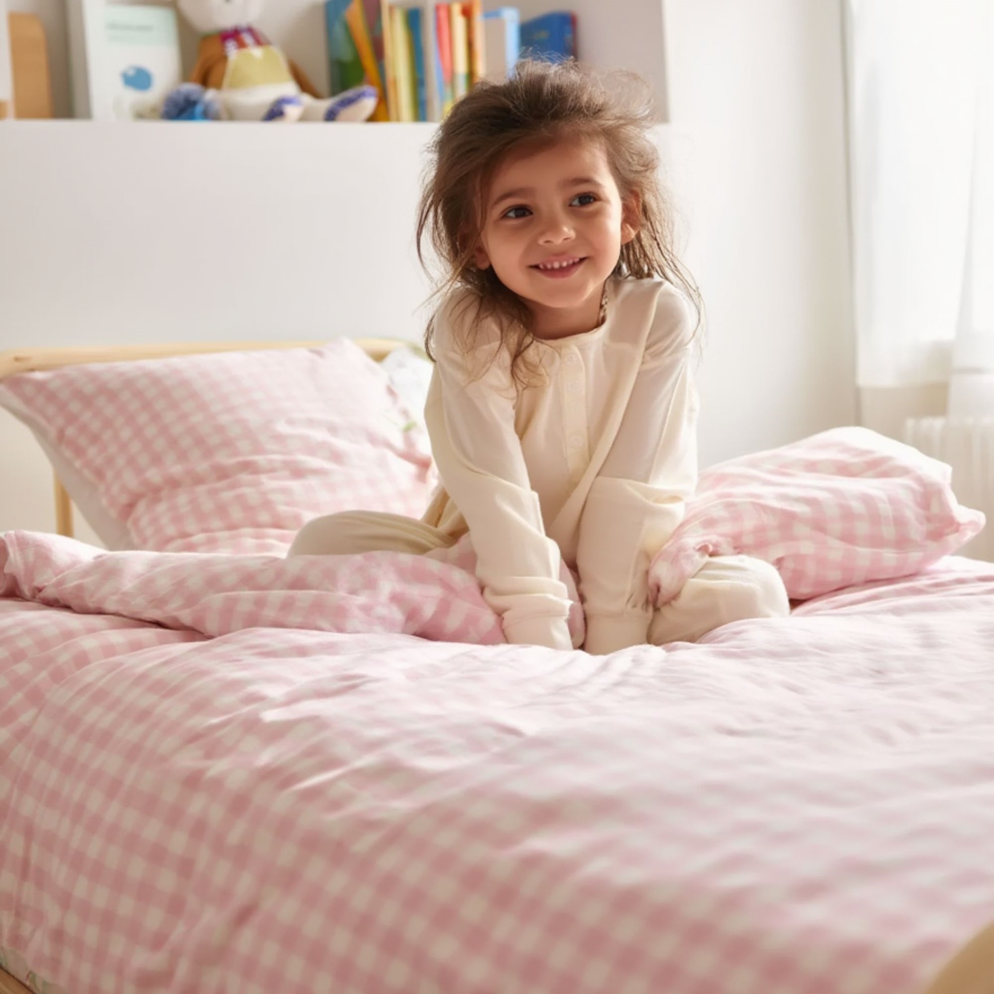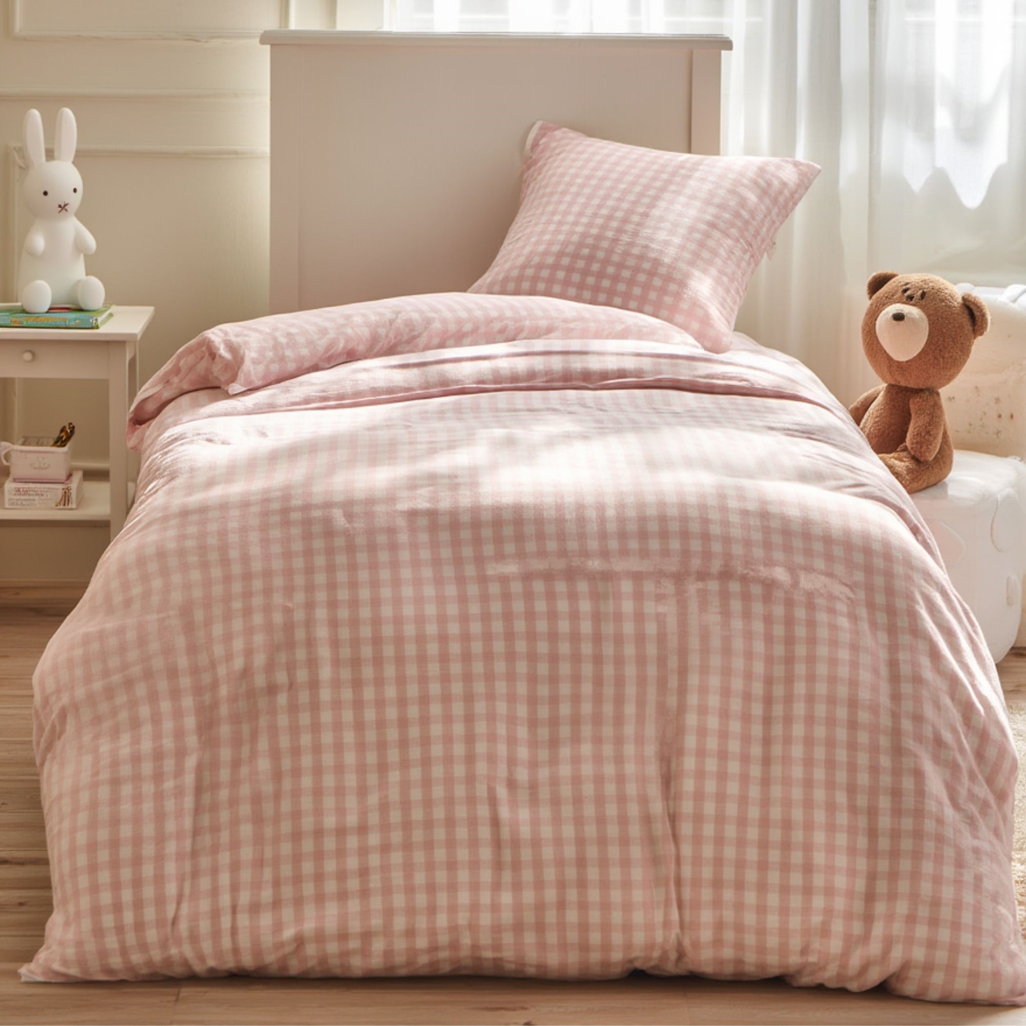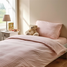 Home » Bedding » Children's bedding » Junior bedding 100x140 cm Junior bedding 100x140 cm - Bedding set with white and light pink checks - 100% soft cotton bed linen Save35% By Mats 27,4917,99EURSave 10,- In stock Quantity Add to basket See more from: By Mats Item number: 12163-8 Read our bedding guide See our large selection of fitted sheets See our large selection of duvets 100x140 Do you have questions about the product? High breathability100% soft cottonOEKO-TEX® certified Duvet cover: 100x140 cm - junior bedding set Pillowcase: 40x45 cm Material: 100% soft cotton Color: White and light pink Design: Checks Closure: Duvet with buttons and pillowcase with overlap Wash: 60° Tumble dry: Yes Ironing safe: Yes Certification: STANDARD 100 by OEKO-TEX® (2016OK0709 AITEX). Your guarantee that the product is free from harmful chemicals. Soft junior bedding in 100% cotton, with checks. Made with light and breathable cotton threads that give the bedding set a feeling of softness, making the duvet feel lovely for your child to sleep with. The balance of natural properties and comfort from the soft material, combined with the cozy design, makes this set a sure favorite for your child. Beautiful junior bedding set with checks, which is not only soft and comfortable but also decorative and will brighten up the children's room. The bedding set is made of 100% cotton, making the set durable, soft, and providing high absorbency and breathability. The pure cotton quality gives a lovely and soft bedding set, which is also easy to maintain and creates a pleasant sleeping environment for your child. Cotton bedding can be washed at 60° in the washing machine, which also helps maintain a high level of hygiene. The bedding is further produced with OEKO-TEX certification, which guarantees that the set is free from harmful chemicals. Browse favorites and much more in our large selection of accessories for the children's universe For the child, the bed should be a safe place and all elements together should create soft and lovely surroundings for the child to find peace in. Therefore, feel free to use the child's interests to create a safe sleeping room for the child. With us, you can find a large selection of accessories for the bed and children's room, ranging from fitted sheets to duvets, pillows, bedding, and much more, with plenty of products featuring all the children's favorites. All elements that can help create the right sleeping environment and room for your child. Here you can find lovely and soft quality fitted sheets Return to Junior bedding 100x140 cm Customers also bought Checked bedding - 100% cotton - Junior bedding 100x140 cm - Blue and white checks In stock 27,4917,99EUR Add to basket Junior all-season duvet 100x140 cm - With 100% musk duck down - Allergy-friendly down duvet - Nordstrand Home junior duvet In stock 149,9981,99EUR Add to basket Junior bedding 100x140 cm - Bedding set with white and blue stripes - 100% soft cotton bed linen In stock 27,4917,99EUR Add to basket Junior bedding 100x140 cm - White bed set with green stripes - 100% soft cotton bed linen In stock 27,4917,99EUR Add to basket Baby bedding 70x100 cm - Bedding set with pink and white checks - 100% soft cotton bed linen In stock 20,4910,99EUR Add to basket Rabbit bedding - 100% cotton - Junior 100x140 cm - Light pink In stock 47,9927,49EUR Add to basket Junior bedding 100x140 cm - 100% cotton satin - Classic pink stripes In stock 61,4934,49EUR Add to basket Heart bedding - 100% cotton - Junior bedding 100x140 cm In stock 34,4920,49EUR Add to basket Baby bedding 70x100 cm - White bedding set with purple stripes - 100% soft cotton bed linen In stock 20,4910,99EUR Add to basket Baby bedding 70x100 cm - Bedding set with blue and white checks - 100% soft cotton bed linen In stock 20,4910,99EUR Add to basket You might also be interested in: White bedding - 100% Egyptian cotton satin - Junior bedding 100x140 cm - Turistripa - Narrow stripesTemperature-regulating and breathable material Extra fine 230TC satin weave for incredible softness Smooth and luxurious surface against the skin Guideline sales price : 61,22 Save : 13,23 68,49 EUR47,99 EUR (incl. VAT) Junior mattress protector - 70x140 cm - Boiled Cotton - Borg LivingBreathable and hypoallergenic Soft cotton OEKO-TEX® certified 47,99 EUR27,49 EUR (incl. VAT)