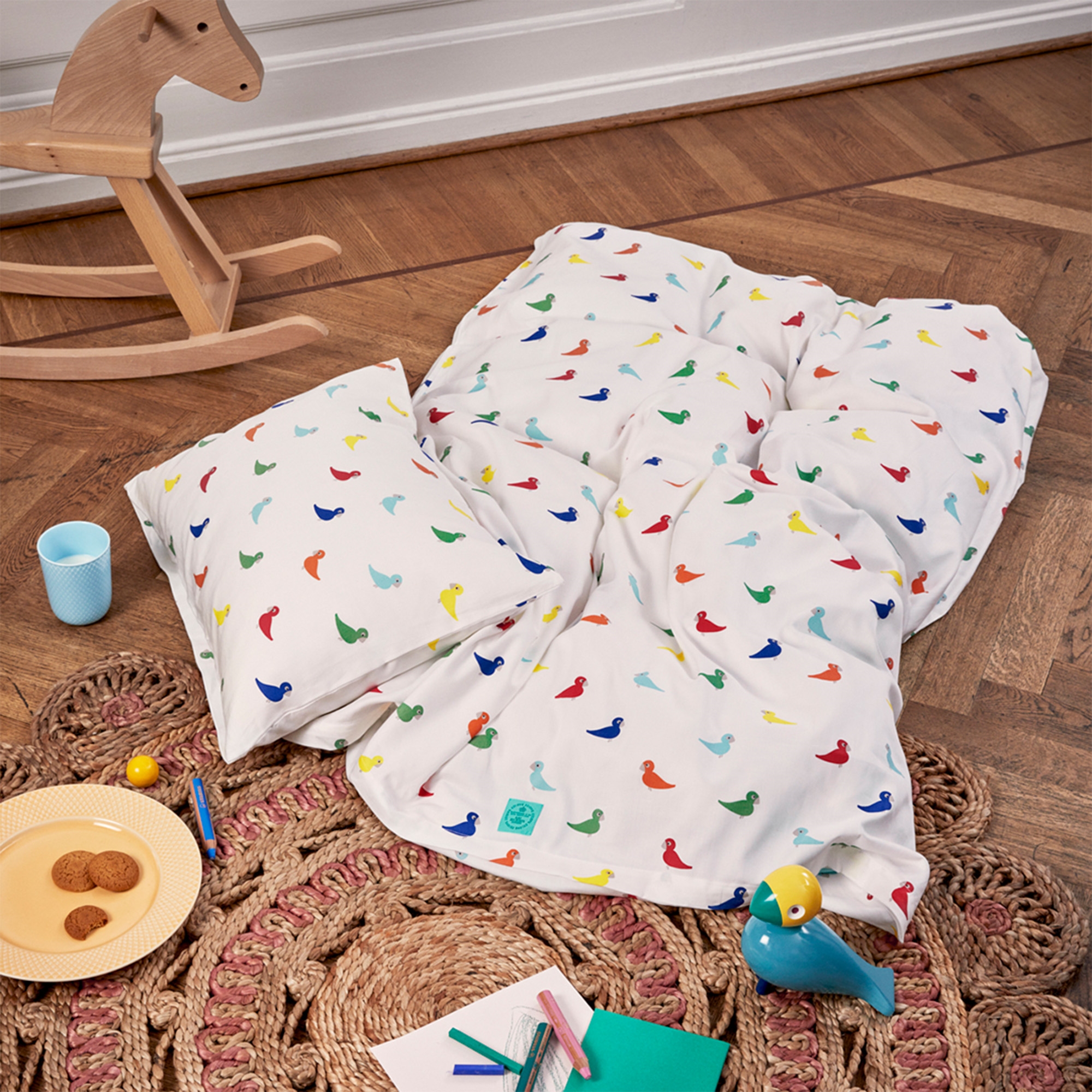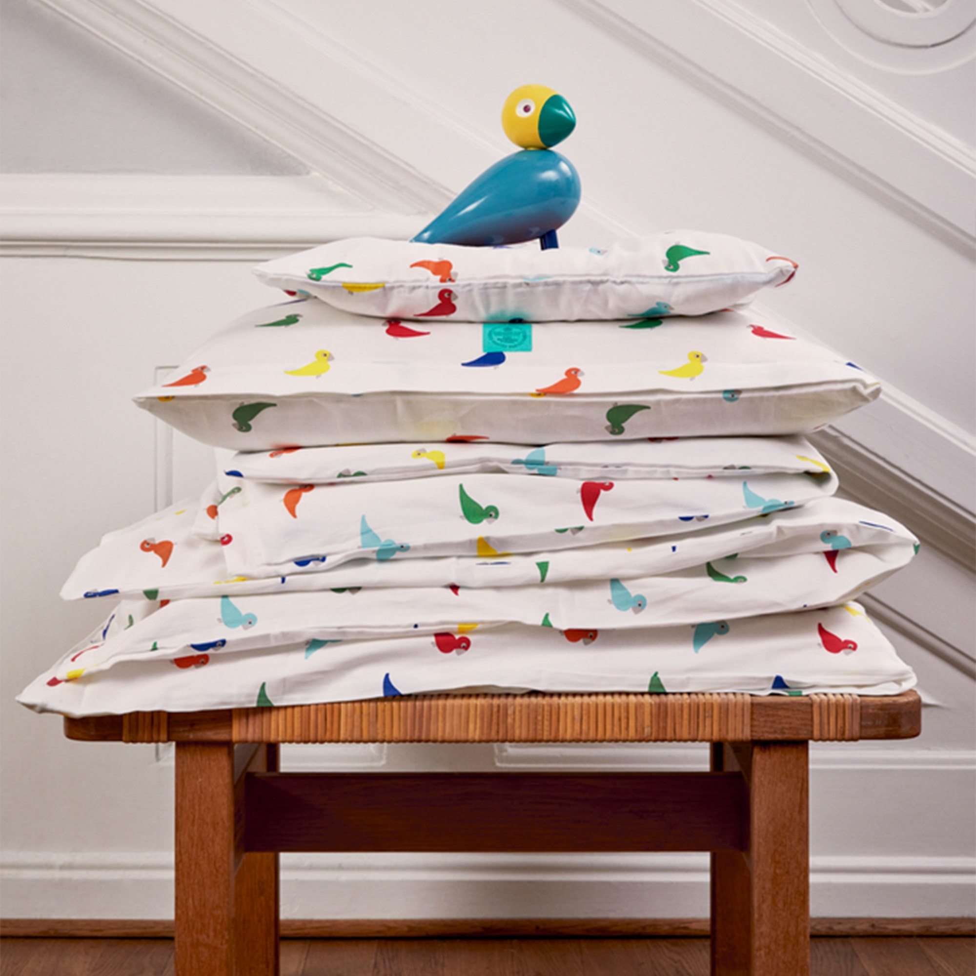 Kay Bojesen baby bedding - organic bedding set with colorful songbirds
