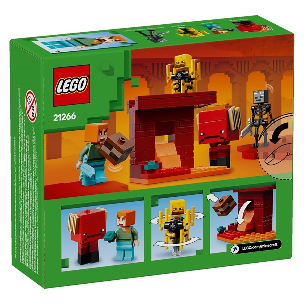 Home » Toy » LEGO » LEGO Minecraft LEGO Minecraft - Nether Lava Battle - 21266 - 99 pieces LEGO Minecraft Great price:10,99EUR Few in stock Quantity Add to basket See more from: LEGO Minecraft Item number: LEG21266 Do you have questions about the product? Nether Lava Battle is a small LEGO® Minecraft® set that includes a build-and-play version of the popular video game. The versatile Minecraft activity set contains popular figures from the game, fun details and endless action, making it the perfect gift for children aged 6 and up. Children join Minecraft action hero Alex on a mission to remove ancient ruins from part of the Nether dimension's fortress bridge in the Blood-Red Forest. When the stones are removed, lava elements automatically fall, and Minecraft figures - a wither skeleton with a stone sword and a blaze swinging a rod - prevent Alex from escaping. Children use an iconic diamond sword to fight the two mobs before they flee on another Minecraft figure, a lava walker, which has movable legs and a saddle. Minecraft players know they must grab a special fungus to be able to steer the lava walker. With the LEGO Builder app children can get extra fun by zooming in on and rotating models in 3D on their device. Return to LEGO Minecraft