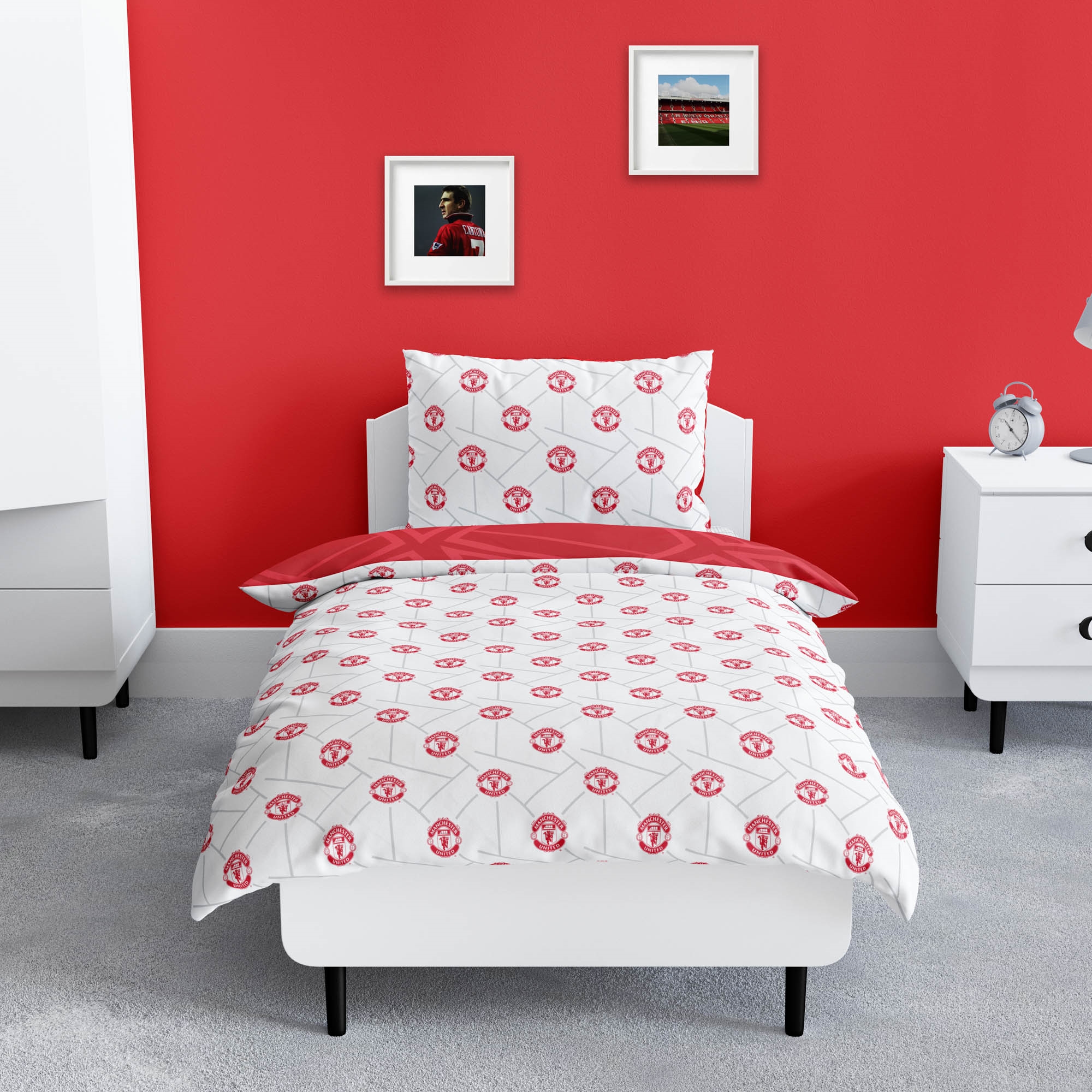Home » Bedding » Single bedding » Single bedding 150x210 cm (Swedish size) Manchester United bedding - 150x210 cm - Red reversible bedding set with logo - 100% cotton bed linen - Football bedding Save28% Licens 47,9934,49EURSave 14,- In stock Quantity Add to basket See more from: Licens Item number: 22277-3 Read our bedding guide See our wide selection of fitted sheets See our wide selection of duvets Do you have questions about the product? Perfect for the football fan100% soft cottonOEKO-TEX® certified Duvet cover: 150x210 cm - Swedish size Pillowcase: 50x60 cm Material: 100% soft cotton Color: Red Motif: Manchester United logo Design: Reversible - Front with Manchester United logo, back with all-over print Closure: Duvet with buttons and pillowcase with overlap Wash: 60°C Tumble dry: Yes Ironing safe: Yes Certification: STANDARD 100 by OEKO-TEX® (2018OK0249 AITEX). Your guarantee that the product is free from harmful chemicals. Soft bedding in 100% cotton, featuring the Manchester United logo design. Perfect for the little football fan who loves to play. Made with light and breathable cotton fibers, this bedding set provides a softness that allows the duvet to naturally drape around your child. The balance of natural comfort from the soft material and the cozy football design makes this set a sure favorite for your child. Show your support for your favorite football team with this Manchester United bedding. The bedding is reversible with a large logo on the front and an all-over print on the back. The bedding set is made from 100% pure cotton, ensuring high breathability, durability, and a soft and comfortable surface. The bedding set is also OEKO-TEX certified, which guarantees that the set is free from harmful substances and safe to use. See our wide selection of accessories for the children's universe For the child, the bed is a safe place. All elements must together create lovely and pleasant surroundings for the child to find peace in. At HOME-TEX.com you can find all accessories for the bed that help create the right sleeping environment for your child. Here you can find lovely and soft quality fitted sheets Return to Single bedding 150x210 cm (Swedish size) Customers also bought Real Madrid Bedding - 150x210 cm - White Reversible Bedding Set with Logo - 100% Cotton Bed Linen - Football Bedding In stock 47,9934,49EUR Add to basket White Real Madrid Towel - 70x140 cm - 100% Cotton - Soft Bath Towel with Real Madrid Logo In stock 27,4913,99EUR Add to basket Manchester United towel - 70x140 cm - 100% cotton - Soft bath towel with Manchester United logo In stock 27,4920,49EUR Add to basket