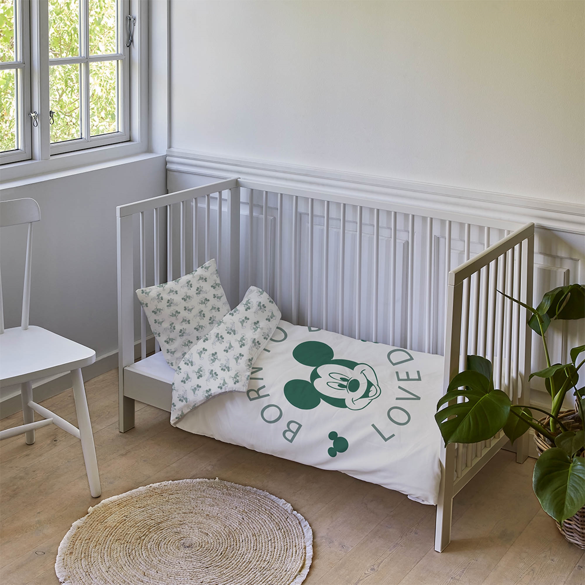 Home » Mickey bedding 100x140 cm - Junior bedding set with Mickey Mouse - Reversible design - 100% cotton bed linen Save43% Licens 47,9927,49EURSave 21,- In stock Quantity Add to basket See more from: Licens Item number: 1274-8 Read our bedding guide See our large selection of fitted sheets See our large selection of duvets 100x140 Do you have questions about the product? Soft & breathable100% soft cottonOEKO-TEX® certified Duvet cover: 100x140 cm - junior bedding set Pillowcase: 40x45 cm Material: 100% soft cotton Color: White and green Design: Mickey Mouse Style: Reversible - Front side with Mickey Mouse design and back side with small motifs Closure: Duvet with buttons and pillowcase with overlap Wash: 60° Tumble dry: Yes Iron safe: Yes Certification: STANDARD 100 by OEKO-TEX® (2022OK2496 AITEX). Your guarantee that the product is free from harmful chemicals. Soft junior bedding in 100% cotton, with a smart and recognizable Mickey Mouse design. Made with light and breathable cotton fibers, this bedding set provides a softness that allows the duvet to fall naturally around your child. The balance of natural comfort from the soft material and the cozy Mickey design makes this set a sure favorite for your child. Make bedtime extra cozy with this Mickey Mouse junior bedding. The bedding set is made of 100% soft cotton, ensuring good comfort throughout the night. The material is breathable, durable, and keeps colors vibrant - even after many washes. The bedding is perfect for children who love Mickey Mouse. It features a beautiful color with a lovely Mickey motif and the text Born To Be Loved on the front. The back has an overall print of small Mickey Mouse motifs. Cotton bedding can be washed at 60° in the washing machine, which also helps maintain a high level of hygiene. The bedding is additionally OEKO-TEX certified, which guarantees that the set is free from harmful chemicals. Browse favorites and much more in our large selection of accessories for the children's universe For the child, the bed should be a safe place and all elements should together create soft and lovely surroundings for the child to find peace in. Therefore, use the child's interests to create a safe bedroom. With us, you can find a large selection of accessories for the bed and children's room, ranging from fitted sheets to duvets, pillows, bedding, and much more, with many products featuring all the children's favorites. All elements that can help create the right sleeping environment and room for your child. Here you can find lovely and soft quality fitted sheets Return to