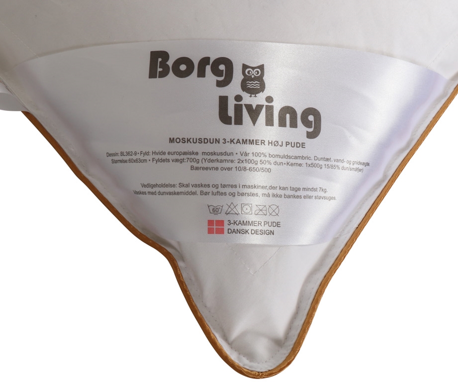 Home » Pillow » Size » Pillows 50x70 cm (Norwegian) Muscovy down pillow - High - 50x70 cm - 3-chamber pillow - Borg Living Save50% Borg Living 108,9954,49EURSave 55,- In stock Quantity Add to basket See more from: Borg Living Item number: BL362-10 Read our pillow guide Learn about duvet and pillow maintenance Discover our extensive range of pillowcases Do you have questions about the product? Muscovy down pillow with 3 chambersTog rating: Over 10Borg Living Size: 50x70 cm Type: High pillow Structure: 3-chamber pillow Brand: Borg Living Filling weight: 660g Outer chamber: 2x95g muscovy down Filling in the core: 470g duck down/small feathers Outer tog rating: Over 10 (Old method) 650 (New method) Core tog rating: Over 8 (Old method) 500 (New method) Bolster: 100% down-proof cotton cambric Washing: 60°(Important to useenzyme-free detergent) Tumble drying: Must be tumble dried with laundry balls Warranty: 2 years Certification: STANDARD 100 by OEKO-TEX® (HKX 19275) The pillow is constructed with 3 chambers. The two outer sections are filled with soft eiderdown-like muscovy down, while the middle chamber is filled with supportive small feathers. A 3-chamber pillow provides your neck and shoulders with the necessary support to lie comfortably throughout the night, without the need to adjust the pillow constantly. Its unique structure allows the pillow to maintain its shape. Explore our extensive selection of 140x200 cm bedding here The Danish brand Borg Living crafts exclusive series of duvets, pillows and home textiles for your home. Established in 2013, the brand is renowned for its innovation in quality and design. Borg Living's impressive assortment of products enhances an optimal and comfortable sleep experience, while adorning your home with stylish and exquisite home furnishings. Return to Pillows 50x70 cm (Norwegian) Customers also bought All-season duvet 140x200 cm - Muscovy down duvet - Borg Living duvet with muscovy down In stock 408,49136,49EUR Add to basket Winter duvet 140x200 cm - muscovy down duvet from Borg Living with 100% down In stock 462,99190,49EUR Add to basket Muscovy down pillow - Medium - 50x70 cm - 3 chamber pillow - Borg Living In stock 102,4947,99EUR Add to basket Double duvet 200x220 cm - Muscovy down duvet - Year-round double duvet - Borg Living down duvet In stock 707,49231,49EUR Add to basket Muscovy down duvet 100% down - 140x200 cm - Hypoallergenic - All-season duvet - Zen Sleep duvet In stock 312,99108,99EUR Add to basket Pillow with muscovy down - 50x70 cm - "medium" - 3 chambers - Borg Living In stock 95,4940,99EUR Add to basket Double duvet 200x220 cm - European down duvet - All-season double duvet - Zen Sleep duvet In stock 394,99136,49EUR Add to basket Down detergent for duvets and pillows In stock 10,9910,49EUR Add to basket Double duvet 240x220 cm - All-season double duvet - Borg Living Muscovy down - King size duvet In stock 734,99258,99EUR Add to basket Muscovy down duvet 140x220 cm - Winter duvet - Borg Living duvet with 100% down In stock 489,99231,49EUR Add to basket