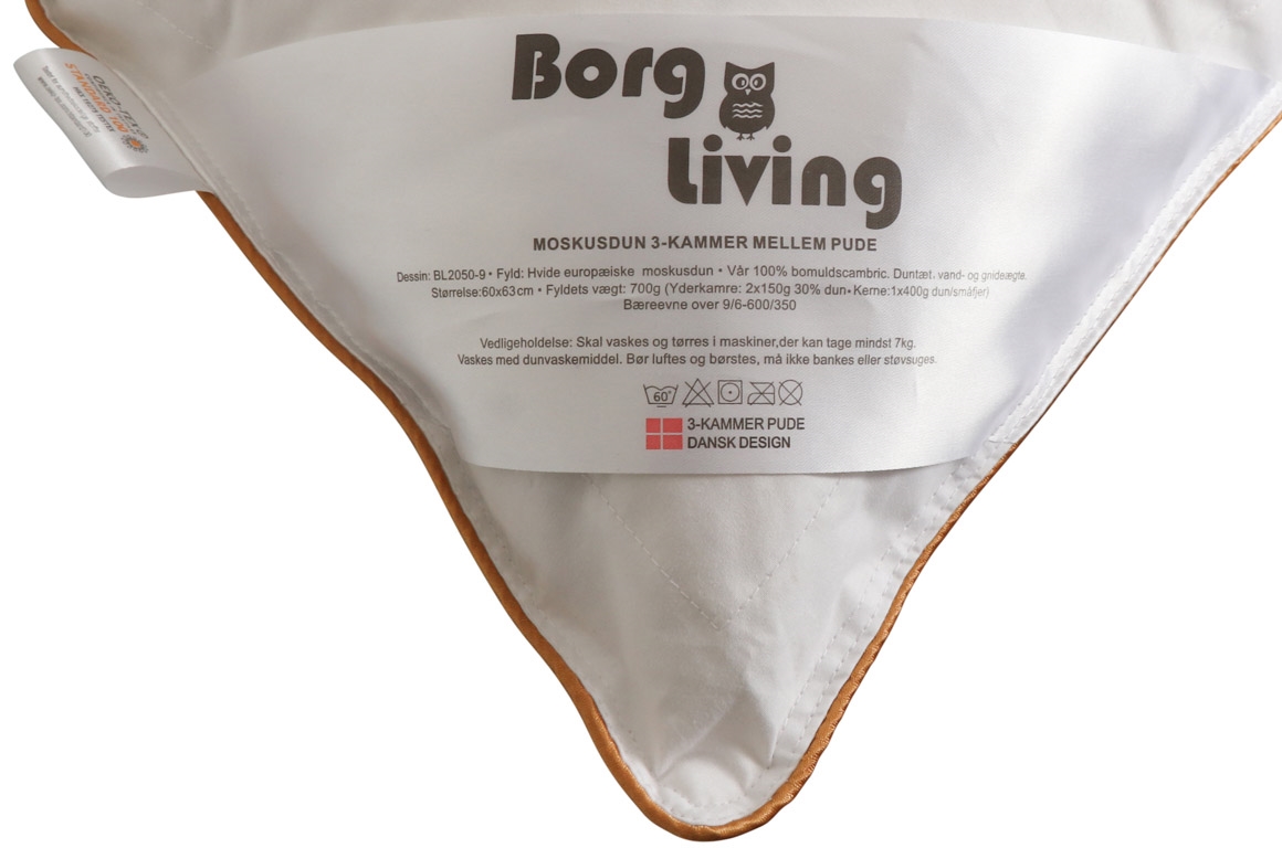 Home » Pillow » Size » Pillows 50x70 cm (Norwegian) Pillow with muscovy down - 50x70 cm - "medium" - 3 chambers - Borg Living Save57% Borg Living 95,4940,99EURSave 55,- In stock Quantity Add to basket See more from: Borg Living Item number: BL2050-10 Read our pillow guide Learn about duvet and pillow maintenance Discover our extensive range of pillowcases Do you have questions about the product? 3-chamber muscovy down pillowTog rating: Over 6Borg Living Size: 50x70 cm Type: Medium pillow Structure: 3 chamber pillow Brand: Borg Living Fill weight: 660g Outer chamber: 2x140g 100% muscovy down Core filling: 380g duck down/small feathers Tog rating: Outer chamber: Over 9 (Old method) 600 (New method) Core: Over 6 (Old method) 350 (New method) Bolster: 100% down-proof cotton cambric. Washing: 60° (Important to use Enzyme-free detergent) Tumble drying: Must be tumble dried with laundry balls Warranty: 2 years Certification: STANDARD 100 by OEKO-TEX® (HKX 19275) The pillow is constructed with 3 chambers. The two outer sections are filled with soft eiderdown-like muscovy down, while the middle chamber is filled with supportive small feathers. A 3-chamber pillow provides your neck and shoulders with the necessary support to lie comfortably throughout the night, without the need to adjust the pillow constantly. Its unique structure allows the pillow to maintain its shape. Explore our extensive selection of 140x200 cm bedding here The Danish brand Borg Living crafts exclusive series of duvets, pillows and home textiles for your home. Established in 2013, the brand is renowned for its innovation in quality and design. Borg Living's impressive assortment of products enhances an optimal and comfortable sleep experience, while adorning your home with stylish and exquisite home furnishings. Return to Pillows 50x70 cm (Norwegian) Customers also bought Mattress topper - 180x200 cm, 5 cm high - NASA Memory Foam - Borg Living - Ergonomic mattress topper In stock 544,49190,49EUR Add to basket Scented Sticks - Lavender Scented Oil - 140 ml. In stock 34,4917,99EUR Add to basket Frost Towel - 70x140 cm - 100% Cotton - Soft Bath Towel with Anna and Elsa In stock 27,4917,99EUR Add to basket Winter silk duvet - 140x200cm - Butterfly Silk - Winter duvet with 100% mulberry silk In stock 217,99163,49EUR Add to basket Organic Baby Bedding - Extra Soft White Jacquard Woven Bedding Set 70x100 cm - 100% Organic Cotton Satin (GOTS) - Turiform Bed Linen In stock 47,9924,49EUR Add to basket Diamond Light blue bath towels - 70x140 cm - Diamond - Light Blue - 100% Cotton - Soft bath towels from Egeria In stock 27,4917,99EUR Add to basket Diamond Face cloth - 30x30 cm - Diamond - Purple - 100% Cotton - Soft face cloths from Egeria In stock 9,995,49EUR Add to basket Diamond Bath towel - 70x140 cm - Diamond - Purple - 100% Cotton - Soft towels from Egeria Few in stock 27,4917,99EUR Add to basket Junior bedding 100x140 cm - White striped bedding set with dinosaurs and rockets - 100% soft cotton bed linen In stock 27,4917,99EUR Add to basket Junior bedding 100x140 cm - White bedding set with green stripes - 100% soft cotton bed linen In stock 27,4917,99EUR Add to basket