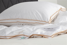 The medium-height pillow is produced with 3 chambers, filled with European musk duck down. The core chamber contains a combination of small fine down and small feathers, providing the pillow with good height and a stable core for excellent neck and head support. The 2 outer chambers are filled with 100% pure and fine musk duck down, offering the perfect softness and adaptability on the usage surfaces.