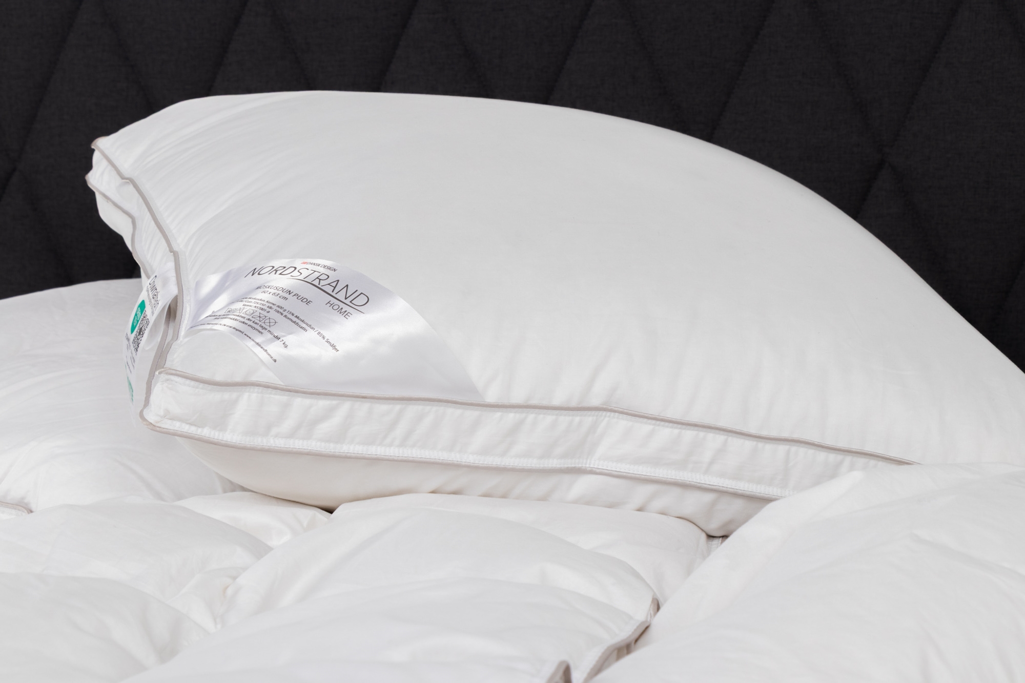 Home » Pillow Pillow with Musk Duck Down - 60x63 cm - Medium Pillow - 3 Chamber Down Pillow - Nordstrand Home Year Pillow Save50% Nordstrand Home 136,4968,49EURSave 68,- In stock Quantity Add to basket See more from: Nordstrand Home Item number: NS7001-9 Read our pillow guide Read about maintenance of duvets and pillows See our large selection of pillowcases Do you have questions about the product? High comfort & supportSoft down with adaptabilityStable core & good height Size: 60x63 cm Type: Medium pillow Construction: 3 chamber pillow with box edge Brand: Nordstrand Home Fill weight: 780g Outer chamber: 2x90g 100% musk duck down Core fill: 600g musk duck down/small feathers Fill power outer chamber: 11 / CUIN: 725 Fill power core: 11+6 / CUIN: 725+350 Cover: 100% cotton satin extra fine 80/80 Washing: 60° (Important to use enzyme-free detergent) Tumble drying: Yes Warranty: 5 years Certification: NOMITE - Free from house dust mites Certification: Downpass - Highest animal welfare standards Certification: DOWNAFRESH - 100% clean down Certification: EN12934 standard - Class 1 down Certification: STANDARD 100 by OEKO-TEX® (23.HCN.47531 Hohenstein HTTI). Your guarantee that the product is free from harmful chemicals. SOFTNESS: 100% musk duck down & cotton satin cover In the outer chambers of the pillow, you will find lovely small soft 100% pure musk duck down, which provides a wonderfully soft surface to lie on - on both sides. The soft down adapts well to you, providing extra comfort where you rest your head. The fine cotton satin cover makes the pillow's surface feel really soft. The dense weaving and the clean down (including DOWNAFRESH & NOMITE certification) also make the pillow suitable for allergy sufferers. SUPPORT: The pillow's 3 chambers The down pillow is divided into three chambers to create a pillow with adequate height and good support. The innermost chamber of the pillow ensures that the pillow maintains its height and creates a stable core - making the pillow suitable for you, whether you sleep best on your back or side. The two outer chambers, which embrace the stable core, are produced with 100% soft down. SMART: Box edge (panel sides) One of the latest constructions in pillows is the box edge - which indicates that the pillow is not assembled with an outer seam piping edge, but with two distributed 2.5 cm apart. The advantage of this construction form is that the filling in the down pillow can be better distributed all the way to the edge, and therefore does not create a pillow with most filling in the middle. This construction also makes the pillow more moldable, despite the pillow's three chambers. Also see our large selection of pillowcases in 60x63 cm here With Nordstrand Home, you are assured home textiles in Danish design - in Nordic style. Nordstrand Home places great emphasis on the feeling of well-being in a beautiful and relaxing environment. With Nordstrand Home products, you don't have to compromise, you will always find products among the large assortment of high quality and classic design in a modern interplay. Nordstrand Home – So you feel at home! Return to Pillow
