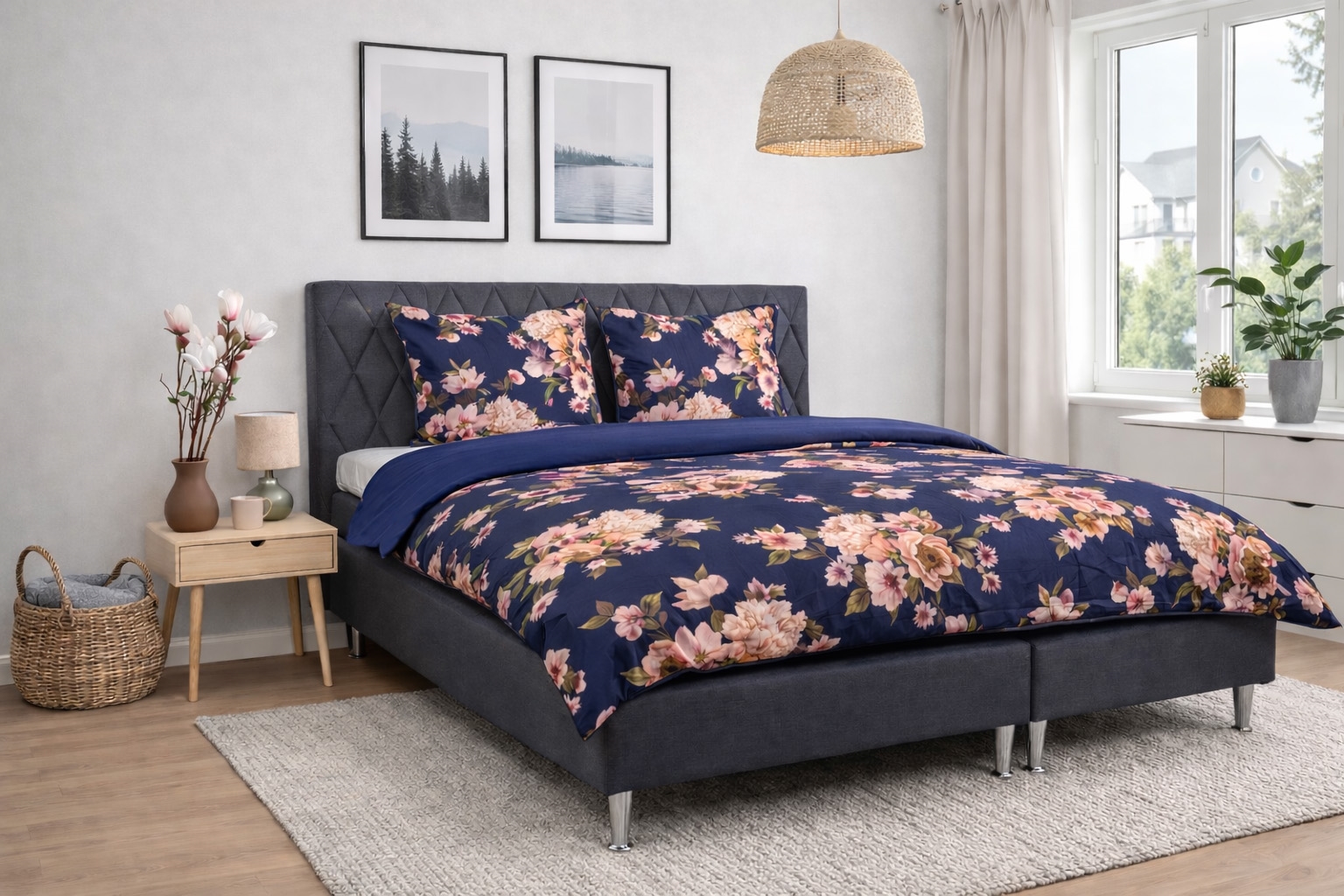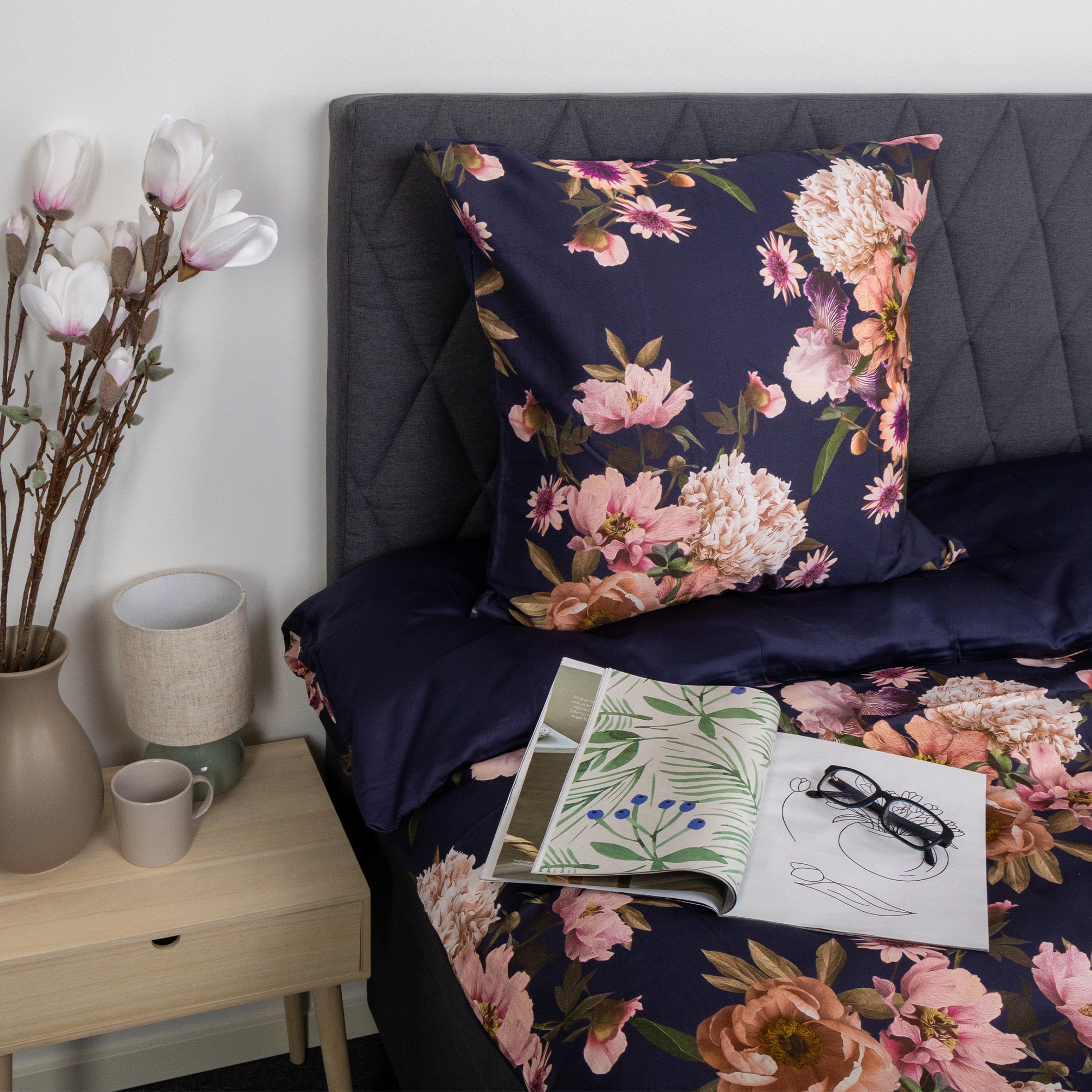 If you have extra pillows on the bed, you can easily supplement with an extra pillowcase in the same high quality. It creates a uniform and elegant look in the bedroom while providing the pillows with the same comfort and finish. The pillowcase combines a beautiful dark blue floral print on one side with a calm, solid-colored reverse so you can easily change the look according to mood and decor.