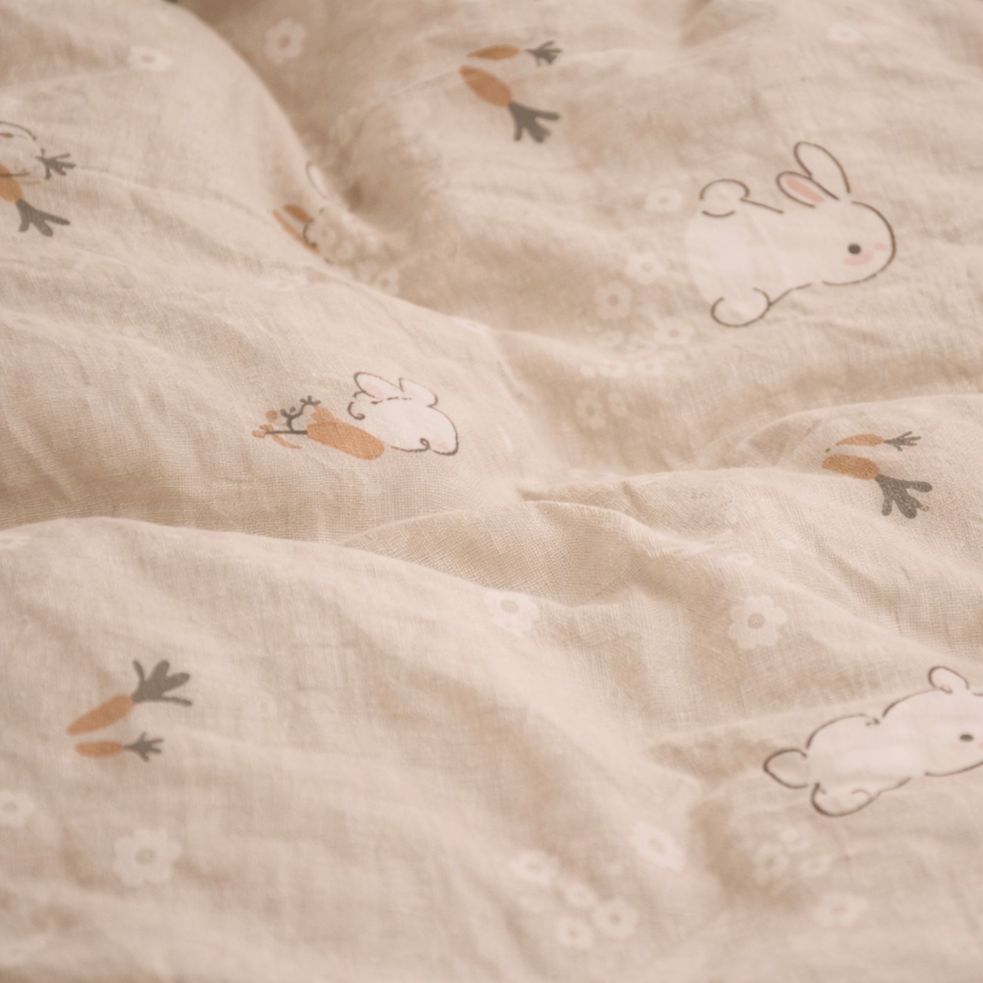 This lovely junior bedding set has a sweet and calm design with small rabbits, carrots and subtle floral details. The soft beige background gives the bedding a natural and harmonious look, which suits a cozy children's room perfectly.