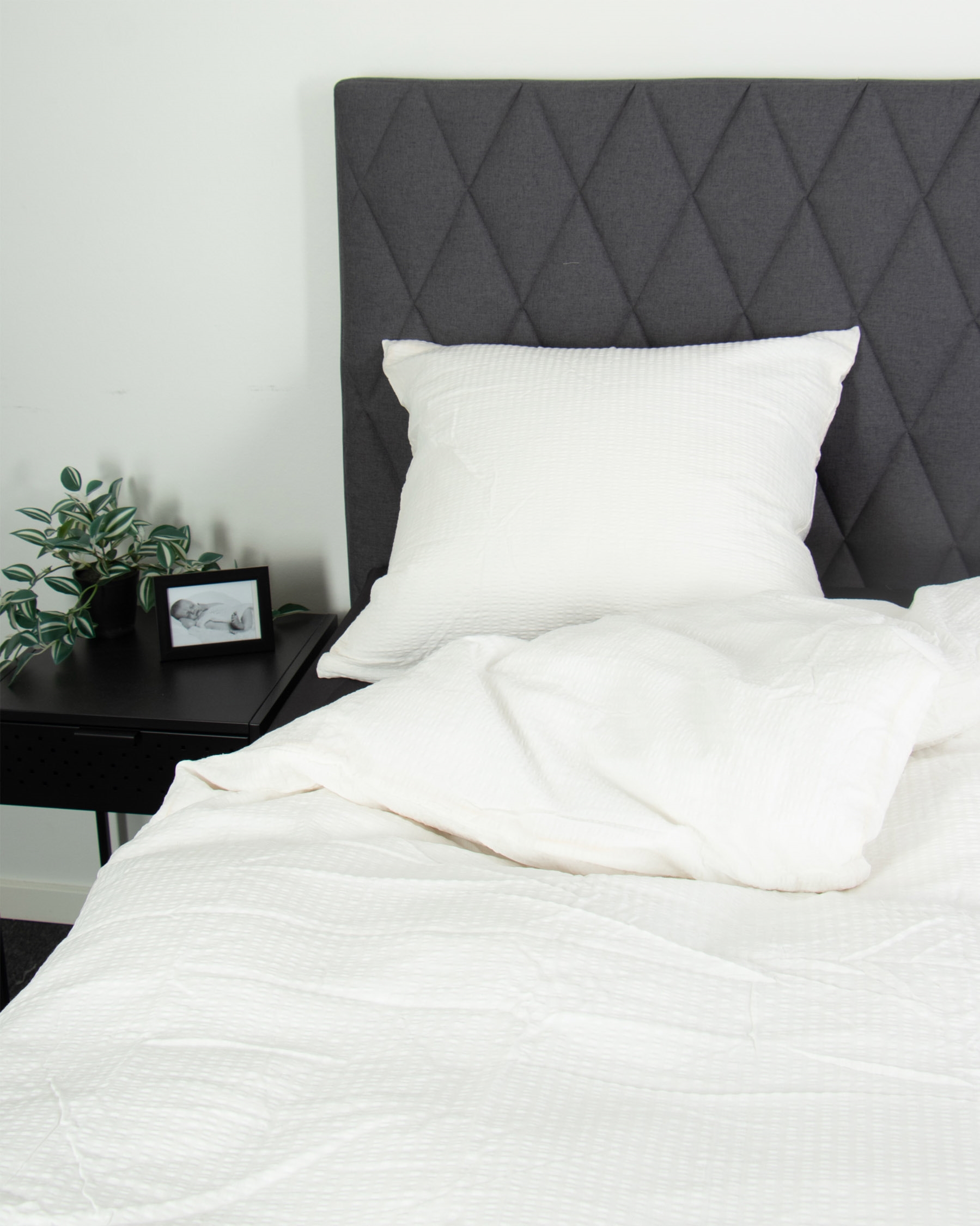 Home » Bedding Seersucker bed linen 140x220 cm - White bed set made of 100% cotton crepe - By Night bed linen Save57% By Night 95,4940,99EURSave 55,- In stock Quantity Add to basket See more from: By Night Item number: 267-2 Read our bedding guide Explore our extensive collection of sheets See our extensive selection of 140x220 duvets Do you have questions about the product? Crepe weave provides extra airflowpillowsWrinkle effect - Iron-freepillowsLight and airy bedding Duvet cover: 140x220 cm Pillowcase: 1 piece 60x63 cm Material: 100% Seersucker - Cotton crepepillows Weaving: 200 TCpillows (Thread count = number of threads per square inch)pillows Colour: White Design: Solid colourpillows Brand: By Night Closure: Duvet and pillowcase with inner zip Wash: 60° Tumble drying: Yes Ironing: Yes Certification: STANDARD 100 by OEKO-TEX¬Æpillows(2018OK0658) Seersucker, also known as crepe bedding, is crafted from 100% soft cotton crepe. The weave, with its wrinkle effect, creates unique air pockets, making the crepe fabric feel light and airy. It's cool in the summer and warm in winter, offering the perfect combination. This extra-length bed set doesn't require ironing, thanks to its air pockets that provide a unique wrinkle effect. It feels wonderfully soft against the skin - A must-have set for anyone seeking exquisite bedding. "By Night" bed linen is designed to keep its colour, ensuring the cotton fabric stays vibrant after repeated washes. Buy lightweight pillowcases for your pillows here Refresh your bed and bedroom with a bed set as splendid as this. Simultaneously, take the opportunity to maximise your sleep comfort by adding a new, soft, high-quality sheet. Explore our extensive range of quality sheets here By Night is distinguished by Danish design - offering comfortable sleep components of the highest quality for your night-time environment. By Night produces bedding and sheets for the entire family, placing great emphasis on current trends, ensuring that their production always includes fashionable colours and designs. Return to Bedding Customers also bought 5 pieces Chef's tea towels - 50x100 cm white tea towels with blue chequered pattern In stock 20,499,99EUR Add to basket Scented Sticks - Lavender Scented Oil - 140 ml. In stock 34,4917,99EUR Add to basket Diamond Face cloth - 30x30 cm - Diamond - Anthracite - 100% Cotton - Soft face cloths from Egeria In stock 9,995,49EUR Add to basket Diamond Towel - 50x100 cm - Diamond - Sand - 100% Cotton - Soft towels from Egeria In stock 20,499,99EUR Add to basket Floral bedding - 140x220 cm - Summer rose - 100% Cotton satin bedding - By Night In stock 95,4936,99EUR Add to basket Baby bedding 70x100 cm - Construction - 100% Cotton satin - By Night bedding set In stock 40,9927,49EUR Add to basket Glow-in-the-dark Unicorn bedding - 140x200 cm - Glow-in-the-dark unicorn design - 100% cotton bed set. In stock 54,4927,49EUR Add to basket Gabby's Dollhouse bedding - 140x200 cm - Gabby and Pandy Paws - 2-in-1 design - Duvet cover in 100% cotton. In stock 47,9927,49EUR Add to basket Horse Junior Bedding 100x140 cm - Junior Bedding Set with Cute Horses - 100% Cotton Satin In stock 47,9920,49EUR Add to basket Bamboo bedding - 140x220 cm - 100% Natural bamboo - OlsenHome - White satin woven duvet cover In stock 61,4934,49EUR Add to basket