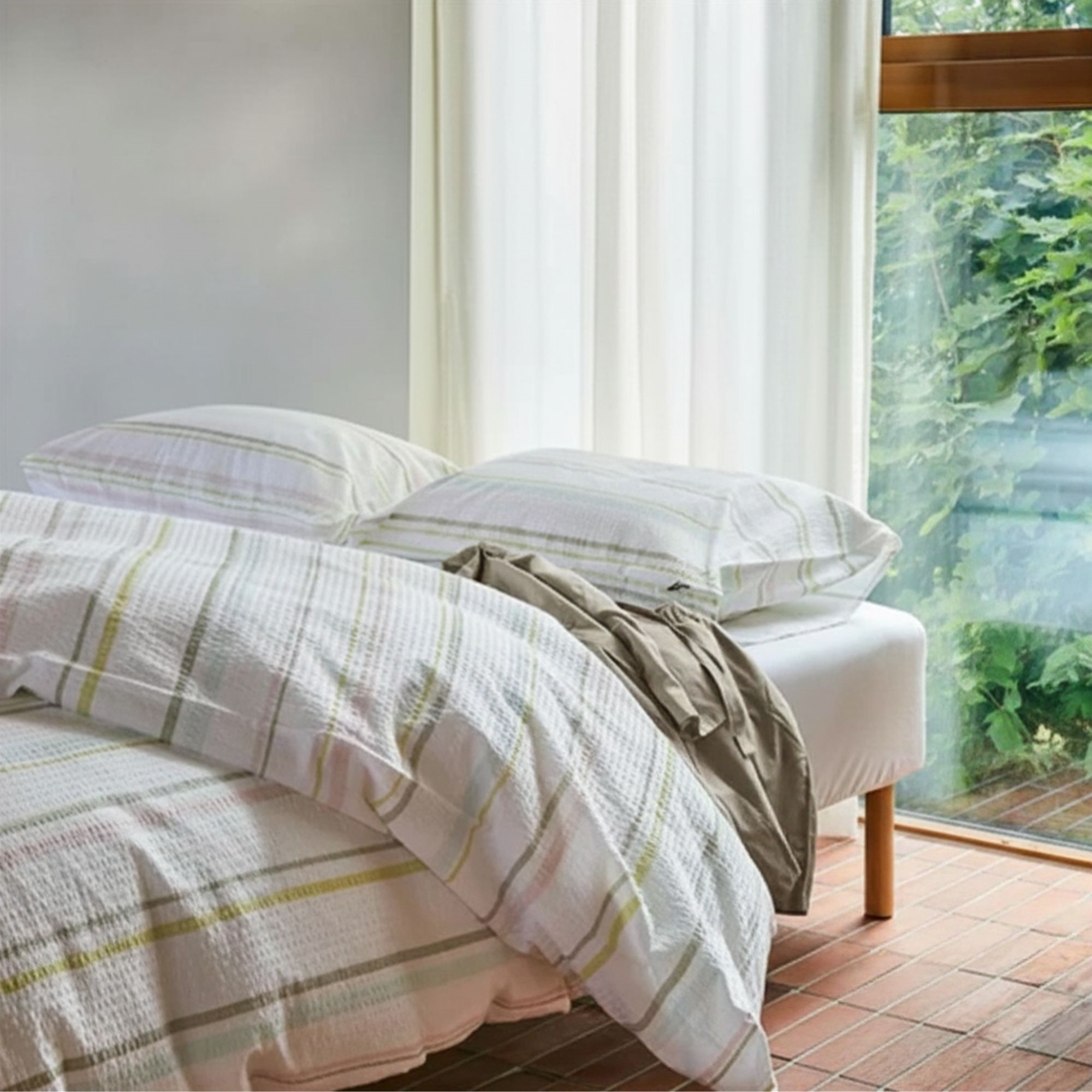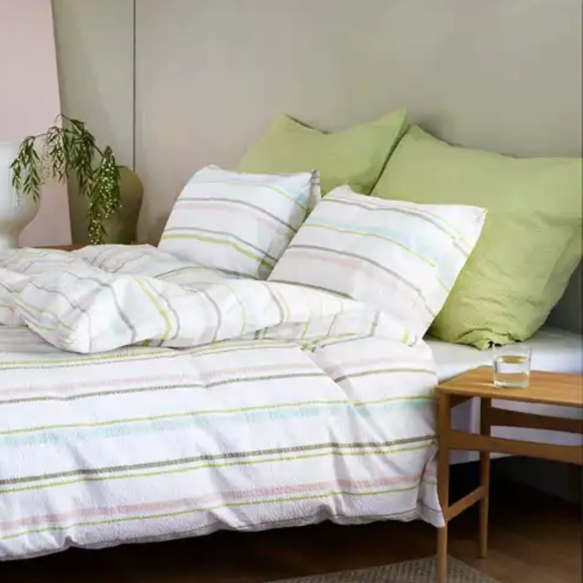 Home » Bedding » Single bedding » Single bedding 140x200 cm Seersucker bedding 140x200 cm - Seersucker bedding - Høie Of Scandinavia - Minna Multi Save41% Høie Of Scandinavia 81,9947,99EURSave 34,- In stock Select size Select a variant Quantity Add to basket See more from: Høie Of Scandinavia Item number: 8093-1 Read our bedding guide See our large selection of sheets Do you have questions about the product? Seersucker weave with a waffle textureFeels airy and cool against the skinIdeal for those who get hot at night Duvet cover: 140x200 cm Pillowcase: 1 pc. 60x63 cm Material: 100% cotton crepe Weave: 200TC seersucker (Thread count = number of threads per square inch) Colour: Multi Design: Minna Multi Brand: Høie of Scandinavia Closure: Duvet cover with zipper, pillowcase with envelope closure Washing: 60°C Tumble dry: Yes Ironing: Yes Certification: STANDARD 100 by OEKO-TEX® (19.HIN.85821). Your guarantee that the product is free from harmful chemicals. Striped bedding in crepe from Høie Enjoy a light, airy and comfortable night’s sleep with seersucker in 100% cotton. This particular weave — also known as cotton crepe or crepe bedding — creates the characteristic wavy and slightly crinkled texture that gives the bedding its airy appearance and cool comfort. The seersucker weave forms small air pockets in the fabric, making the bedding extra breathable and easy to sleep in. The surface feels cooler against the skin than traditional smooth bedding and is therefore especially suitable for warm nights or for those who often get hot while sleeping. At the same time, the cotton retains its natural softness and moisture-absorbing ability, giving you a comfortable and dry sleeping experience. The bedding has a thread count of 200TC, which ensures a good balance between durability, comfort and softness. The waffle texture means the bedding does not need to be ironed to look neat — the characteristic appearance is a natural part of the design. The bedding is OEKO-TEX® certified according to STANDARD 100, which means it has been tested and is free from harmful chemicals. It can be washed at 60 degrees and tolerates both tumble drying and ironing See all our seersucker bedding here Høie Of Scandinavia Høie of Scandinavia is a well-known Scandinavian textile brand that has a long history since 1850, especially within bedding, duvets and pillows. Høie is known for high quality, timeless design and comfort — which is reflected in their Nordic style and functionality. Høie combines traditional craftsmanship with modern production and materials to create products that are both comfortable to sleep in and durable in everyday use. See the full Høie range here Return to Single bedding 140x200 cm Customers also bought Bedding 140x200 cm - 100% cotton - Blue with dark blue checks In stock 68,4923,49EUR Add to basket Bedding 140x200 cm - Stonewashed - Firm grey In stock 68,4927,49EUR Add to basket Bed linen 140x200 cm - Seersucker bedding - 100% cotton crepe - White solid In stock 81,9934,49EUR Add to basket Favourite Musk-down duvet - All-season duvet - The Favorite - 140x200 cm - Best musk-down duvet offer In stock 408,49136,49EUR Add to basket Bed linen 140x200 cm - Microfiber - Solid dark blue In stock 34,4913,99EUR Add to basket Woven crepe bedding 140x200 cm - White bedding set with flowers - 100% soft cotton - Seersucker bedding - Fiona Høie Of Scandinavia Few in stock 81,9947,99EUR Add to basket Bed Skirt 180x200 cm - 100% Soft Cotton Sheet - White Bed Skirt by Nordstrand Home In stock 81,9940,99EUR Add to basket Fiber duvet - All-season duvet - 140x200 cm - Microfiber duvet - Borg Living In stock 81,9927,49EUR Add to basket Orchid Egyptian cotton towel - 100% Egyptian cotton - Bath towel 70x140cm - Orchid - Anthracite gray In stock 54,4927,49EUR Add to basket Stretch fitted sheet 120x200 cm - Dark blue jersey sheet - 100% Cotton - Fitted sheet for mattress In stock 40,9923,49EUR Add to basket