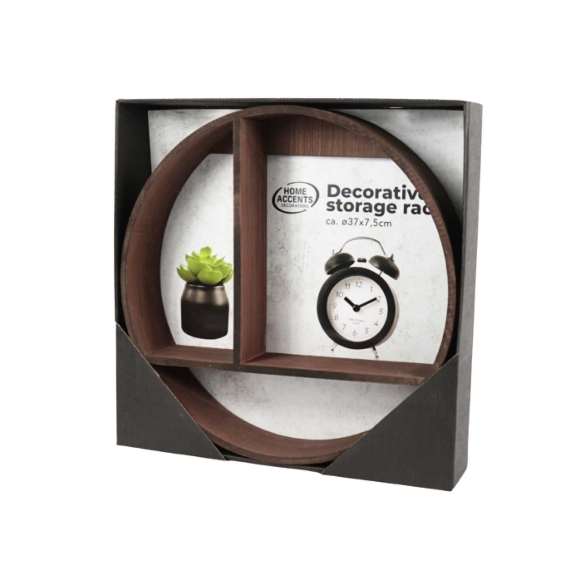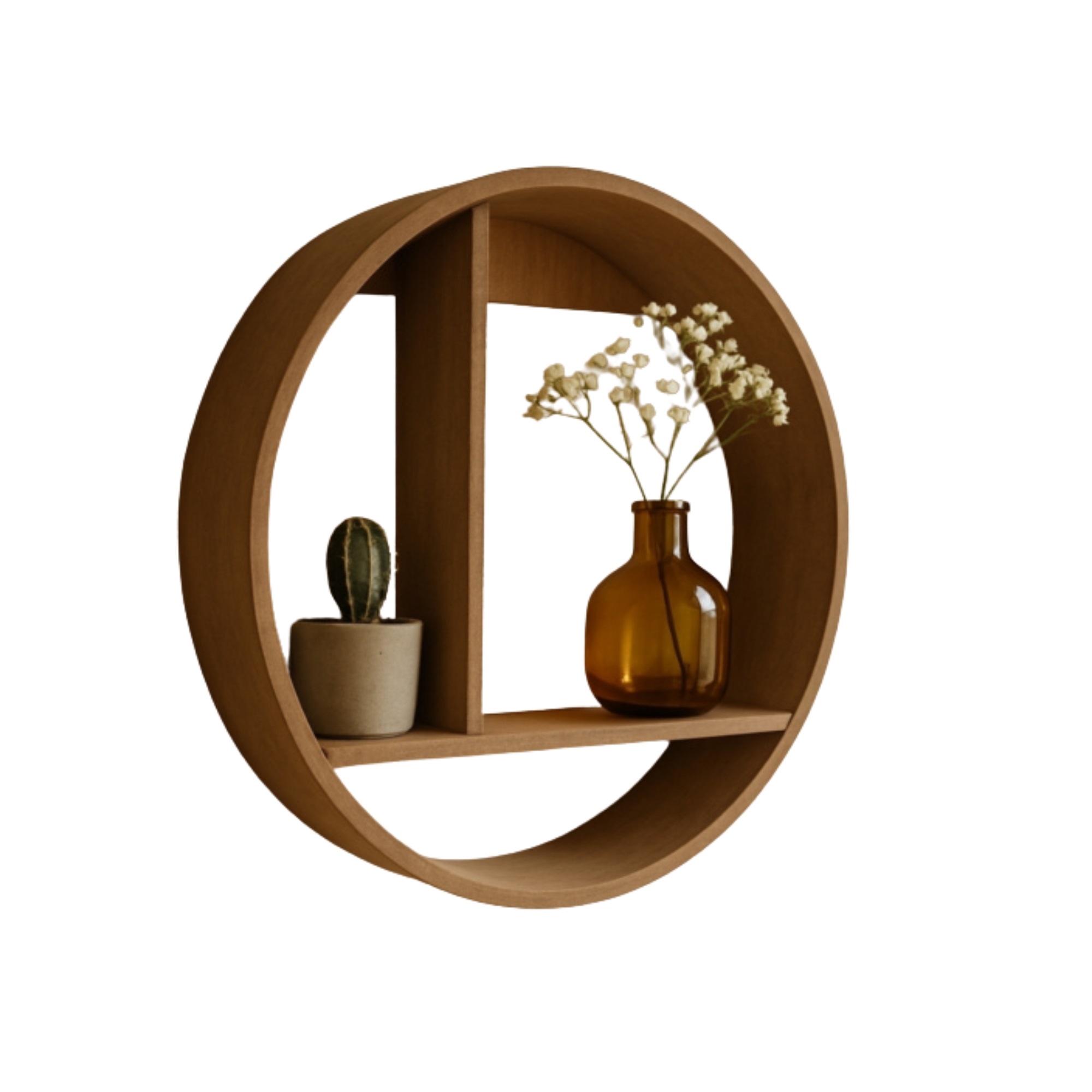 Home » Interior Design » Decorations » Shelves Shelf - Round wall shelf Ø37 cm - Dark brown wood Save66% HOME-TEX 40,9913,99EURSave 27,- In stock Quantity Add to basket See more from: HOME-TEX Item number: ME0966-M Do you have questions about the product? Elegant round wall shelf in a modern designIdeal for plants, pictures and small decorationsProduced in wood from responsibly managed forests Types: Shelf Material: Wood Dimensions: Ø37x7.5 cm Color: Dark brown Certification: FSC (C117418). Your guarantee that the wood was produced with respect for nature and under controlled conditions. Round wall shelf in dark brown wood - Ø37 cm Create a stylish and personal expression in your home with this round wooden wall shelf. With its modern and decorative design the shelf is both practical and attractive - perfect for showcasing your favorite items. The shelf is made of beautiful dark brown wood that adds warmth to the interior. The round shape combined with the divided compartments gives a Nordic and modern look that will fit perfectly in the living room, bedroom, hallway or kitchen. With a size of Ø37 cm and a depth of 7.5 cm the shelf is ideal for small decorations, plants, pictures or other personal items that deserve a nice place on the wall. The shelf is FSC-certified, which means that the wood comes from sustainably managed forestry - a responsible choice for both you and the environment. This wall shelf is not only practical storage but also a decorative detail that brings life and personality to the room. Perfect for those who want to combine functionality with modern home styling. See all home decor here. Return to Shelves